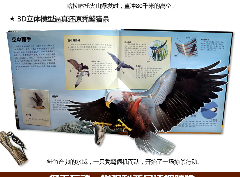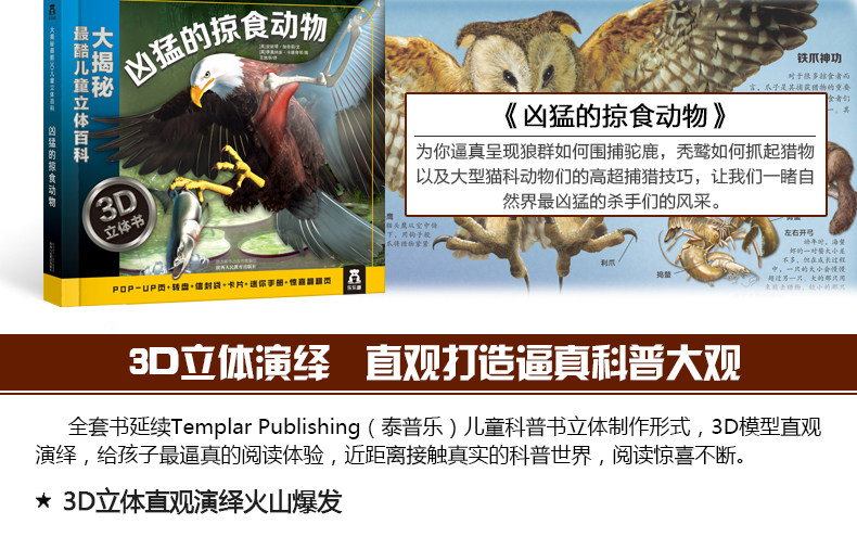 大揭秘 最酷3D儿童立体百科《凶猛的掠食动物》,带你去认识世界上最凶猛的掠食动物。丰富有趣的互动设计,逼真呈现狼群如何围捕驼鹿,秃鹫如何抓起猎物,以及大型猫科动物们的高超捕猎技巧,让我们一睹自然界最凶猛的杀手们的风采。