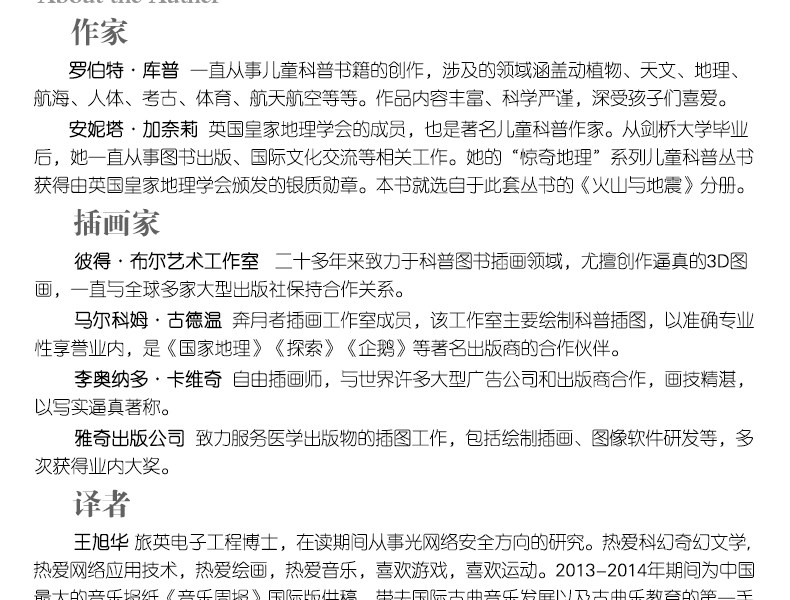 安妮塔·加奈莉 英国皇家地理学会的成员,也是著名儿童科普作家。从剑桥大学毕业后,她一直从事图书出版、国际文化交流等相关工作。她的“惊奇地理”系列儿童科普丛书,获得由英国皇家地理学会颁发的银质勋章。本书就选自于此套丛书的《火山与地震》分册。