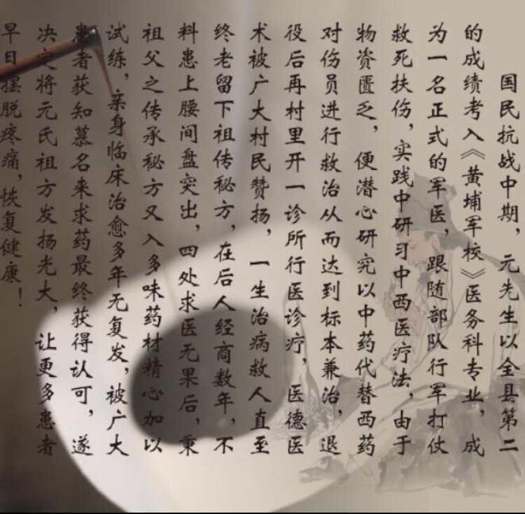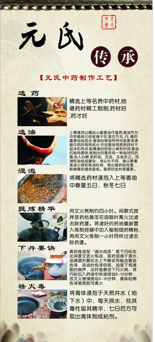 后来,元寿增老先生之子元乃泊先生经商数年,不料患上腰间盘突出,四处求医无果后,柄祖父传承之秘方又入多味药材加以试炼,亲身临床治愈无复发,被广大患者认可,立志将元氏祖方、中医文化发扬光大,让更多患者解除病痛。