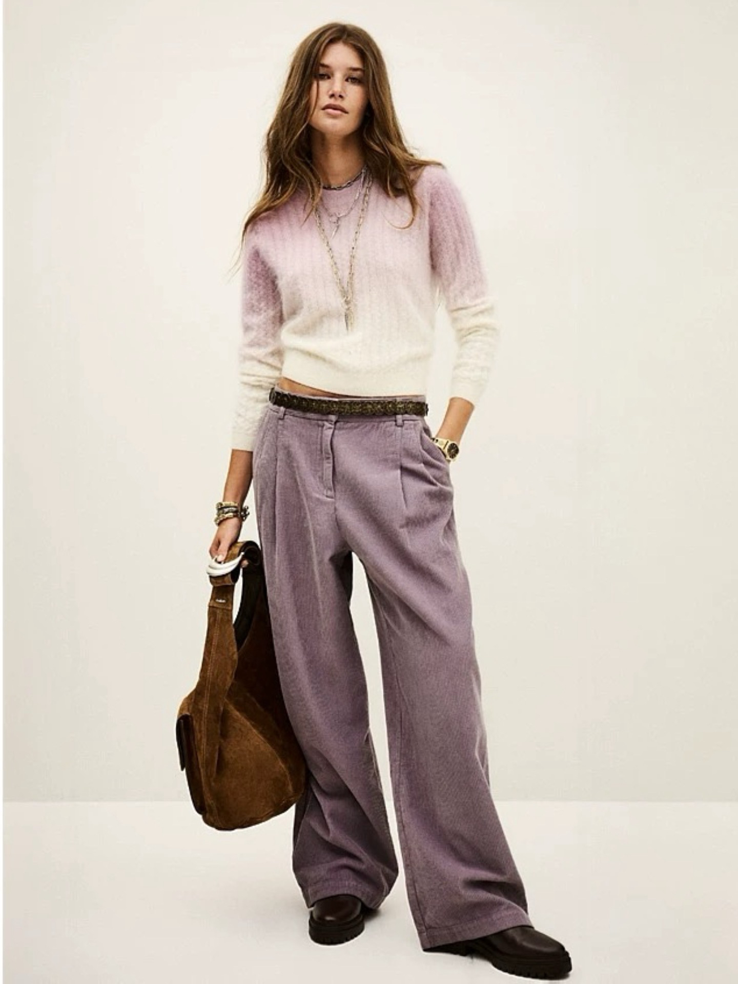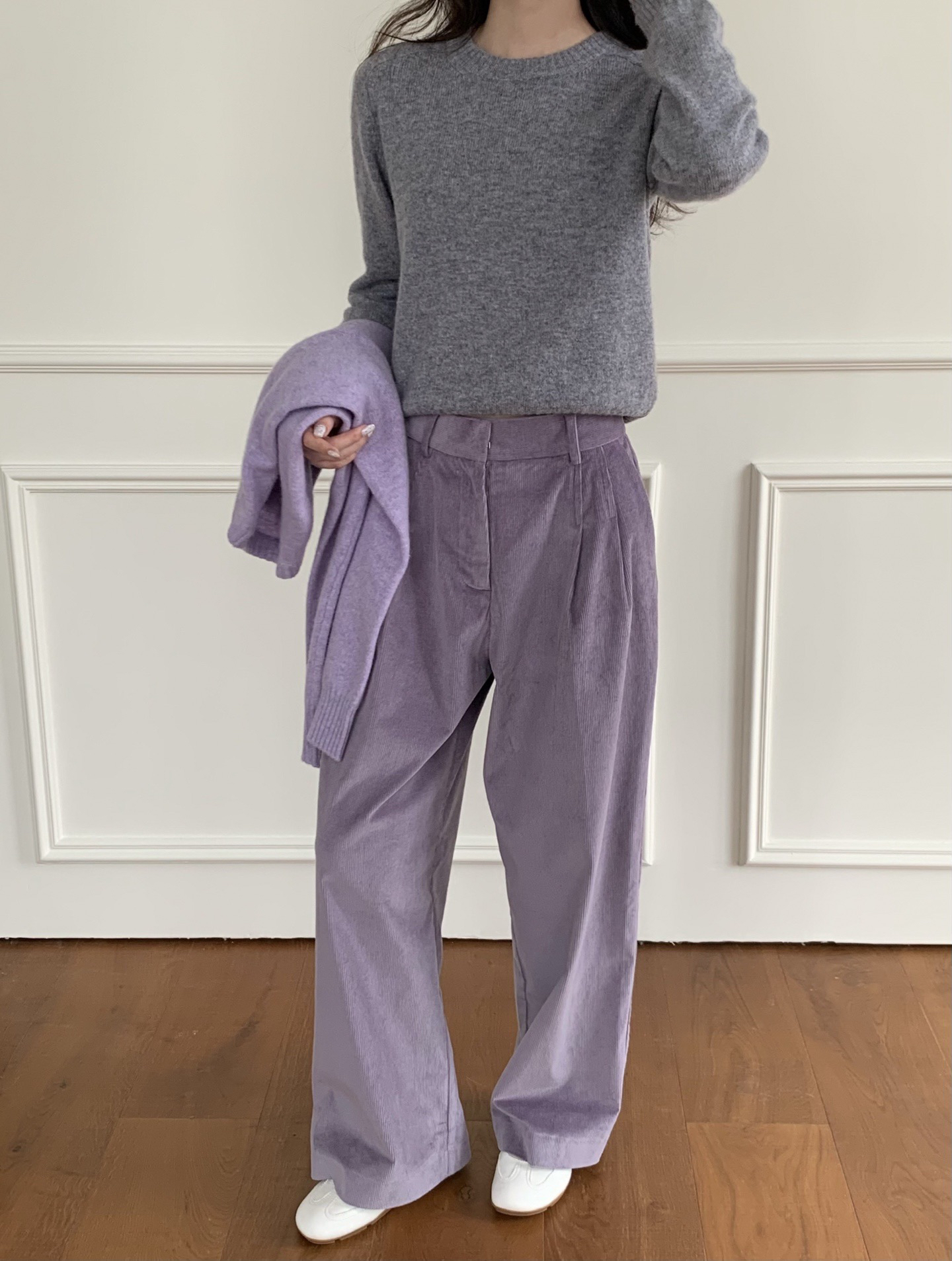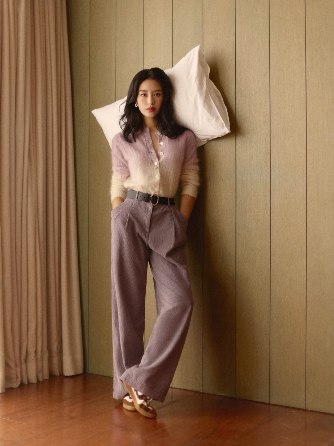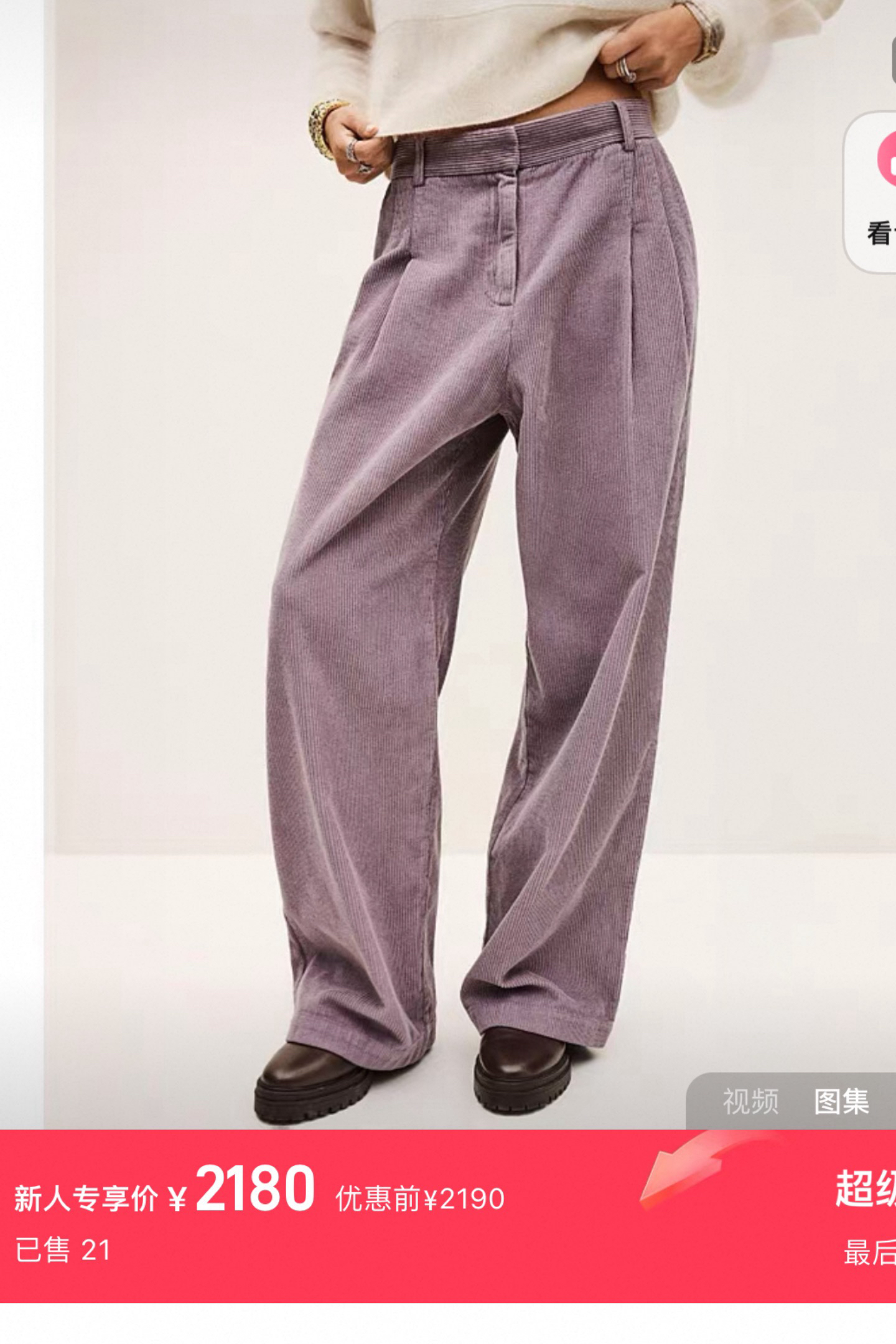 杨采钰法国𝐁𝐒灯芯绒紫色宽松收褶直筒阔腿裤