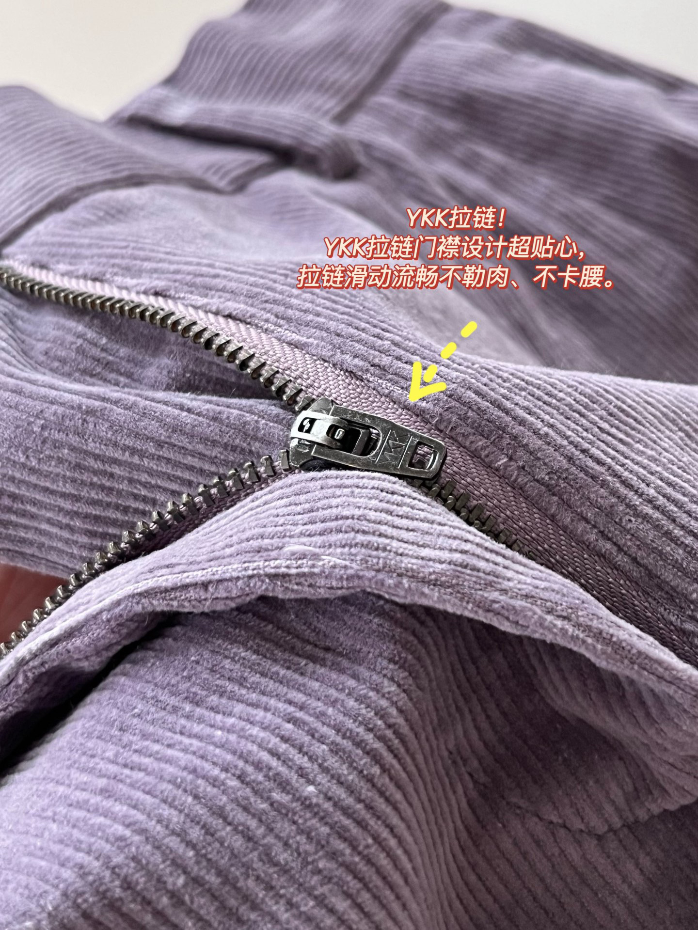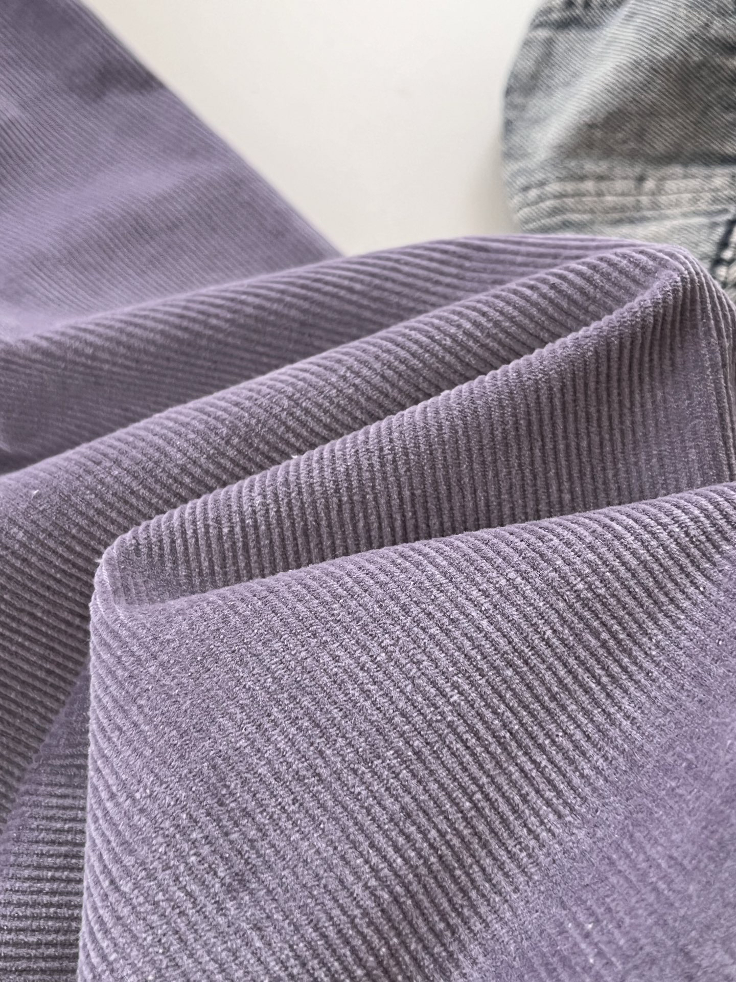 灯芯绒面料,舒适和温暖,密集的纵向绒条柔软顺滑有质感,挺括不易皱、保温性也好,秋冬穿着超温暖、同时厚实的结构,经得起日常“折腾”、耐磨抗造。手感弹滑柔软、绒条清晰圆润、绒毛耐磨,质地厚实,