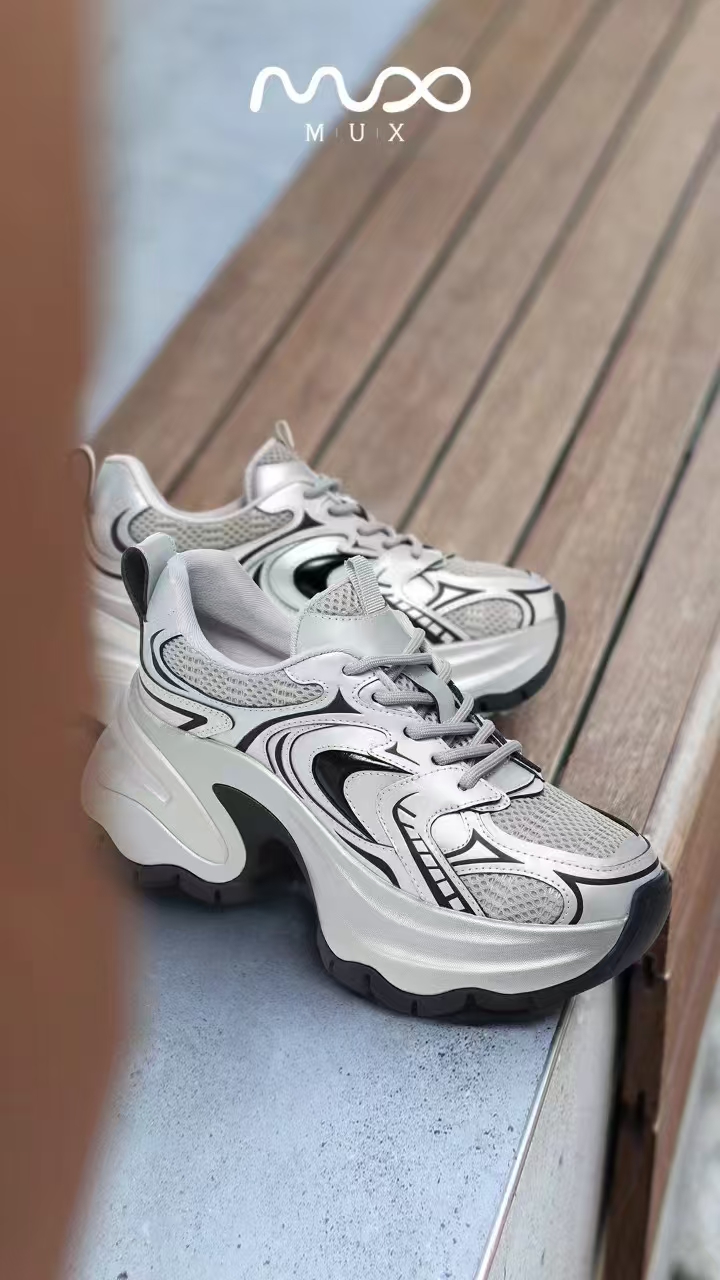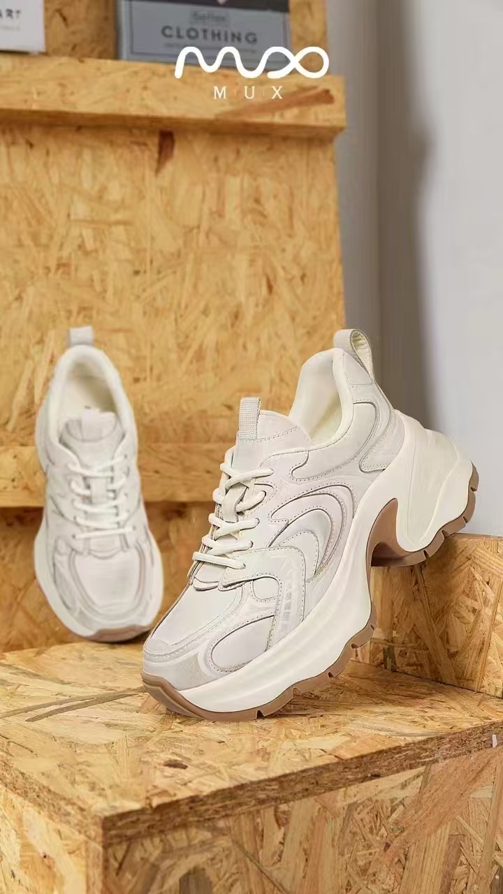 MUX迈思2025时尚百搭老爹鞋小白拼接女牛皮厚底