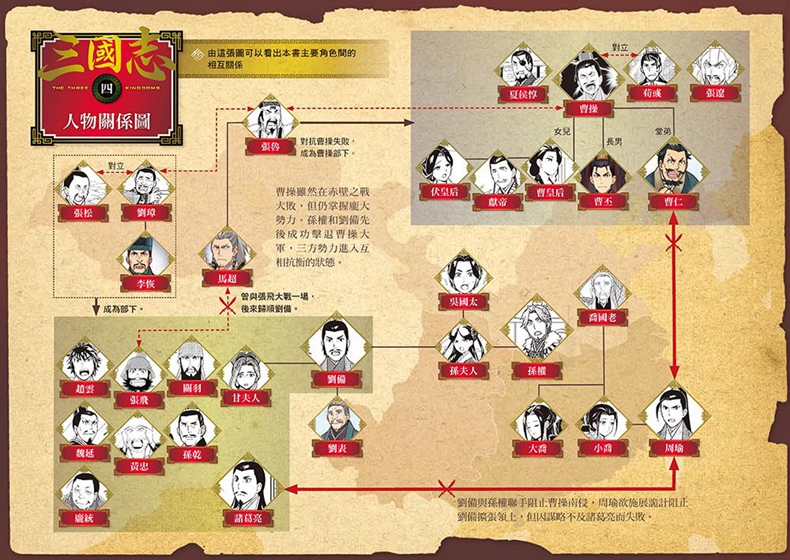 特色3:書中收錄「人物關係圖」、「地圖」、「人物事典」、「名勝遺跡」、「成語典故」等,將三國故事與歷史、地理、人物生平和背景資訊做連結,並搭配文物和遺跡等照片解說,讓人彷彿置身三國百寶庫,透澈無礙的窺見三國全貌。