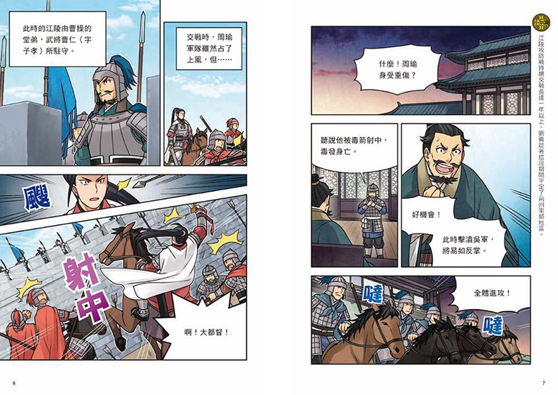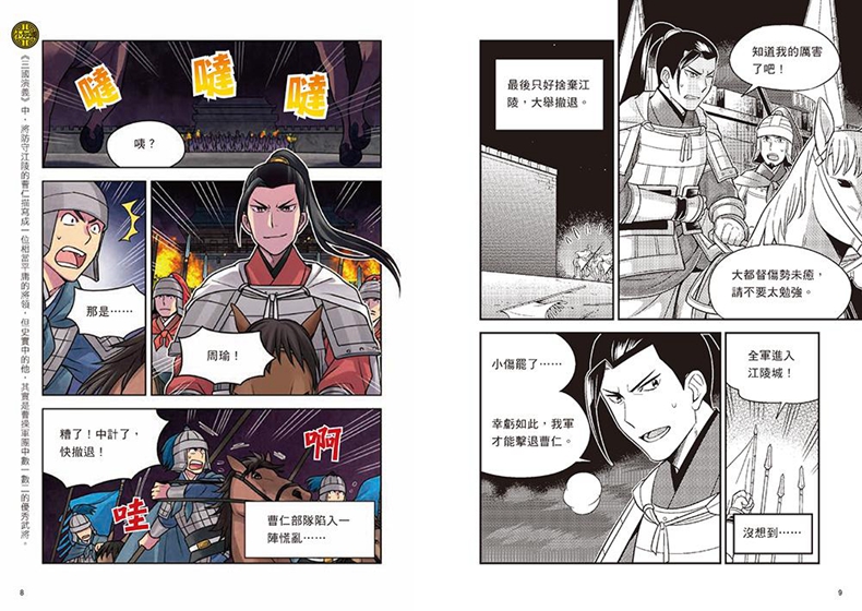 特色1:精采漫畫重現自東漢末年黃巾之亂起義,至曹操的魏、劉備的蜀、孫權的吳三強鼎立,到最終司馬氏統一天下,建立晉朝,這將近100年間,英雄們馳騁戰場、征戰不斷,謀士間鬥智鬥力、突破僵局的歷史故事。針對艱深字詞與史實真相,隨頁附有補充注釋與歷史人文知識提點,幫助讀者通盤了解並澄清史實。