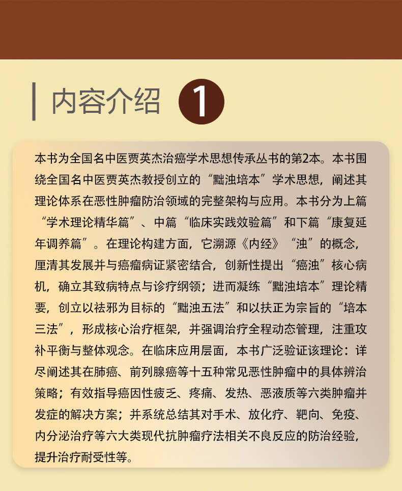 本书为全国名中医贾英杰治癌学术思想传承丛书的第2本。本书围绕全国名中医贾英杰教授创立的“黜浊培本”学术思想,阐述其理论体系在恶性肿瘤防治领域的完整架构与应用。本书分为上篇“学术理论精华篇”、中篇“临床实践效验篇”和下篇“康复延年调养篇”。在理论构建方面,它溯源《内经》“浊”的概念,厘清其发展并与癌瘤病证紧密结合,创新性提出“癌浊”核心病机,确立其致病特点与诊疗纲领;进而凝练“黜浊培本”理论精要,创立以祛邪为目标的“黜浊五法”和以扶正为宗旨的“培本三法”,形成核心治疗框架,并强调治疗全程动态管理,注重攻补平衡与整体观念。在临床应用层面,本书广泛验证该理论:详尽阐述其在肺癌、前列腺癌等十五种常见恶性肿瘤中的具体辨治策略;有效指导癌因性疲乏、疼痛、发热、恶液质等六类肿瘤并发症的解决方案;并系统总结其对手术、放化疗、靶向、免疫、内分泌治疗等六大类现代抗肿瘤疗法相关不良反应的防治经验,提升治疗耐受性等。