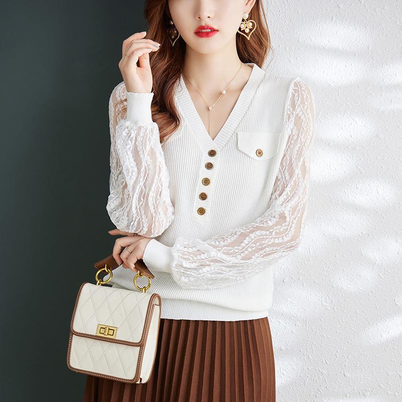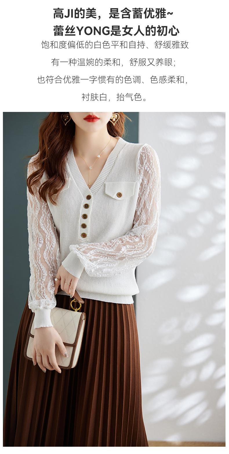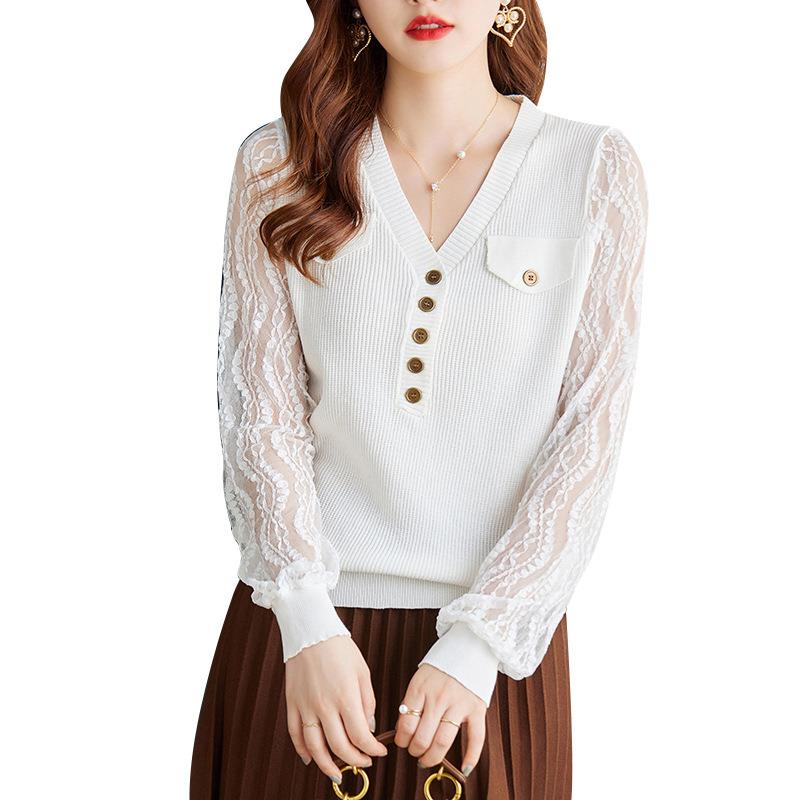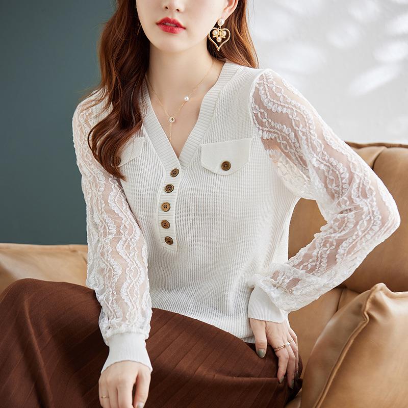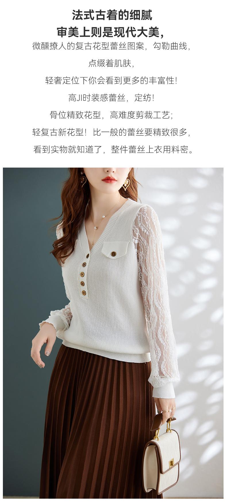 娜璐多 春秋新款设计感小众时尚气质内搭蕾丝拼接长袖针织衫百搭上衣女