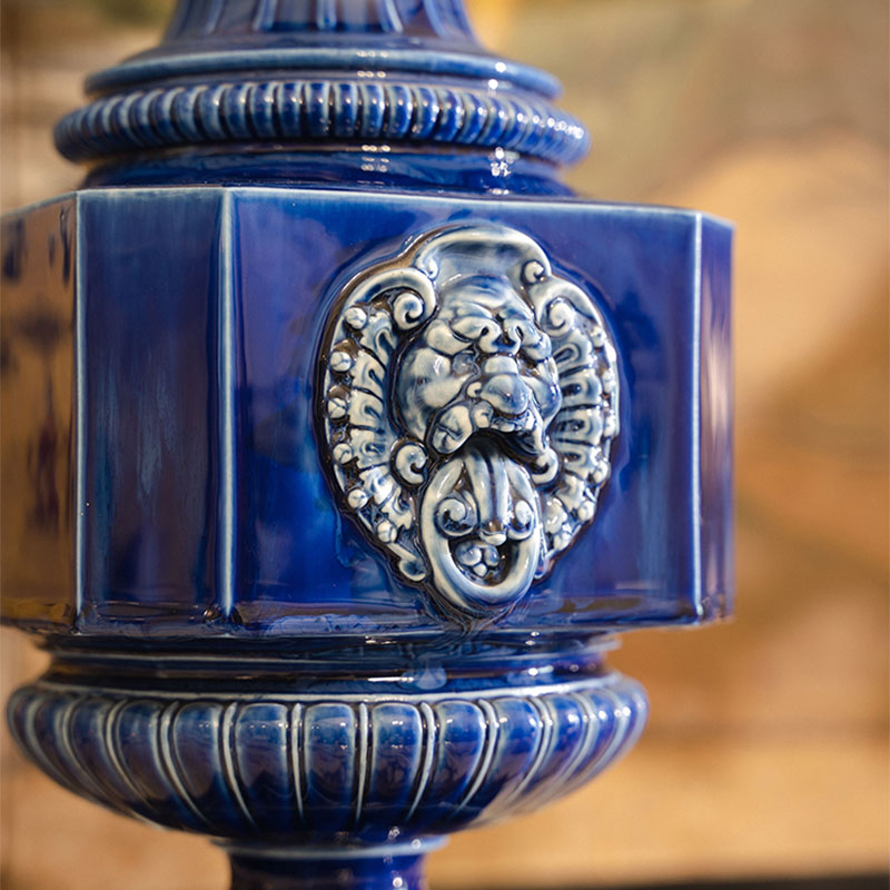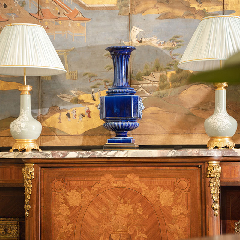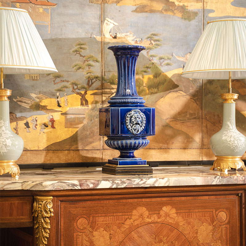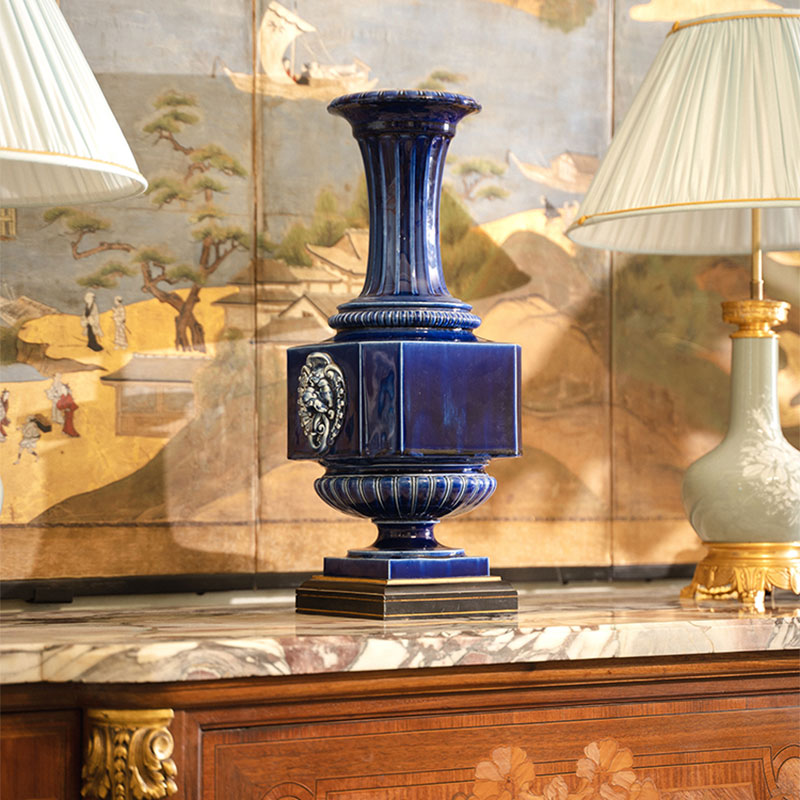 1886年代法国御窑出品东方风格霁蓝釉瑞兽衔环赏瓶