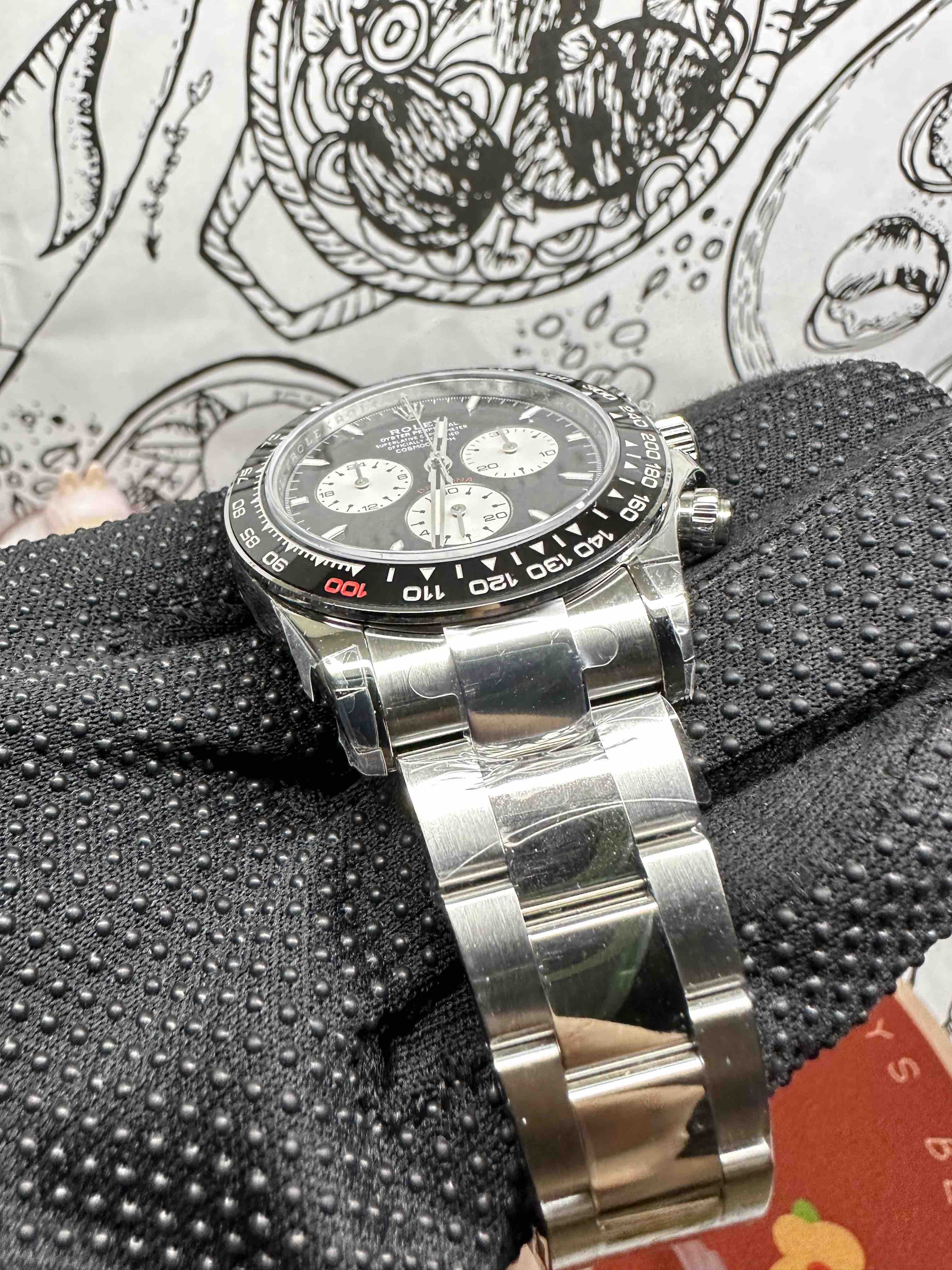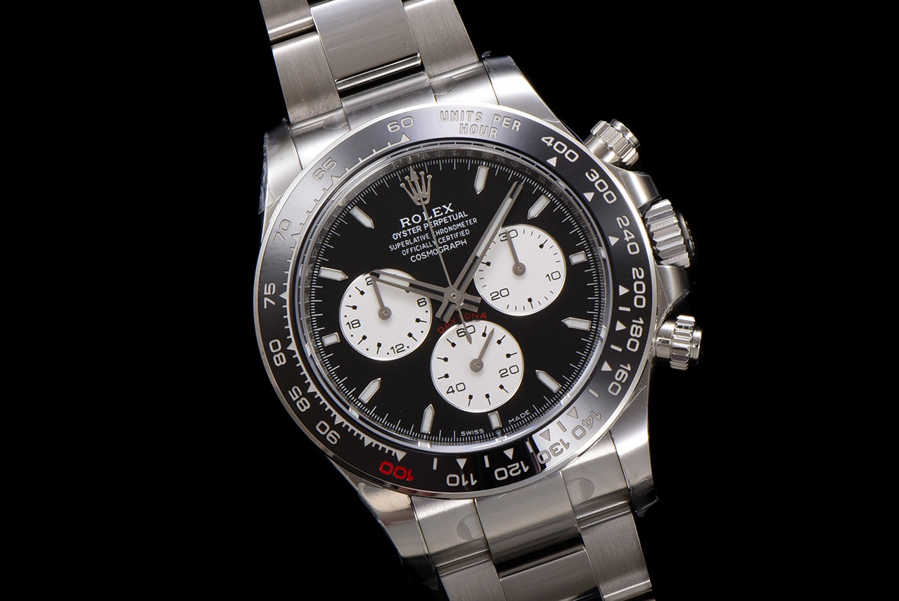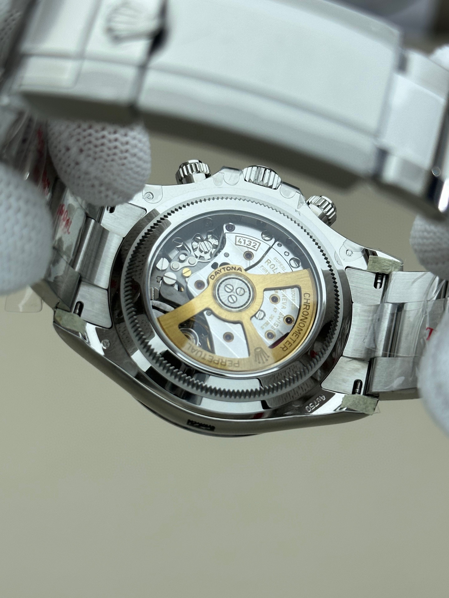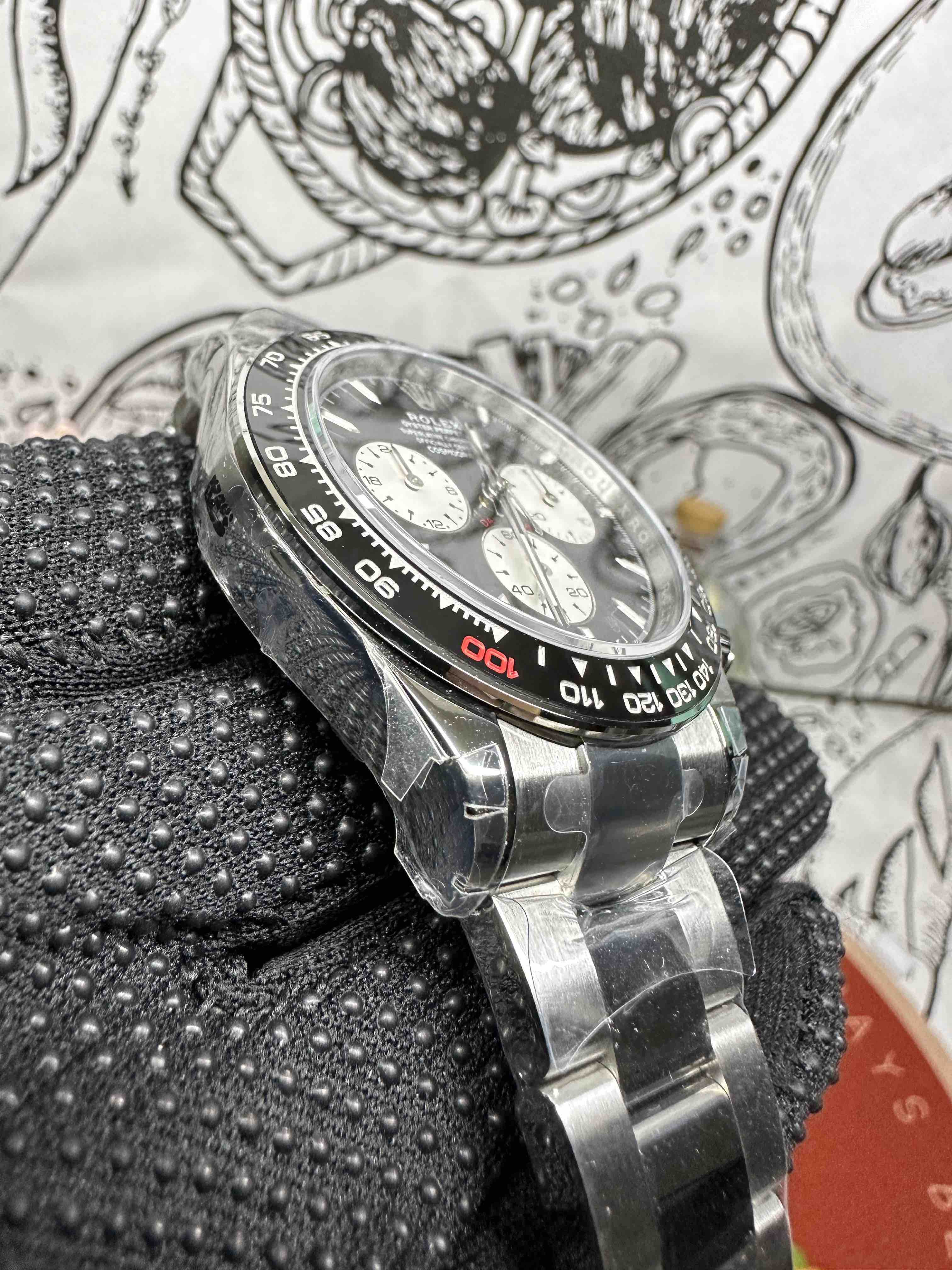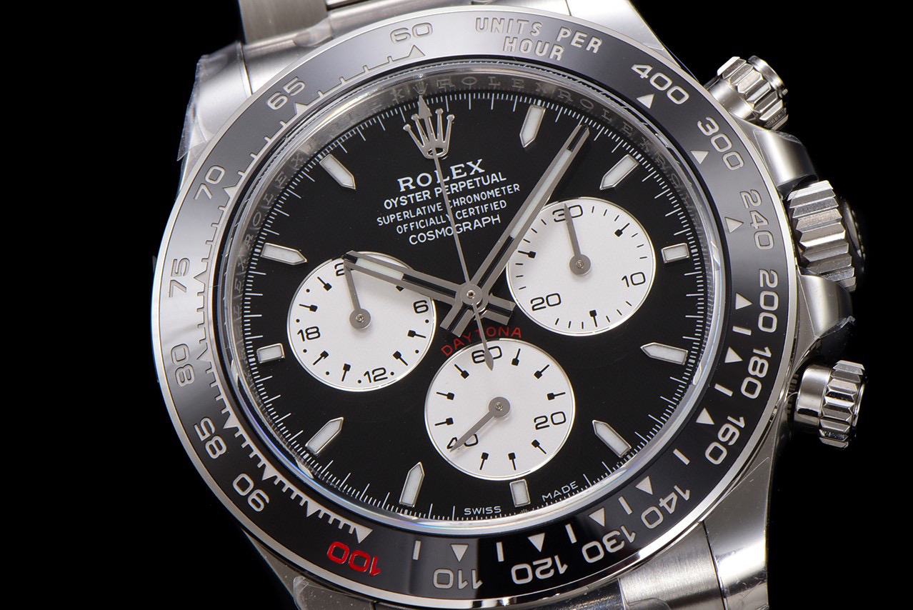 Stainless steel case and bracelet, foldable oyster style safety buckle with 5mm adjustable chain link extension system bottom. One piece black Cerachrom ceramic outer ring with 18K white gold border, equipped with a speedometer; The molded scale and numbers are coated with platinum using PVD (Physical Vapor Deposition) coating technology; Red ceramic number "100", screw in type, transparent bottom. Triple lock triple waterproof system. Scratch resistant blue crystal glass,. Equipped with CAL.4131 automatic mechanical timing movement, size: 40mm.🔥🔥🔥CLEAN/C厂 126519迪通拿 "小勒芒"出货