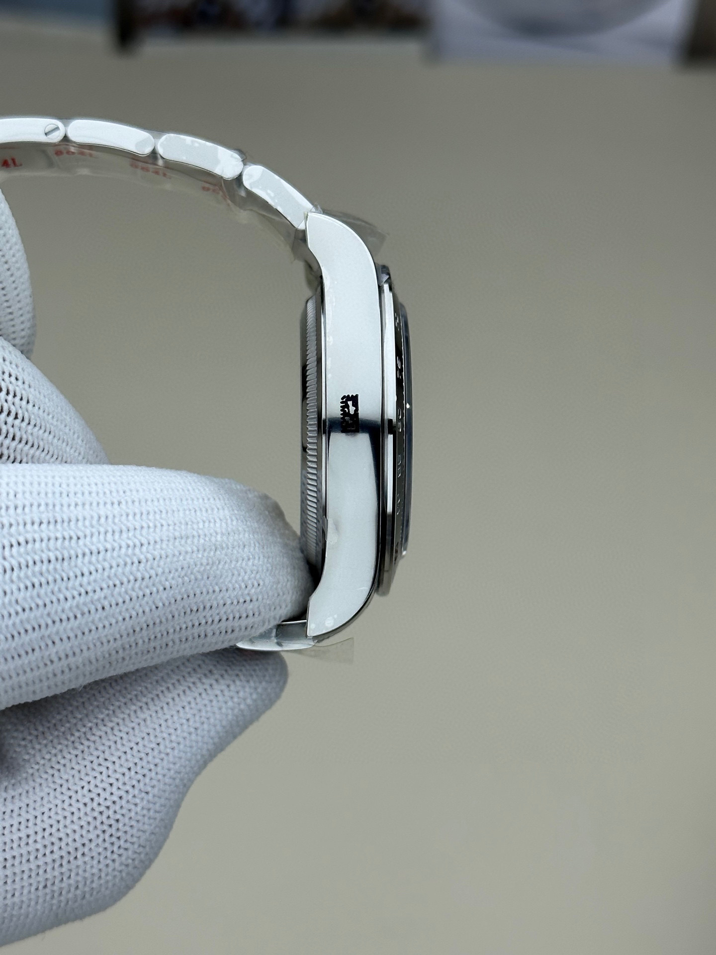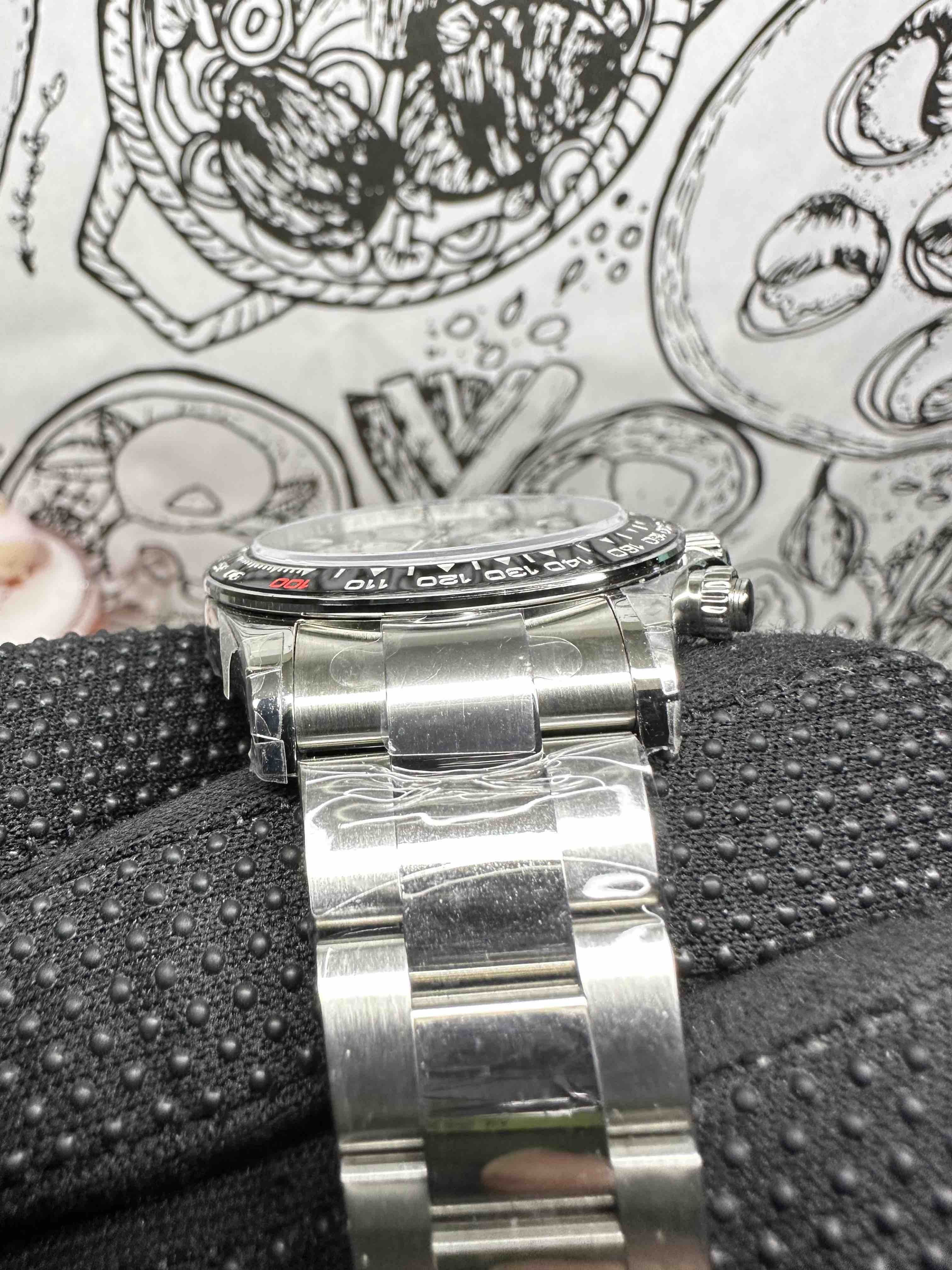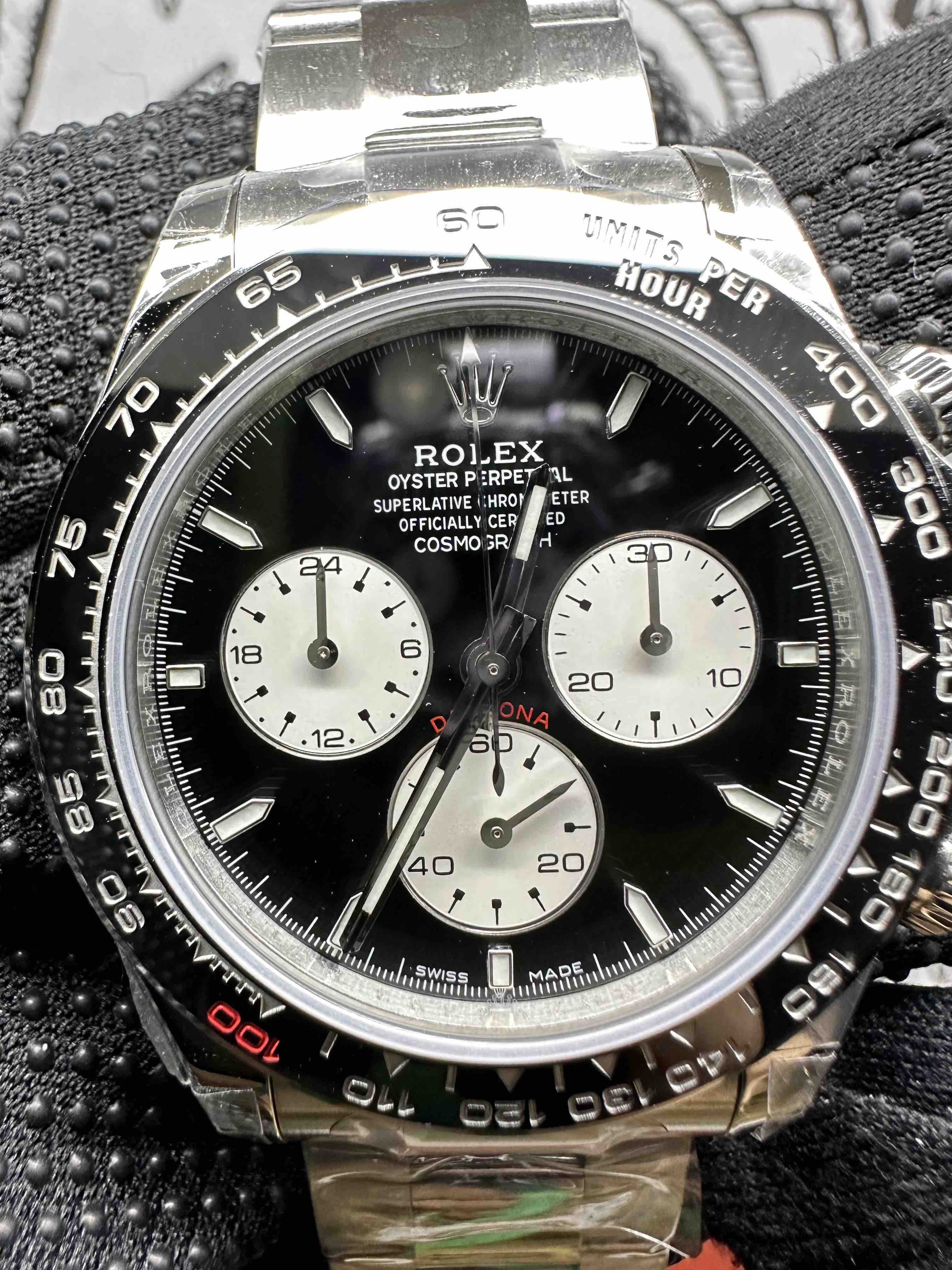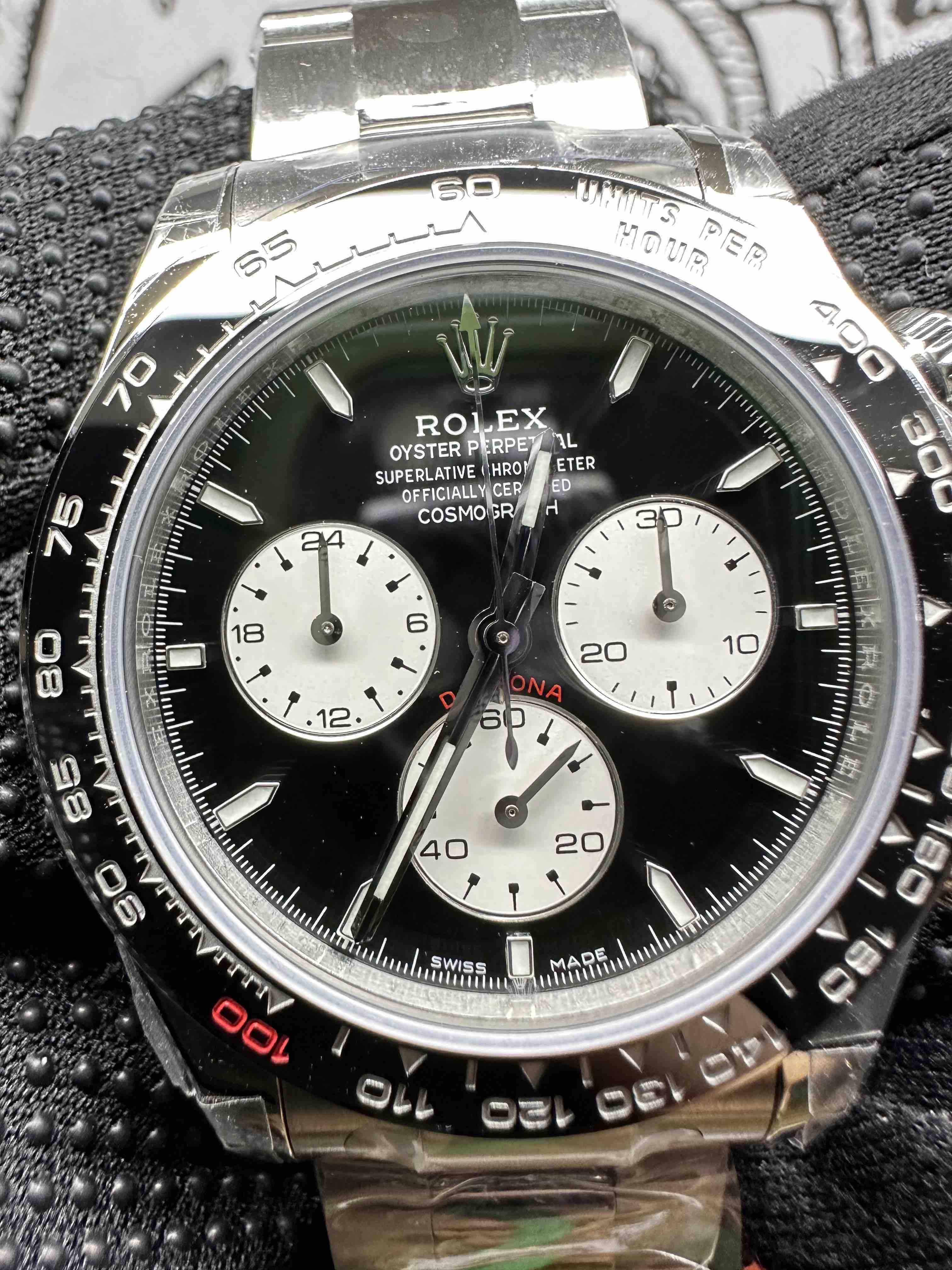 Stainless steel case and bracelet, foldable oyster style safety buckle with 5mm adjustable chain link extension system bottom. One piece black Cerachrom ceramic outer ring with 18K white gold border, equipped with a speedometer; The molded scale and numbers are coated with platinum using PVD (Physical Vapor Deposition) coating technology; Red ceramic number "100", screw in type, transparent bottom. Triple lock triple waterproof system. Scratch resistant blue crystal glass,. Equipped with CAL.4131 automatic mechanical timing movement, size: 40mm.🔥🔥🔥CLEAN/C厂 126519迪通拿 "小勒芒"出货