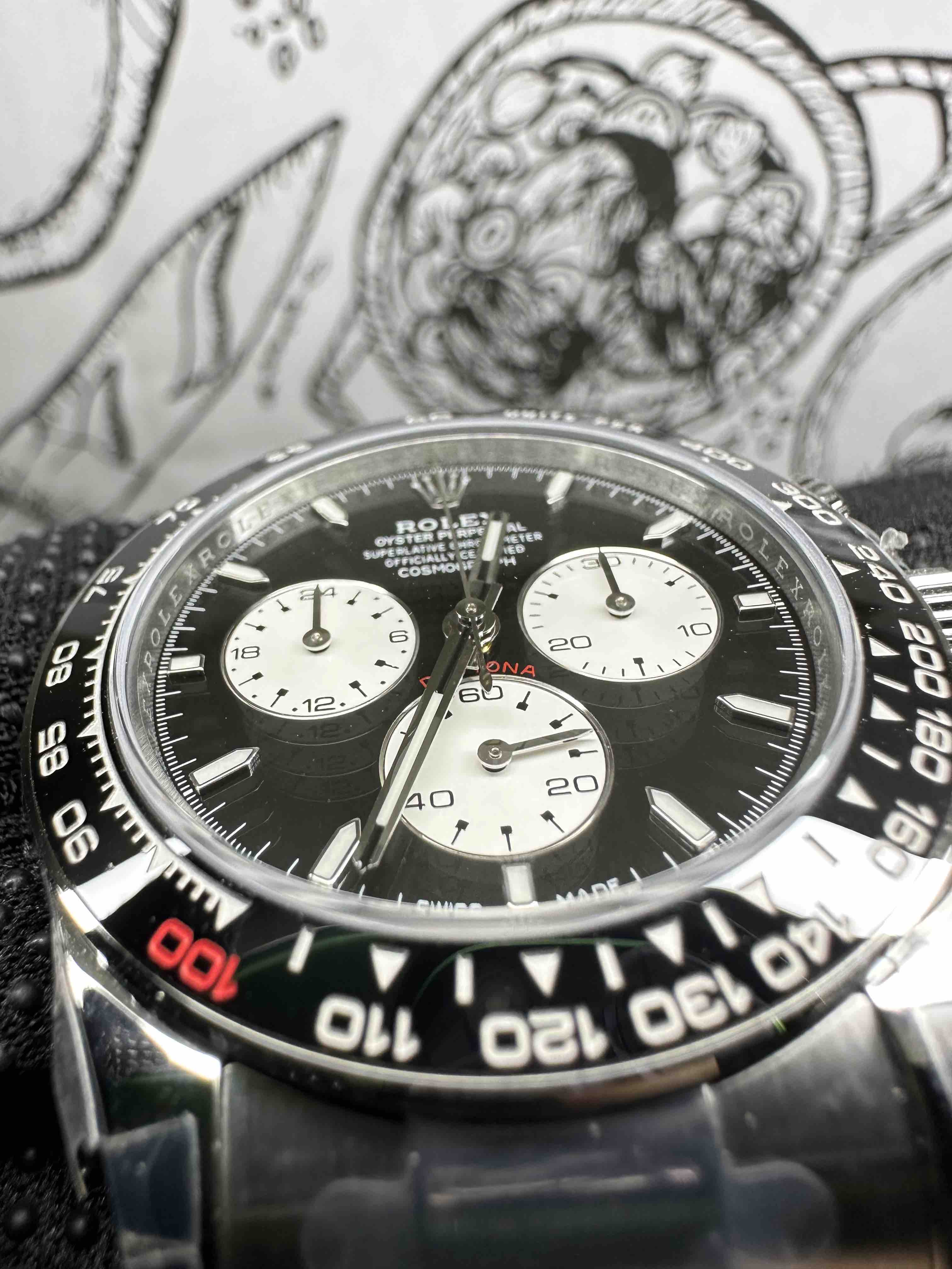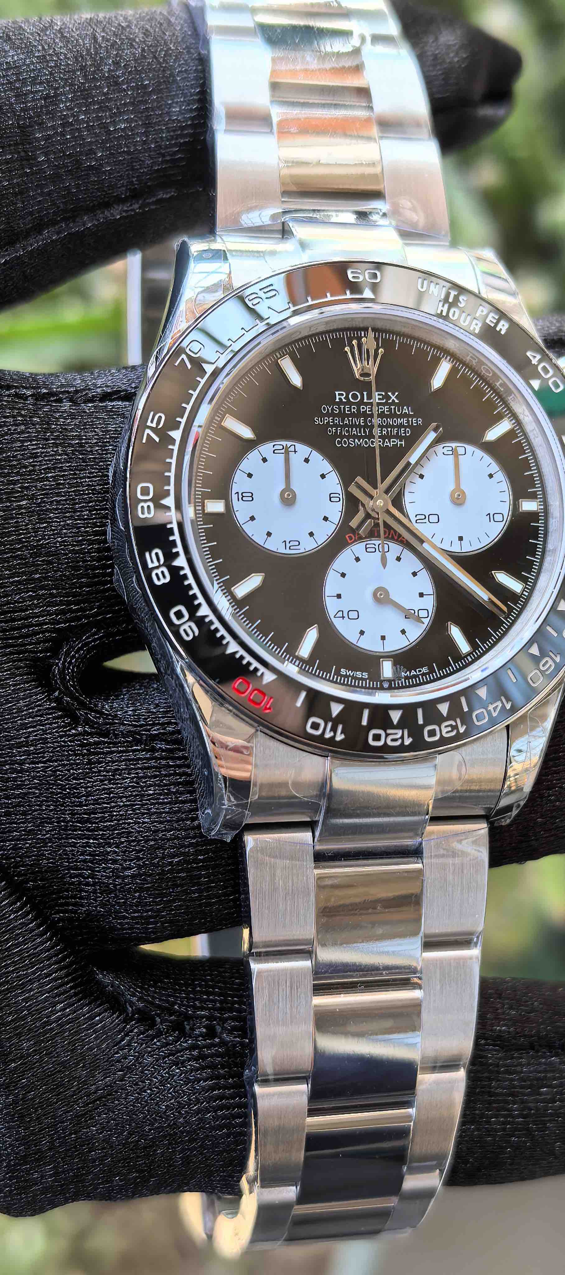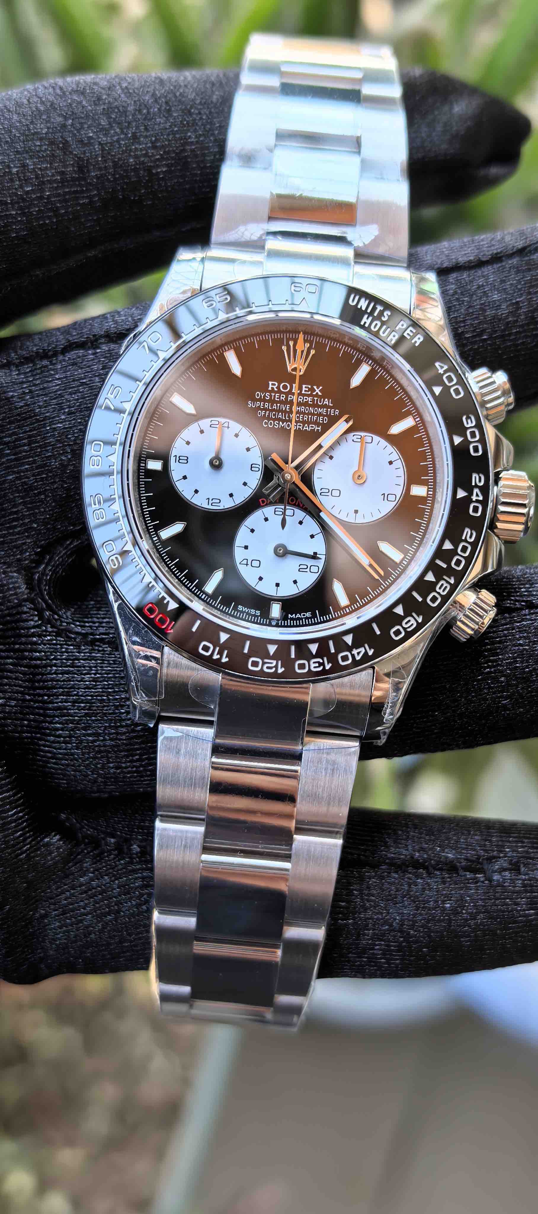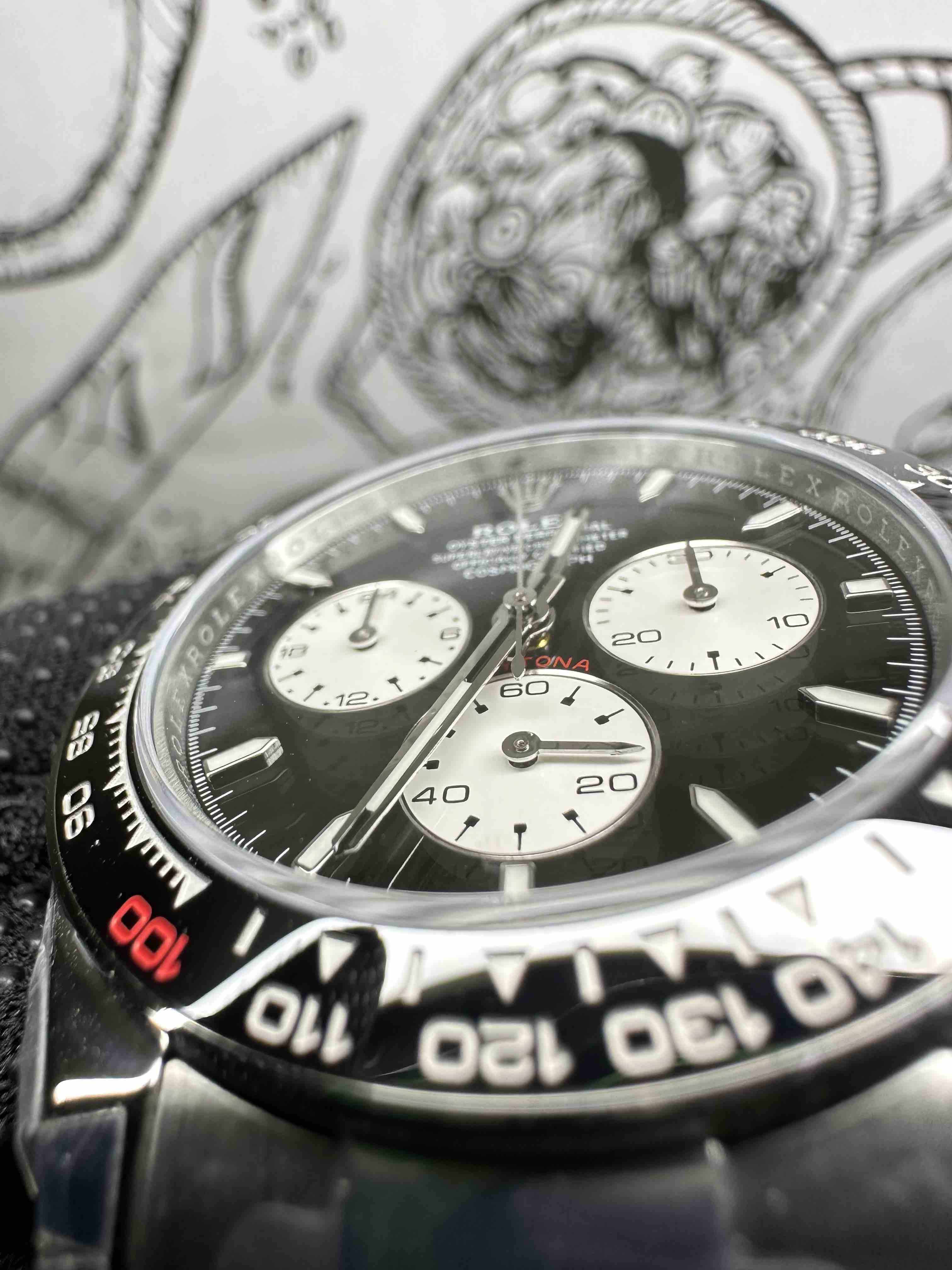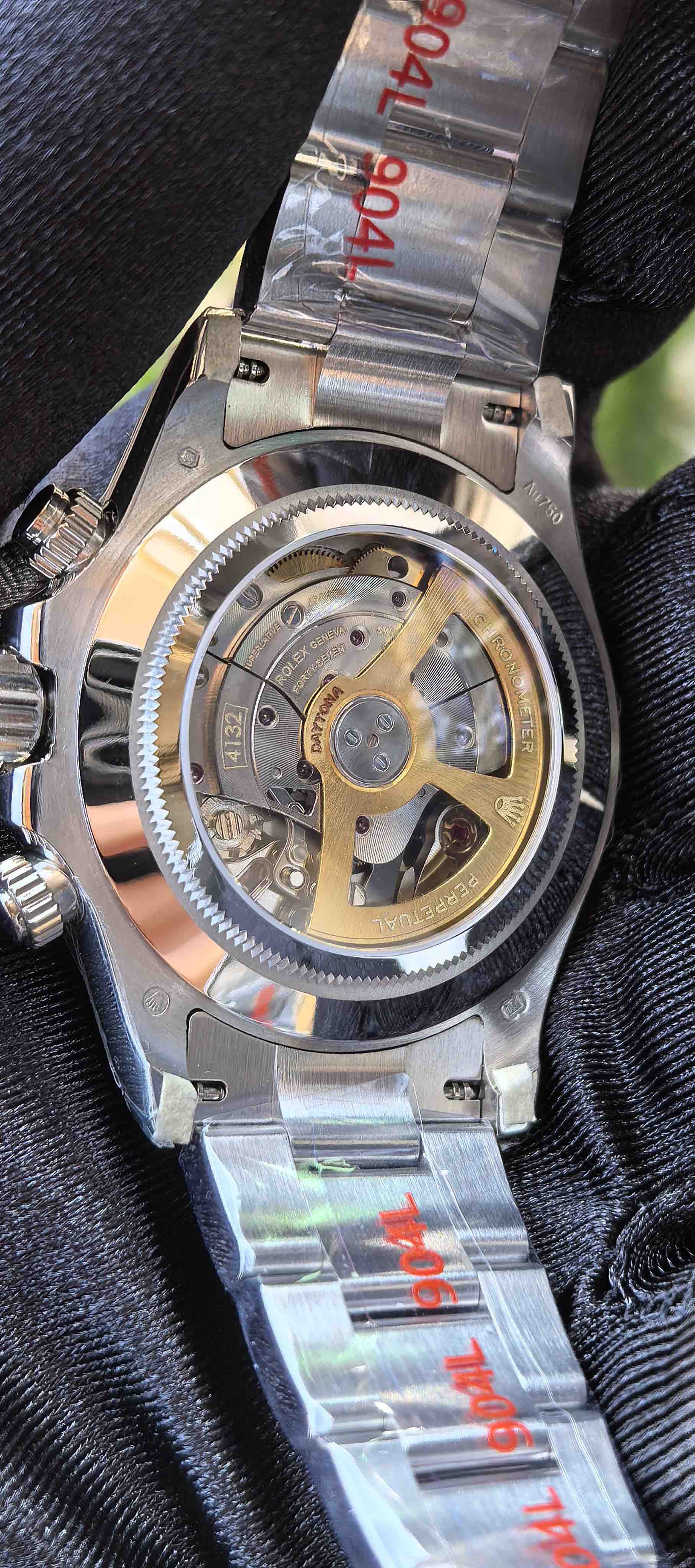 Stainless steel case and bracelet, foldable oyster style safety buckle with 5mm adjustable chain link extension system bottom. One piece black Cerachrom ceramic outer ring with 18K white gold border, equipped with a speedometer; The molded scale and numbers are coated with platinum using PVD (Physical Vapor Deposition) coating technology; Red ceramic number "100", screw in type, transparent bottom. Triple lock triple waterproof system. Scratch resistant blue crystal glass,. Equipped with CAL.4131 automatic mechanical timing movement, size: 40mm.🔥🔥🔥CLEAN/C厂 126519迪通拿 "小勒芒"出货