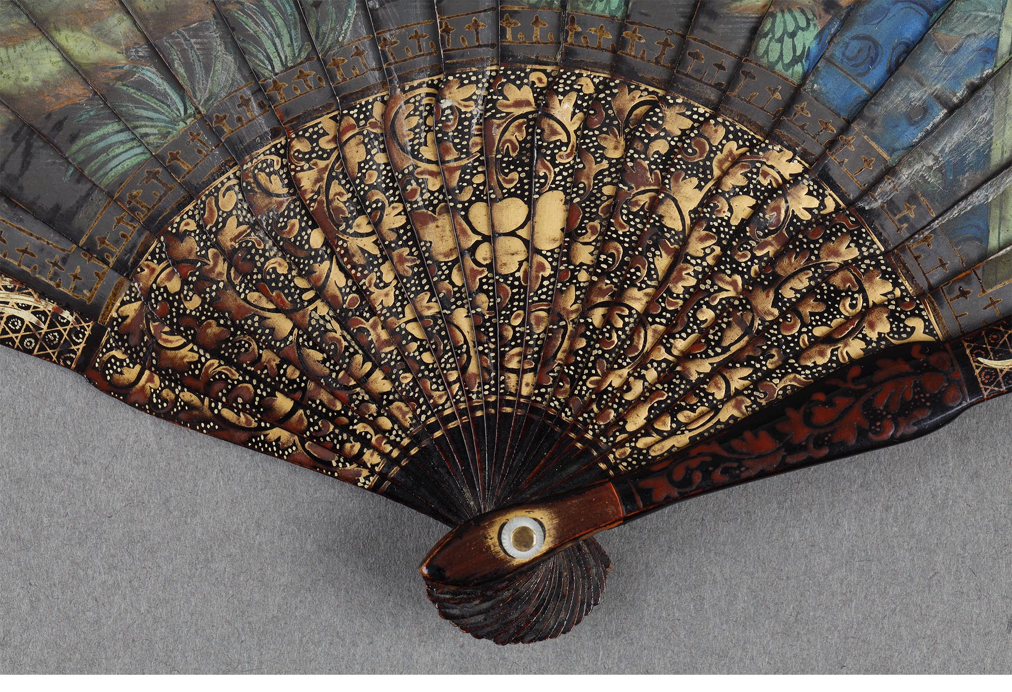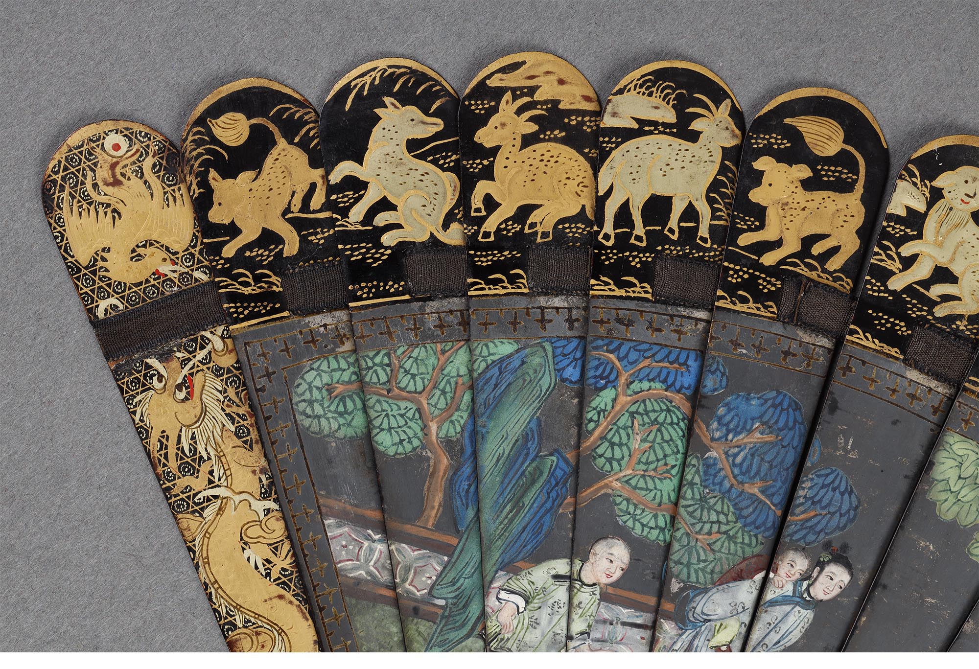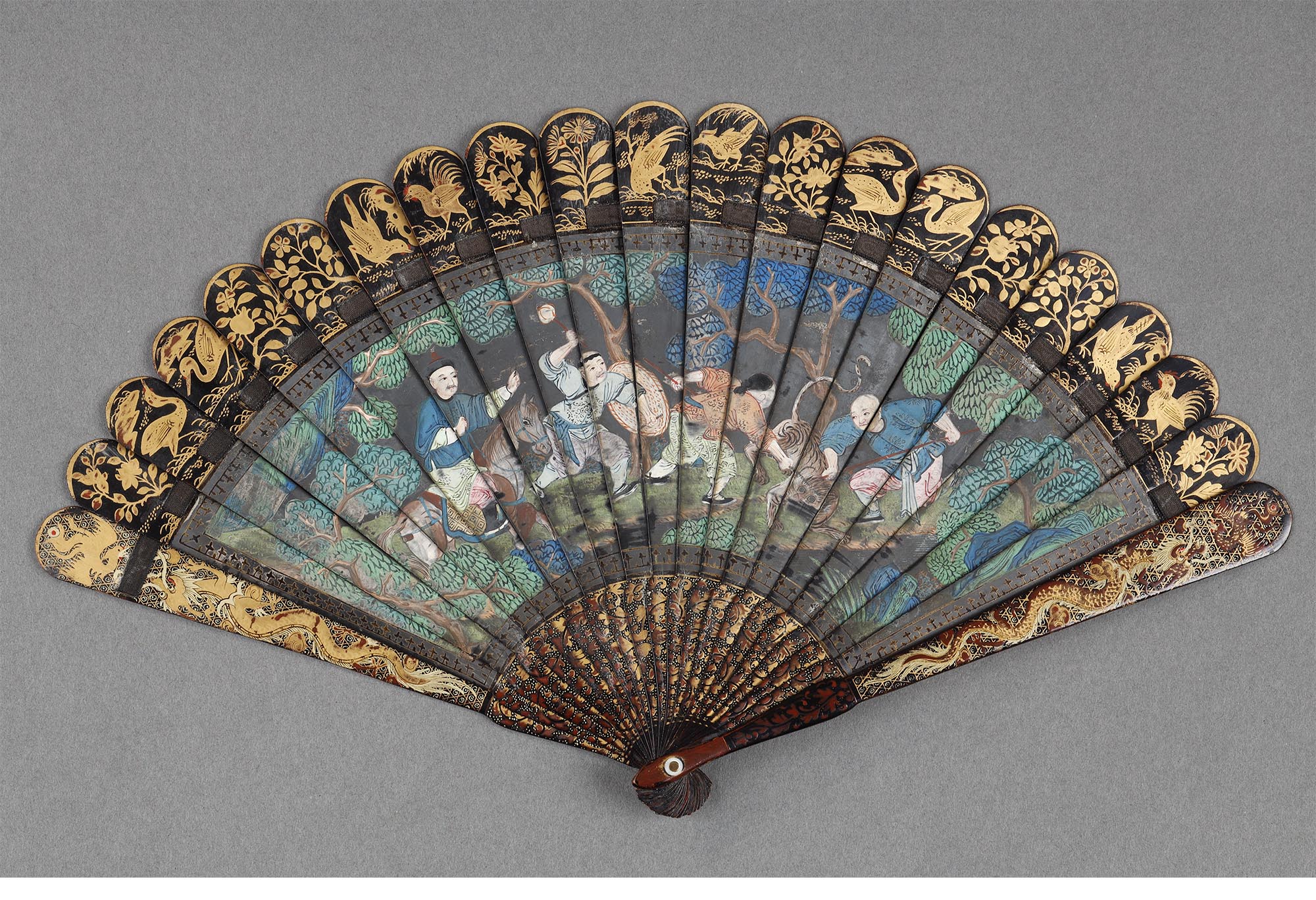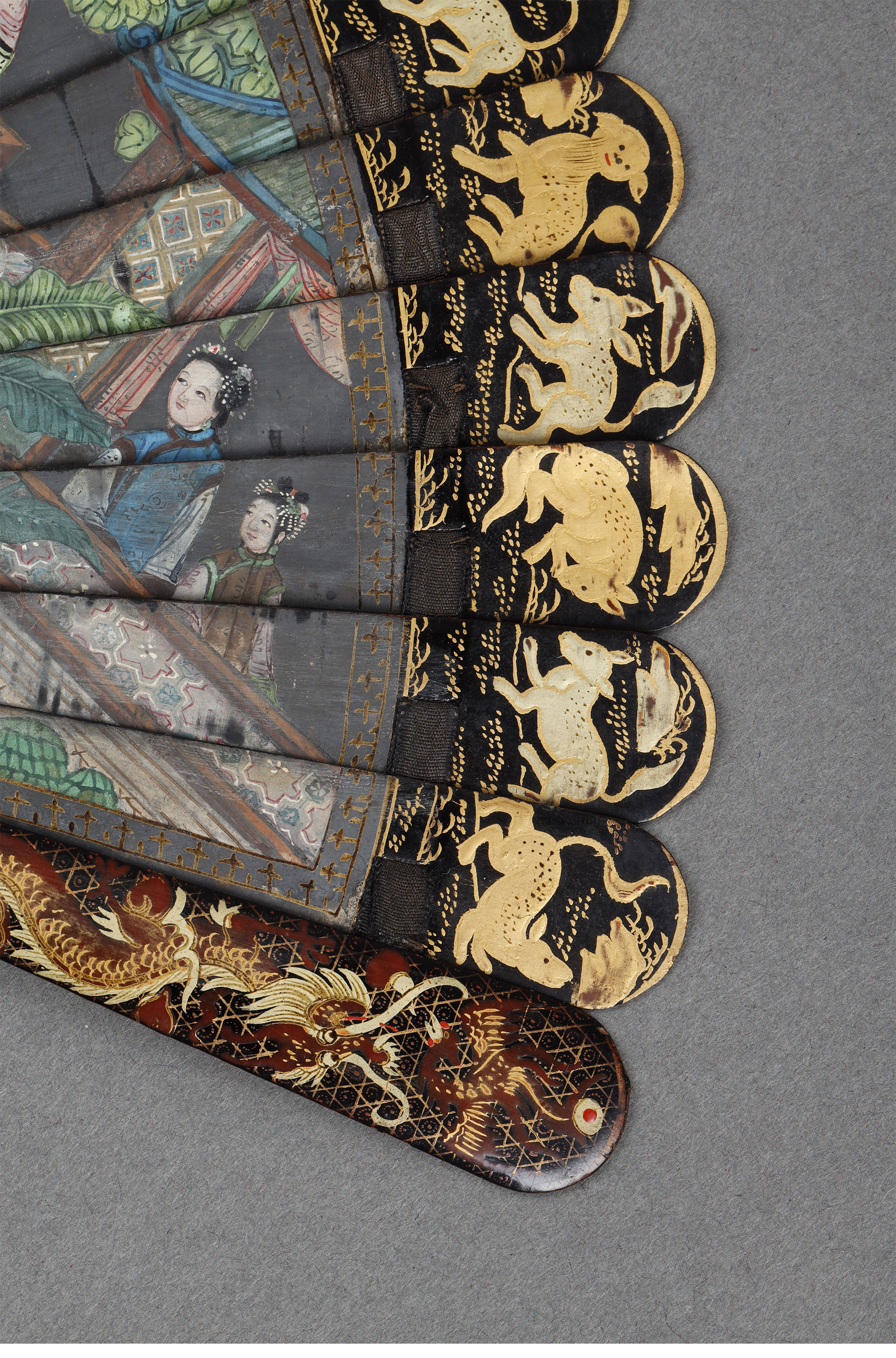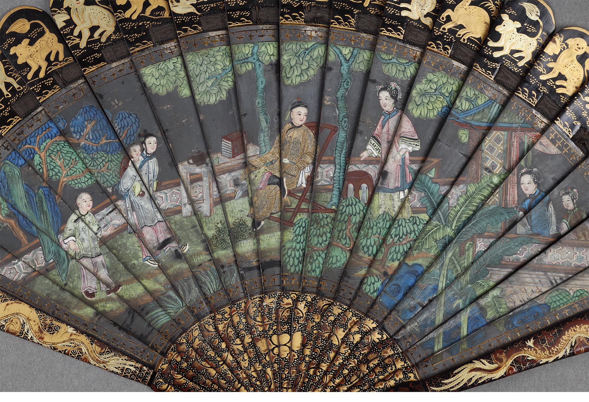 清代晚期十三行出品彩绘人物故事黑漆描金瑞兽主题竹骨双面折扇