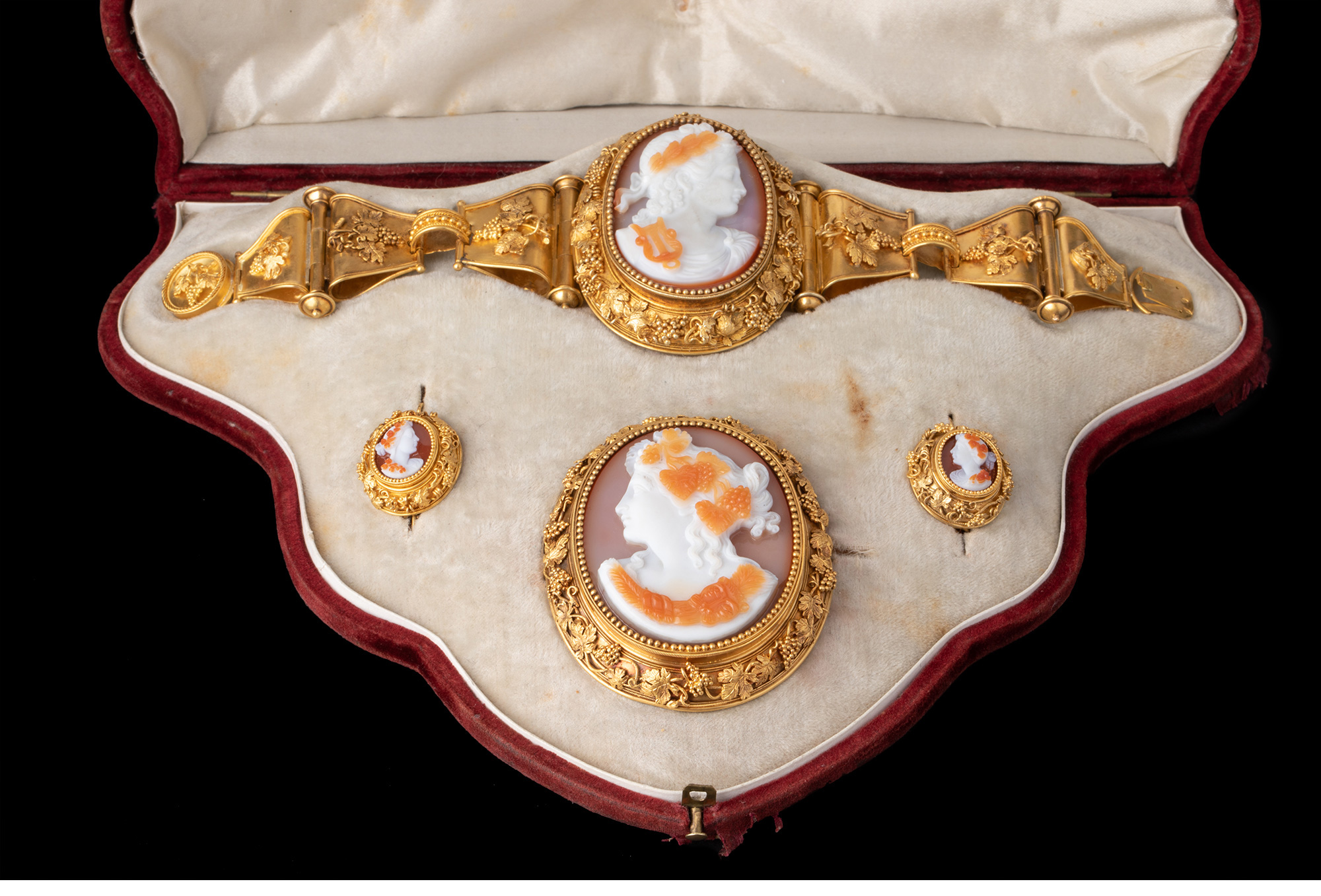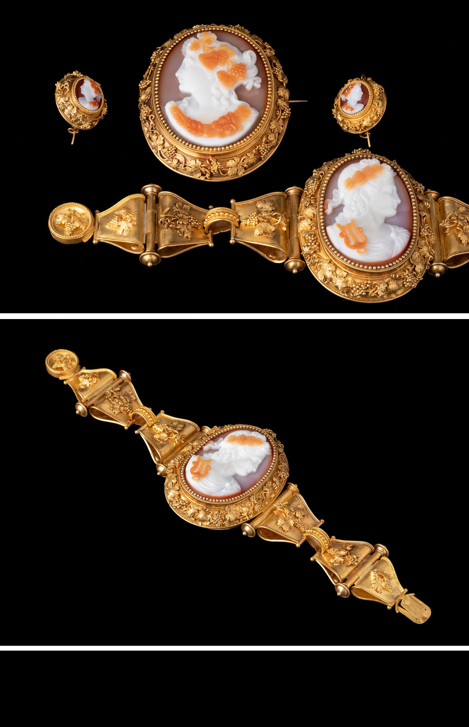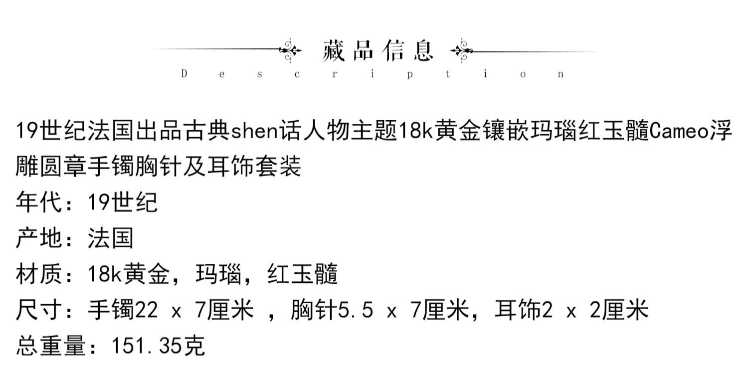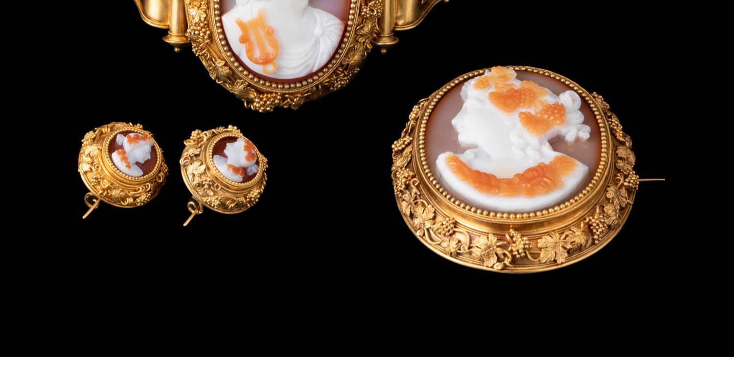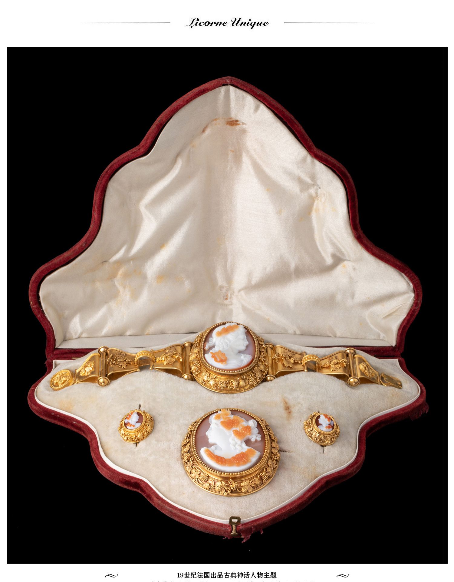 独角鹿西洋古董首饰套装18k黄金镶玛瑙Cameo浮雕圆章手镯胸针耳饰
