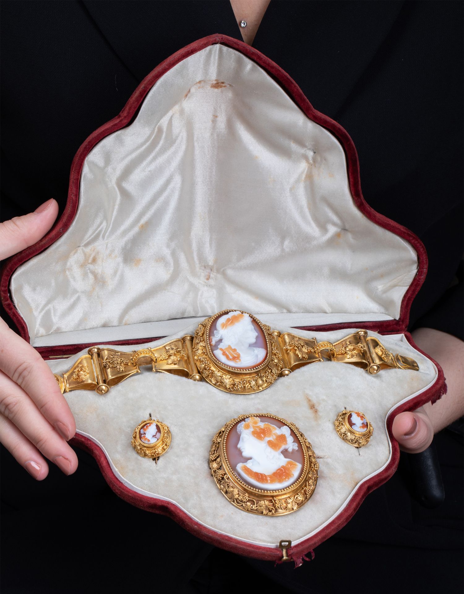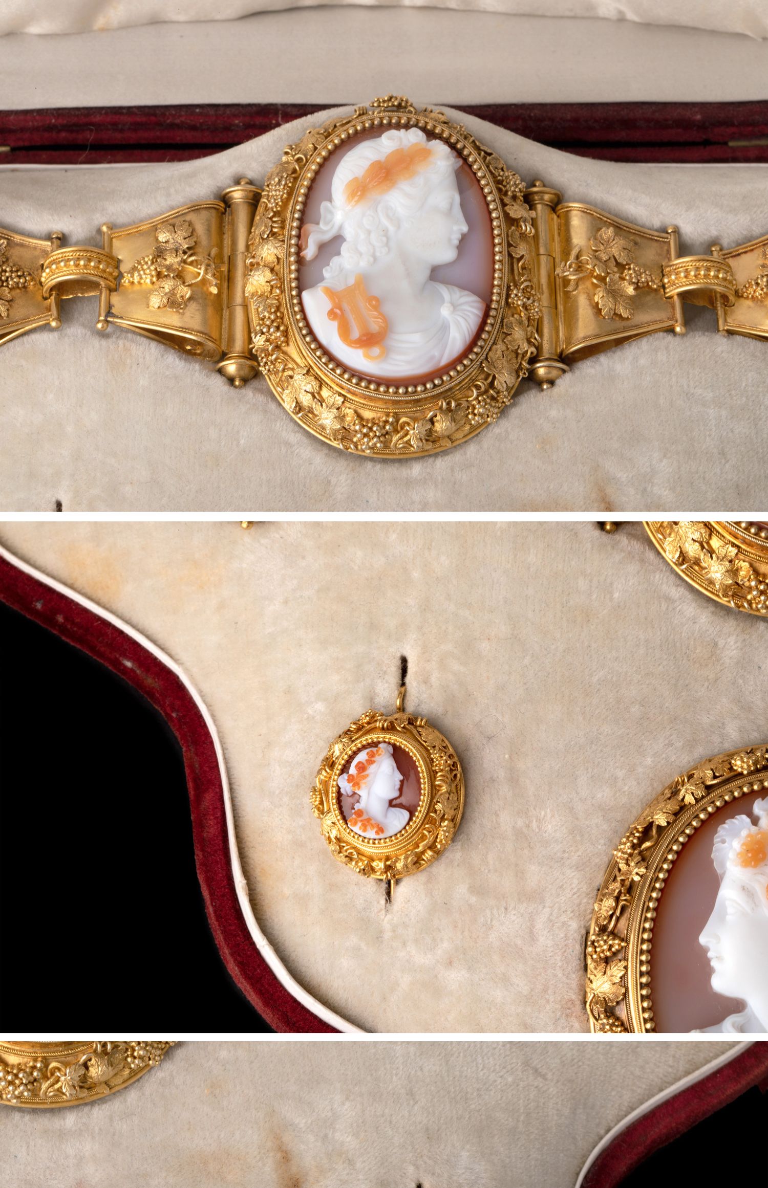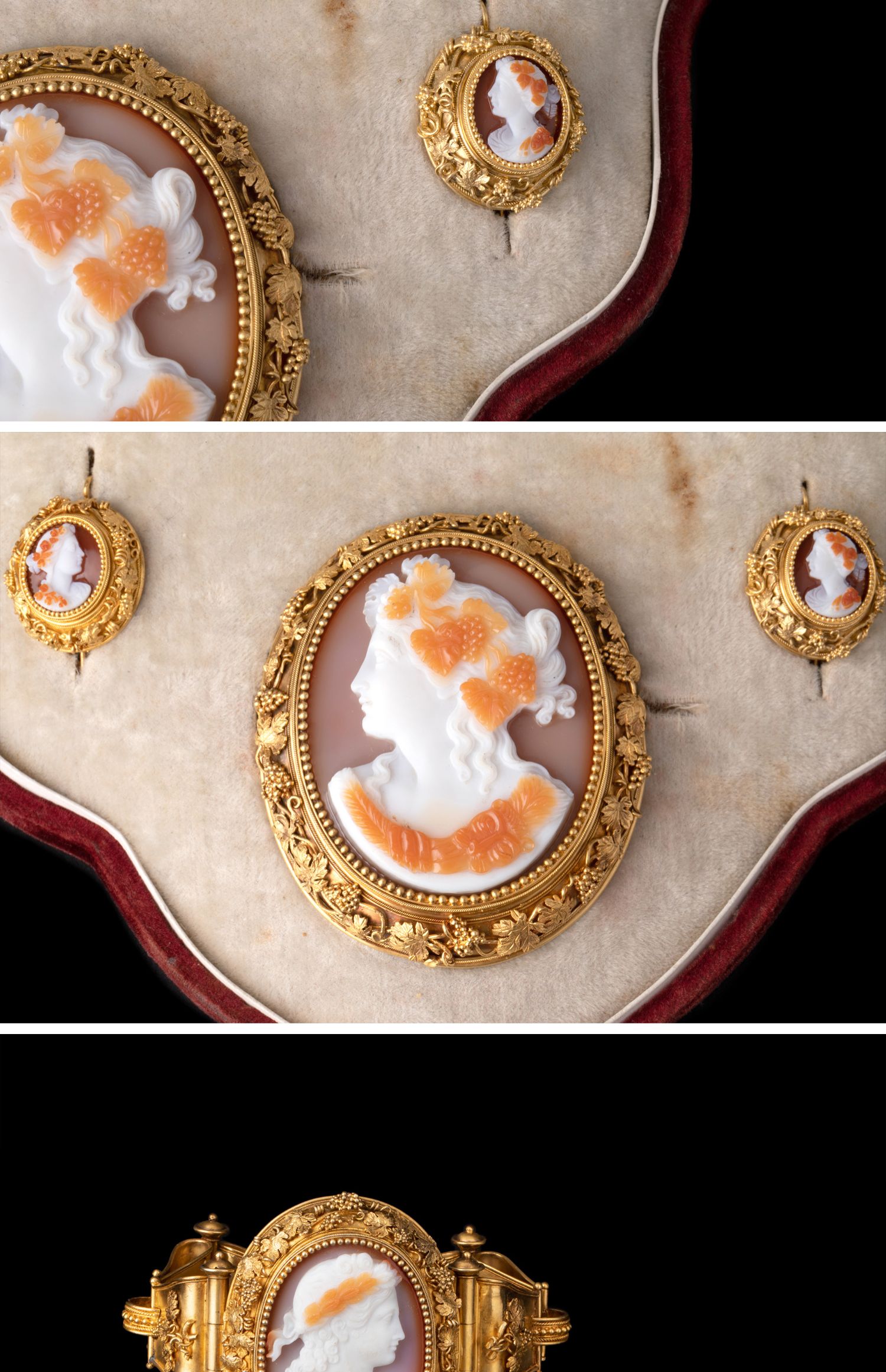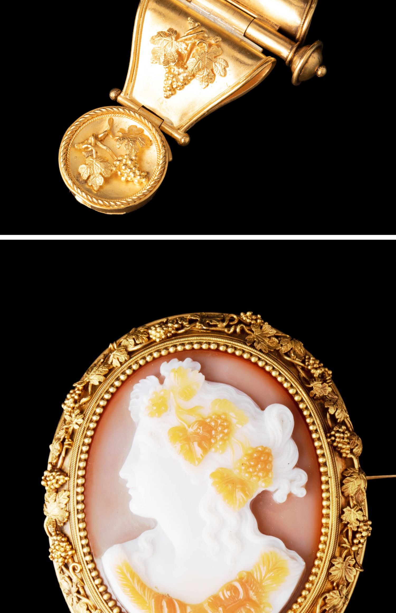 独角鹿西洋古董首饰套装18k黄金镶玛瑙Cameo浮雕圆章手镯胸针耳饰
