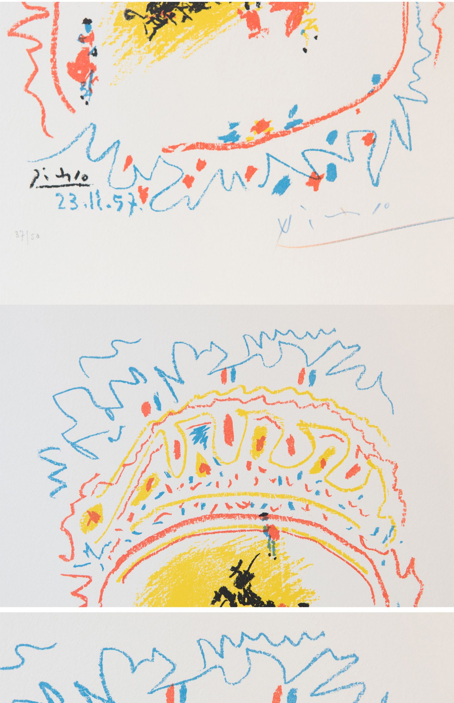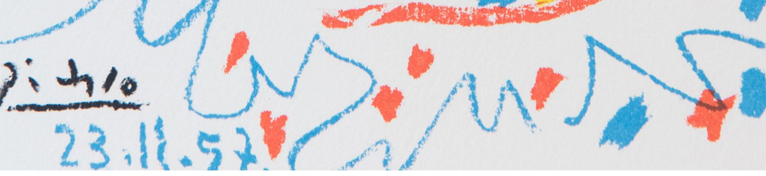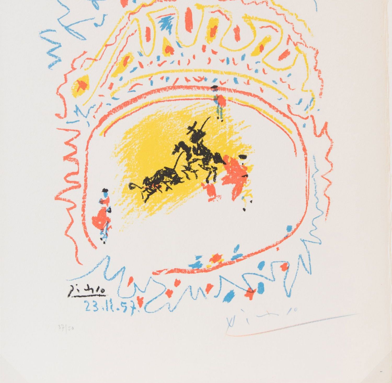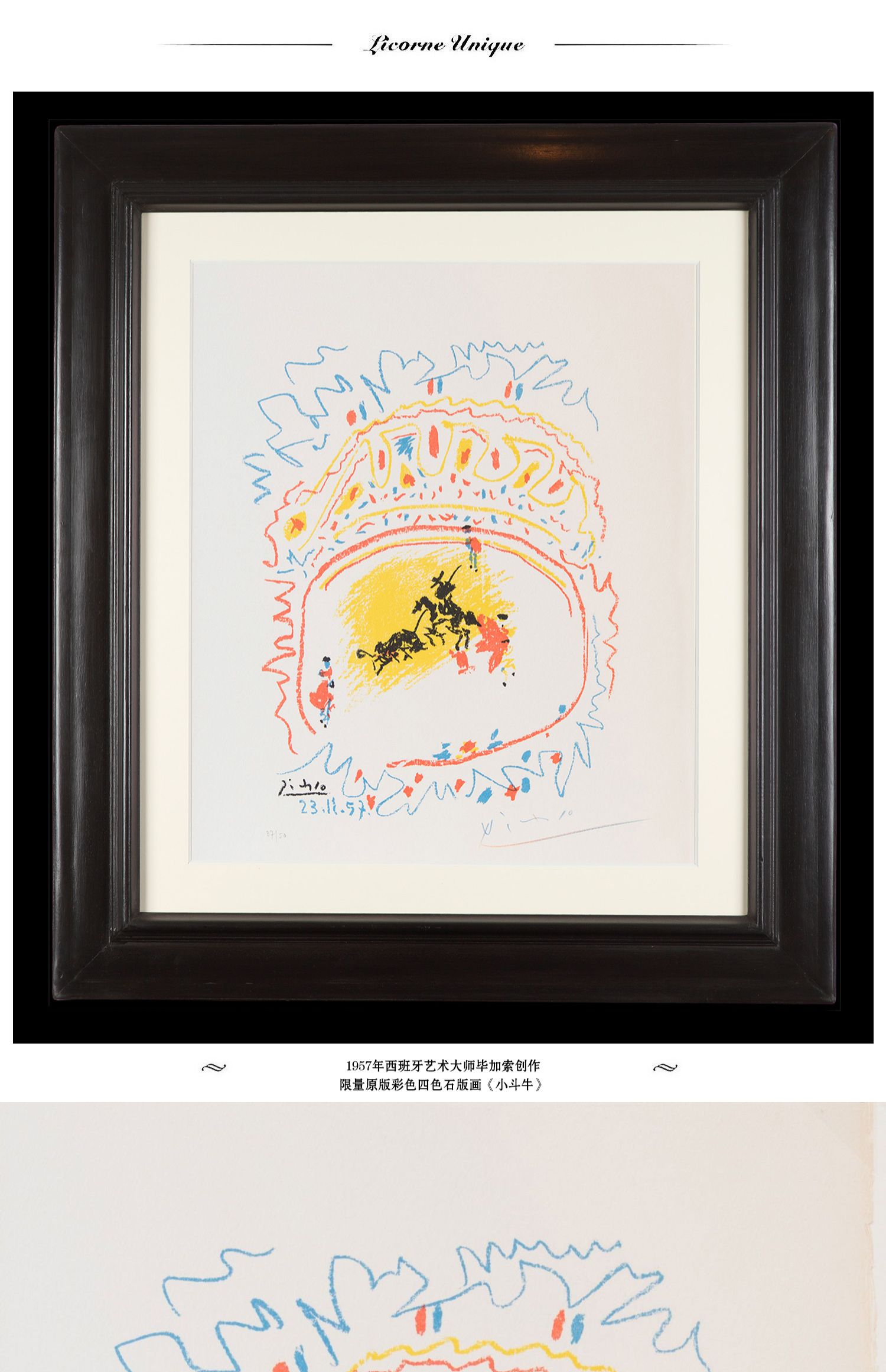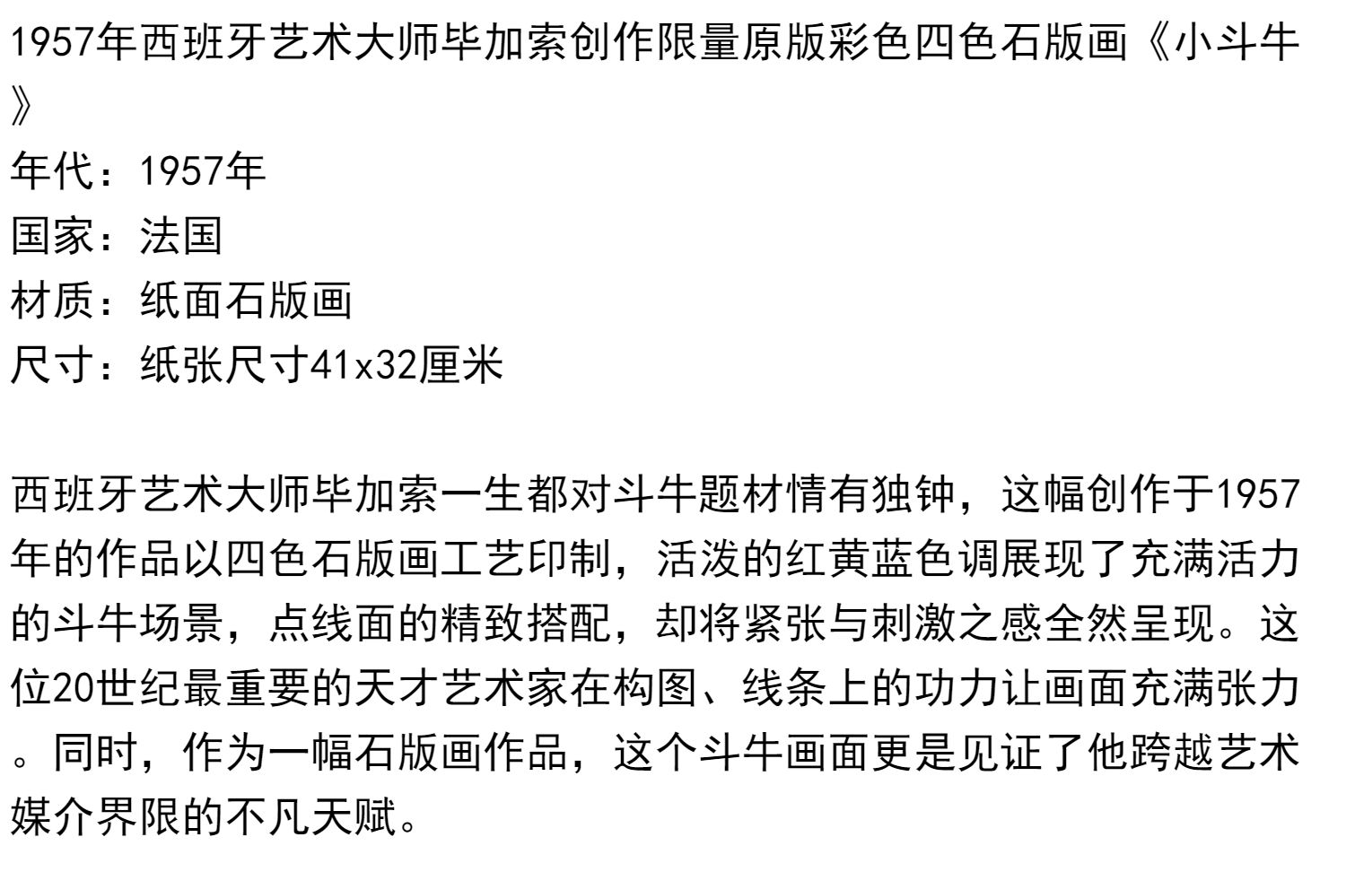 独角鹿西洋古董毕加索签名创作限量原版彩色四色石版画《小斗牛》