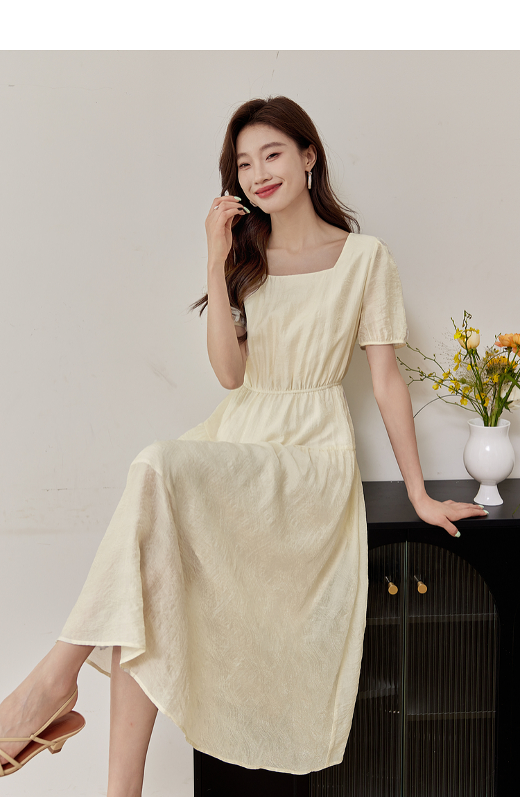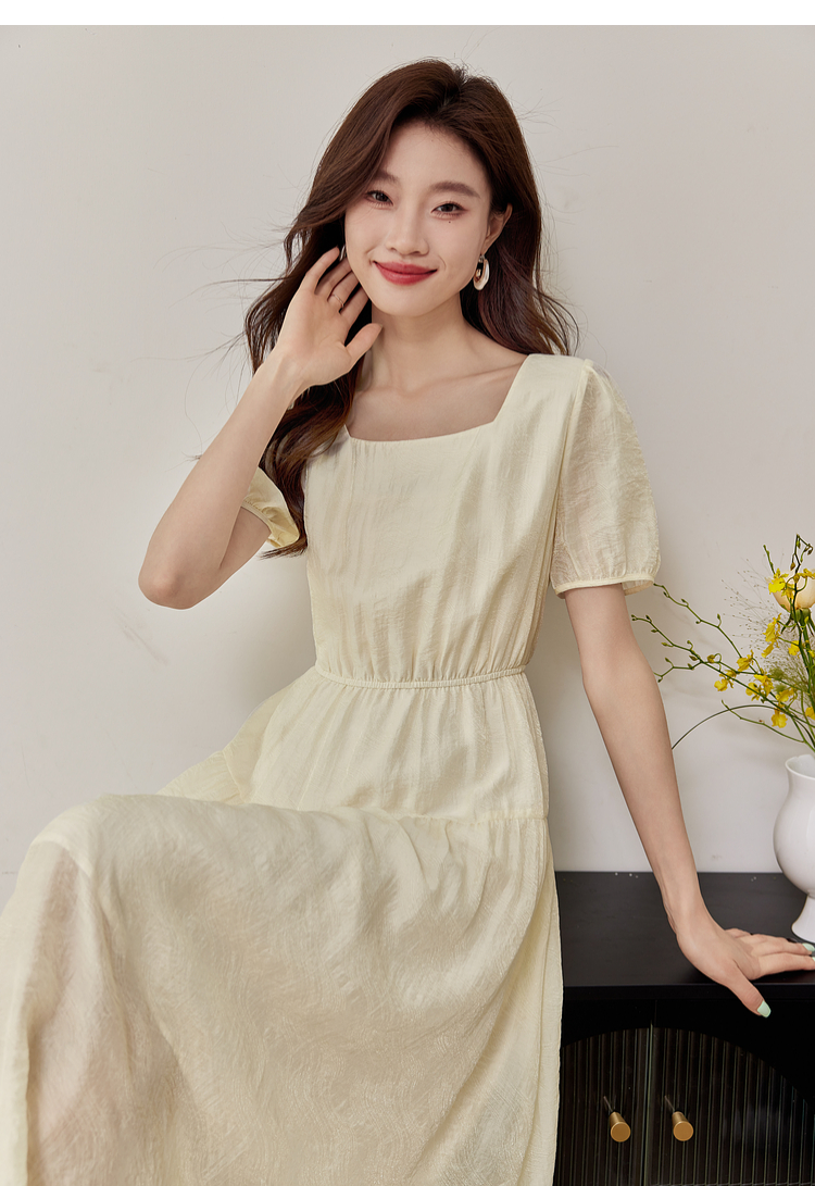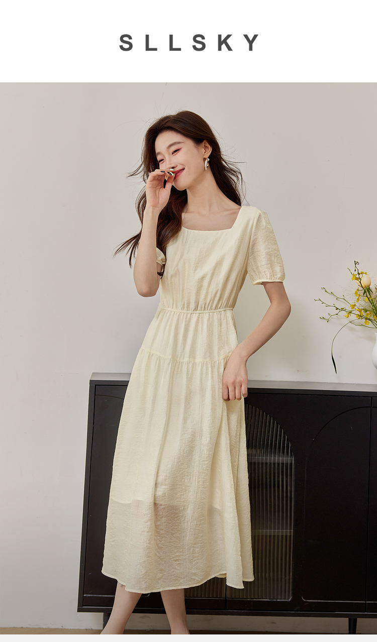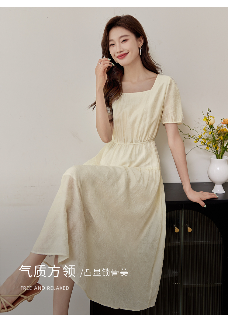 【专属特价】熙世界高级感法式天丝连衣裙夏新款收腰显瘦泡泡袖方领a字裙子