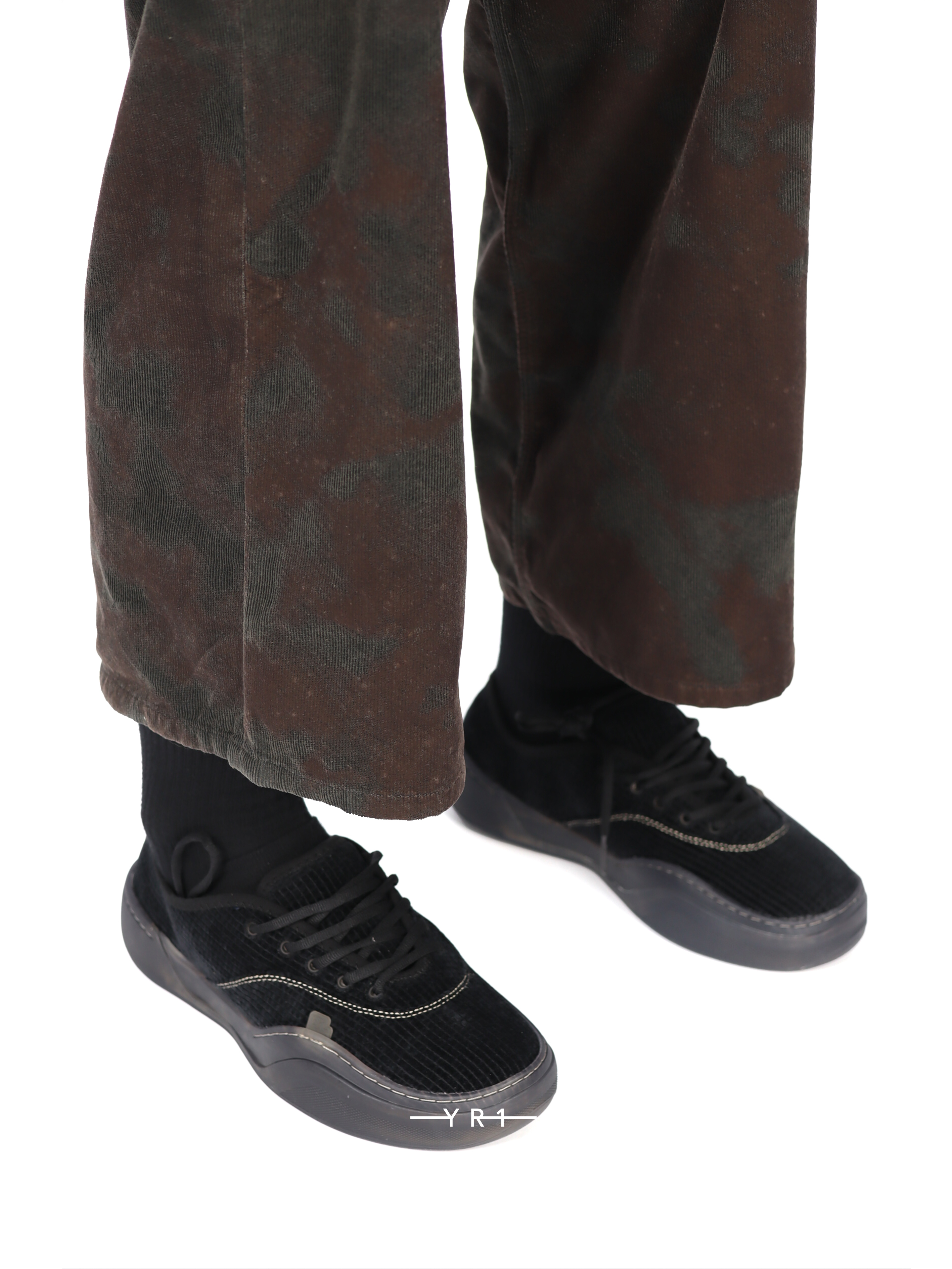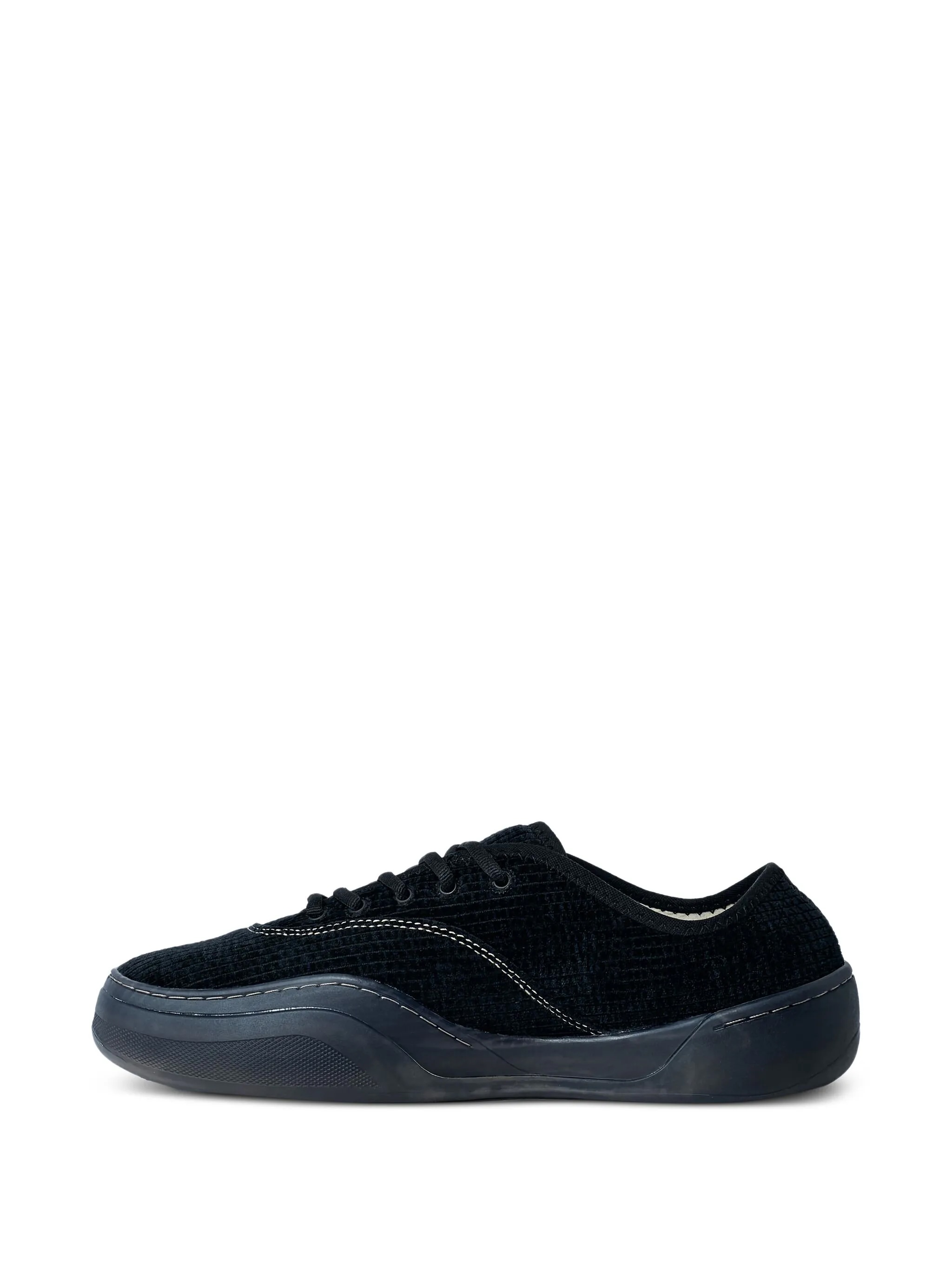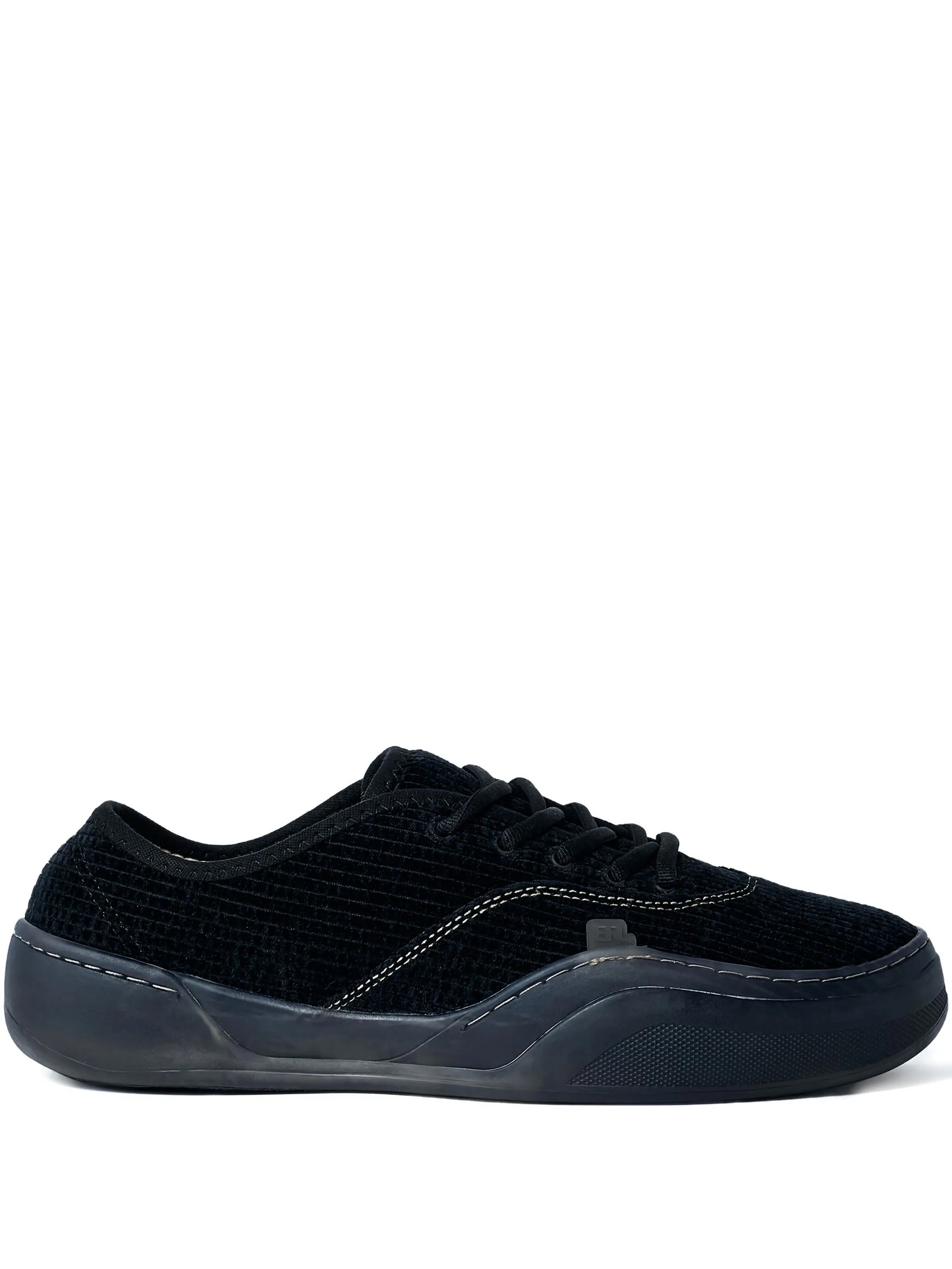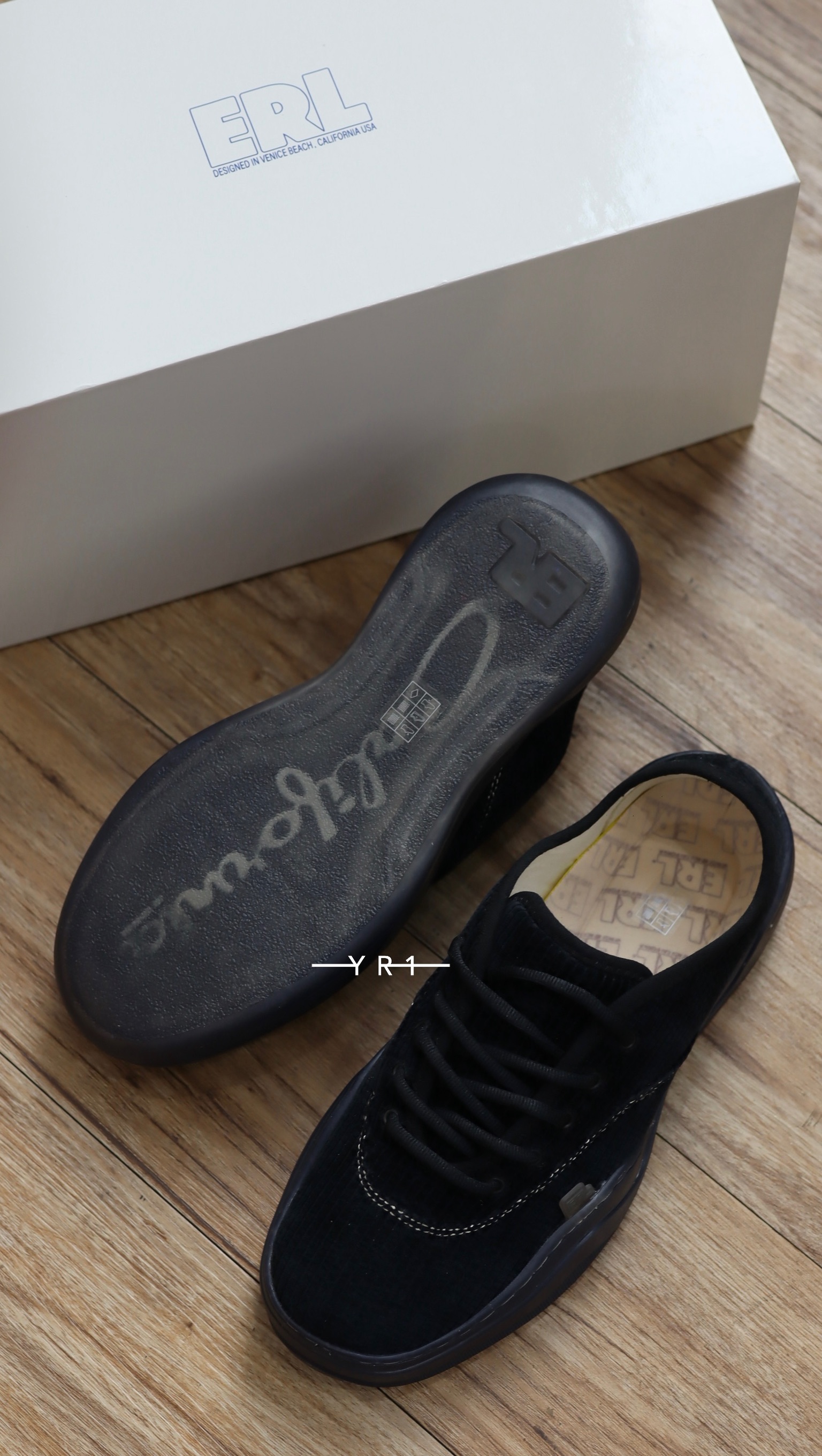 复古帆布运动鞋,采用深黑色灯芯绒面料,配有 ERL 品牌缓震鞋底。饰有之字形缝线细节。透明橡胶外底印有加州艺术图案。ERL 橡胶标志。亮面米色硬壳鞋盒内含 ERL 包装纸。
