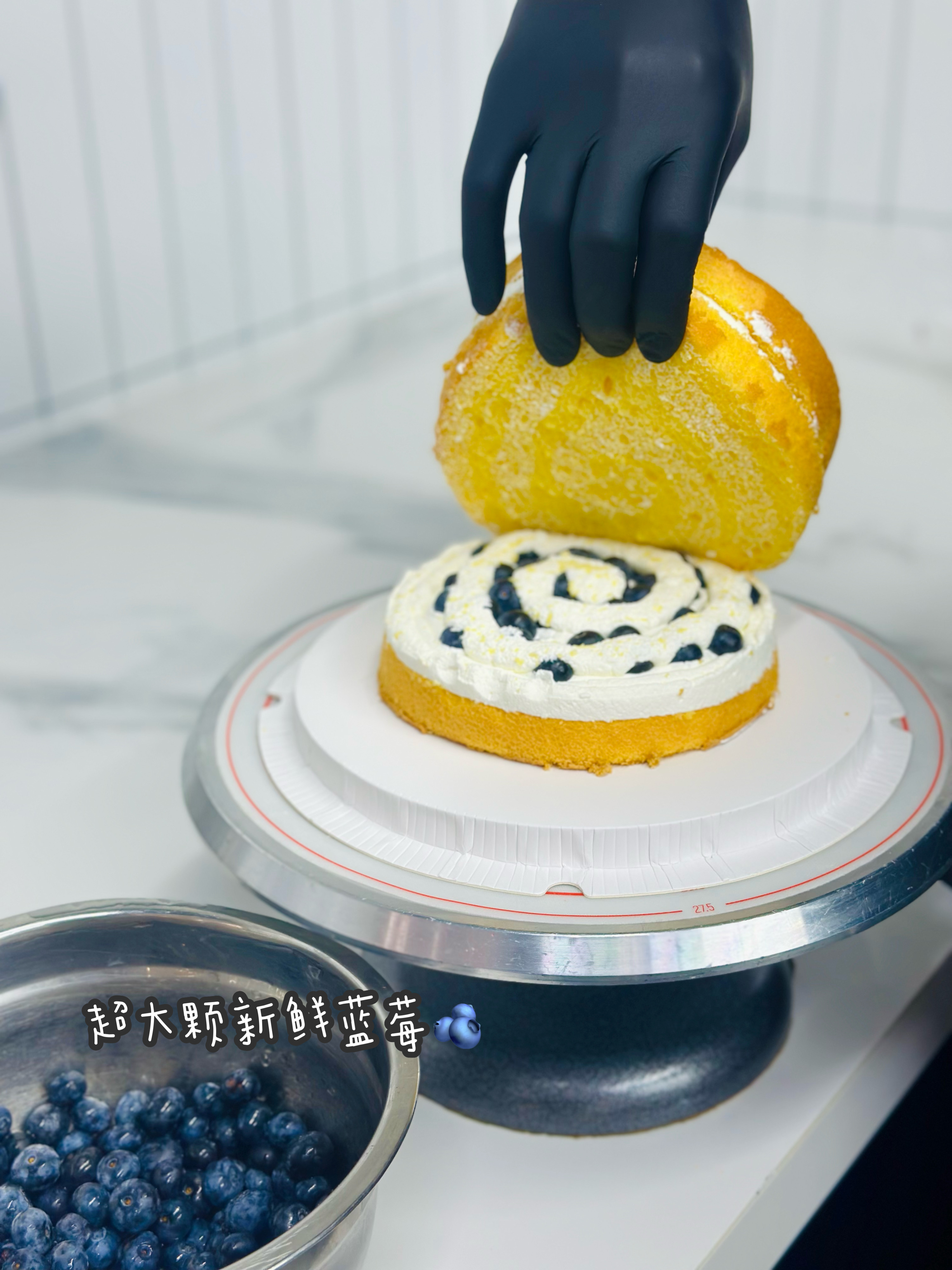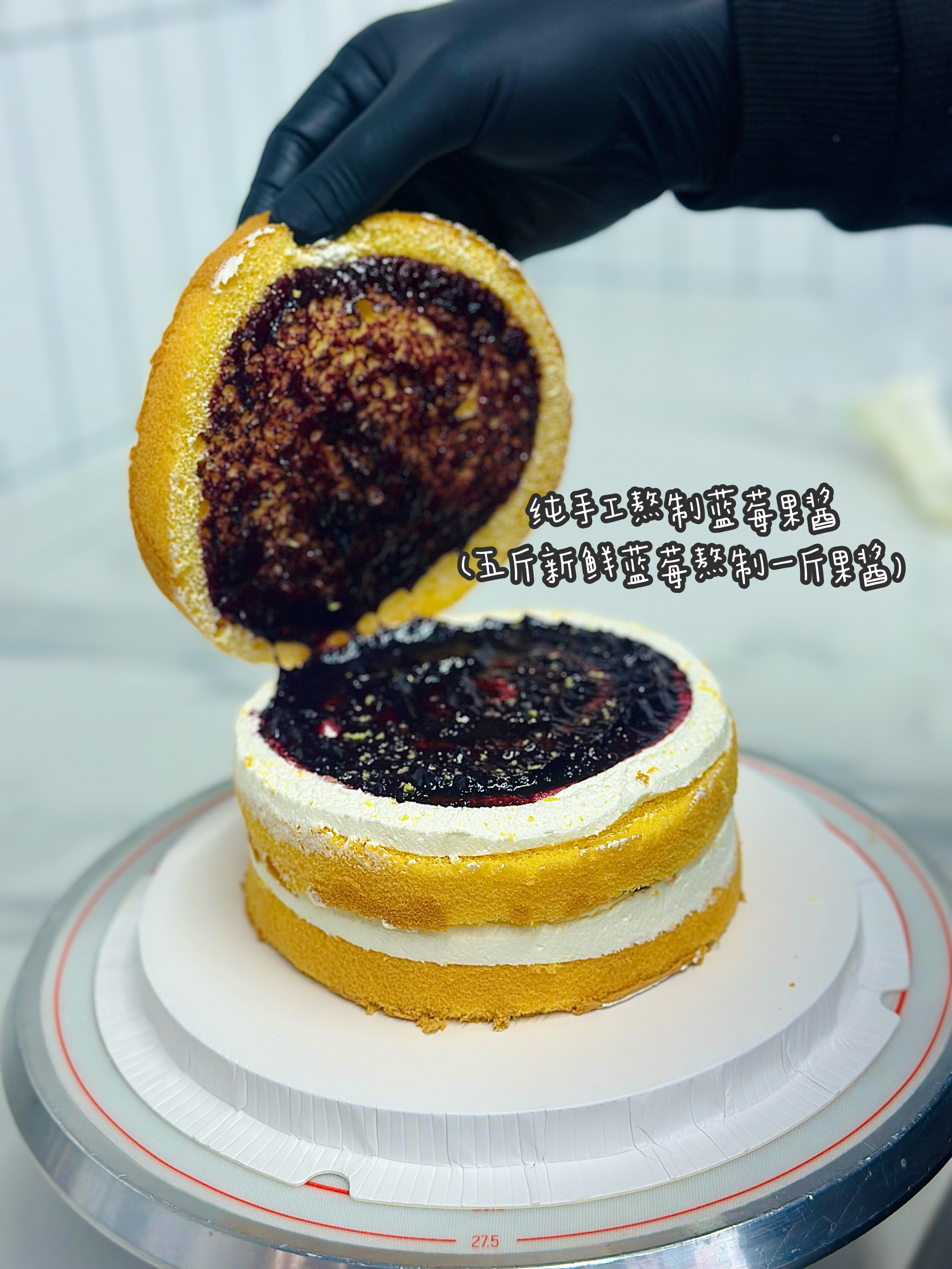 内陷:外层天然藻蓝蛋白奶油,内陷原味蛋糕胚,一层纯手工熬制蓝莓果酱,一层新鲜蓝莓果肉。