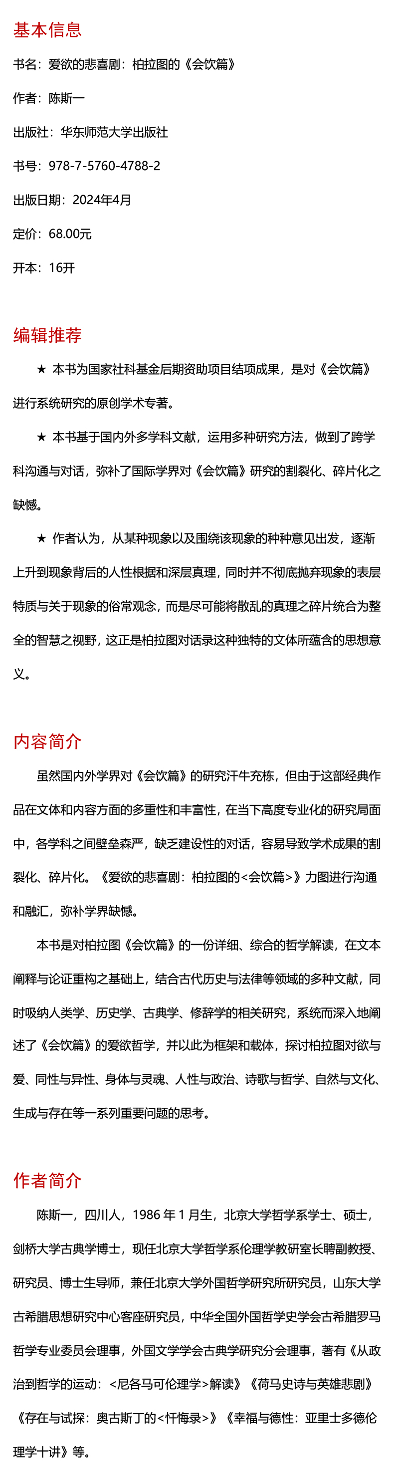 本书是对柏拉图《会饮篇》的一份详细、综合的哲学解读,在文本阐释与论证重构之基础上,结合古代历史与法律等领域的多种文献,同时吸纳人类学、历史学、古典学、修辞学的相关研究,系统而深入地阐述了《会饮篇》的爱欲哲学,并以此为框架和载体,探讨柏拉图对欲与爱、同性与异性、身体与灵魂、人性与政治、诗歌与哲学、自然与文化、生成与存在等一系列重要问题的思考。