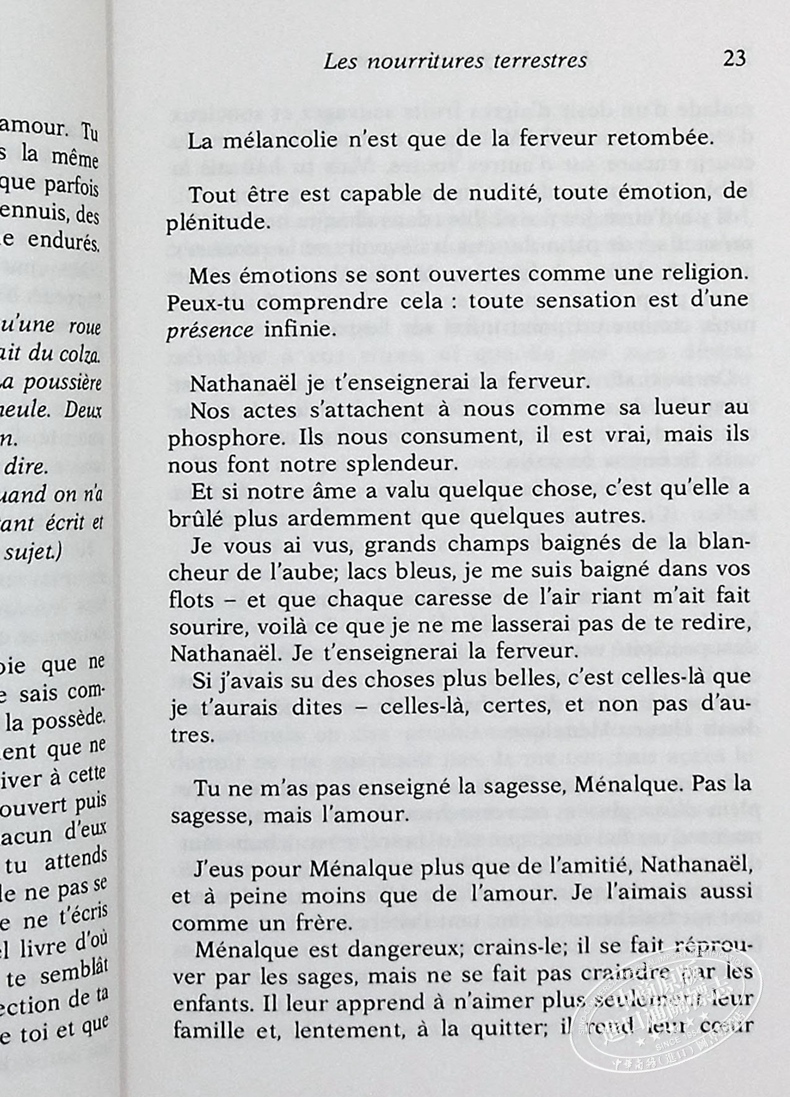 "Nathanaël, je t'enseignerai la ferveur". C'est en effet cela que transmet Gide, cet éveil, cet élan à demi-mystique qui rend grâce au simple fait de respirer. --Claire Mazurel