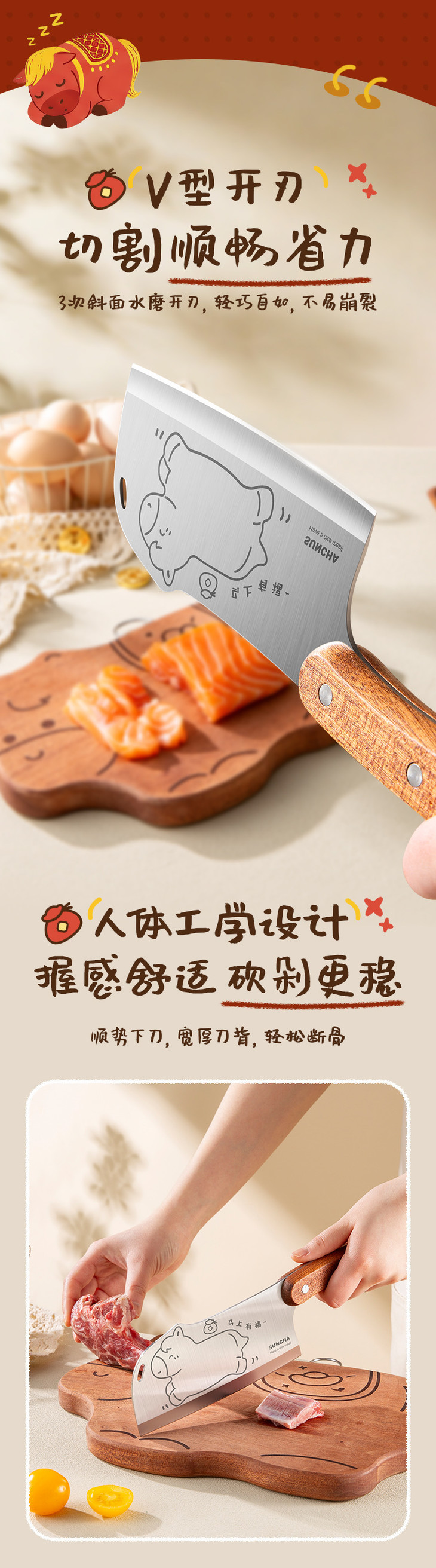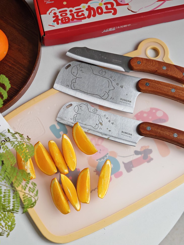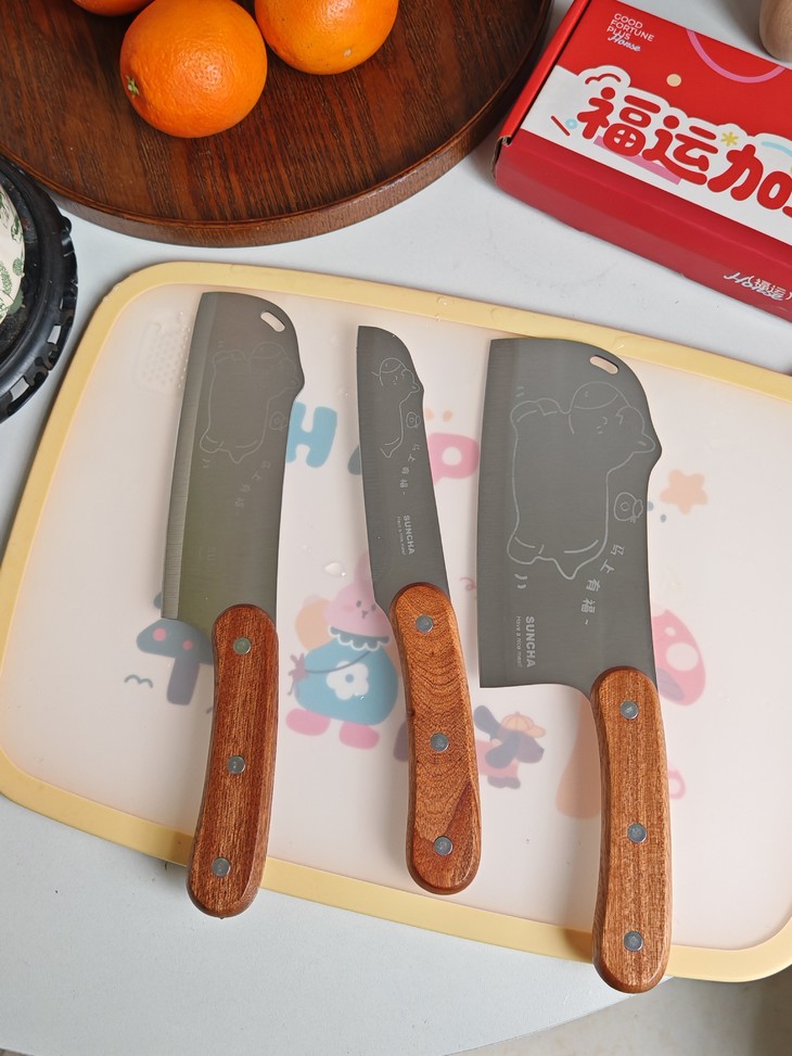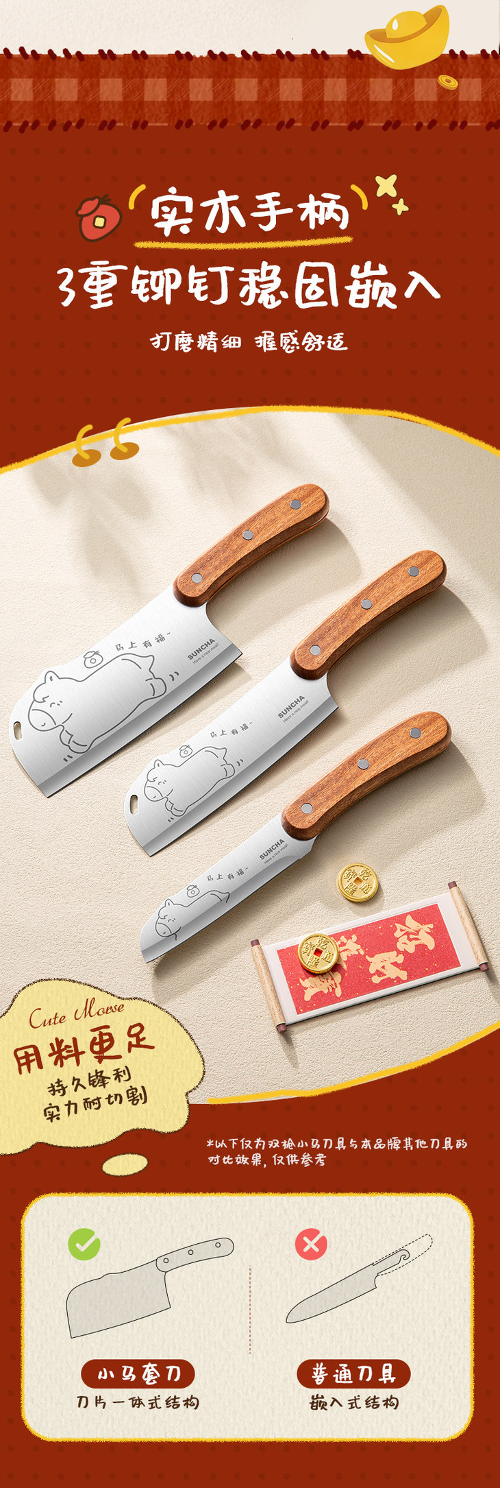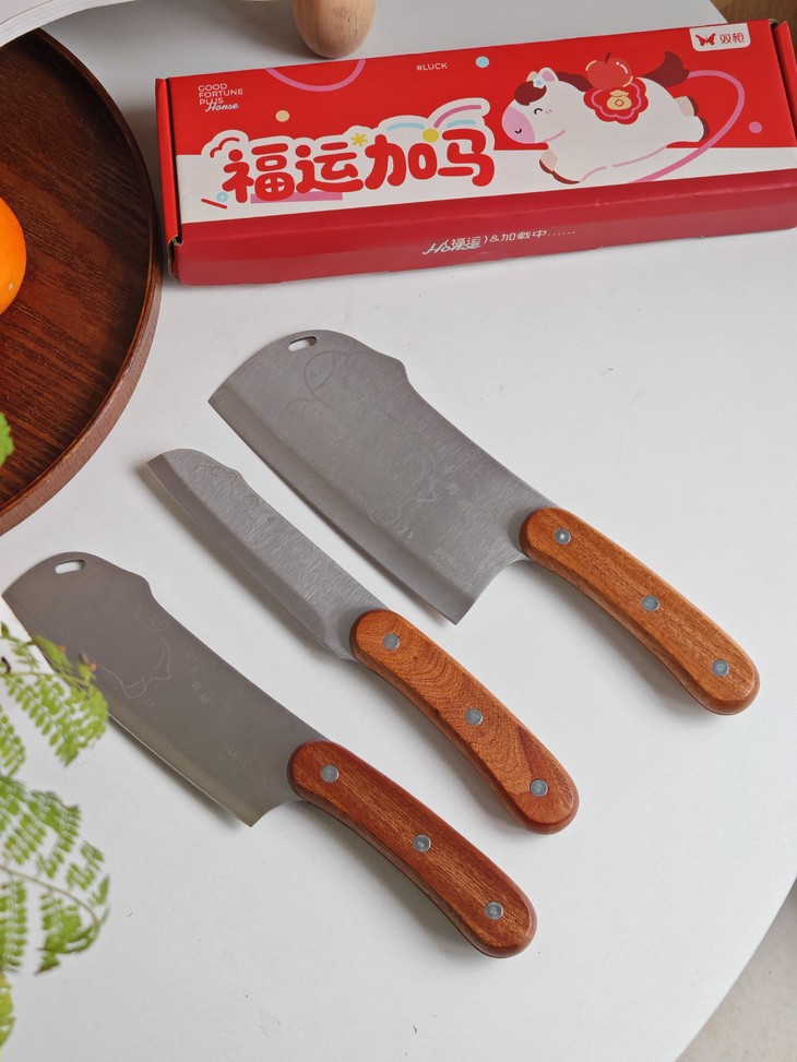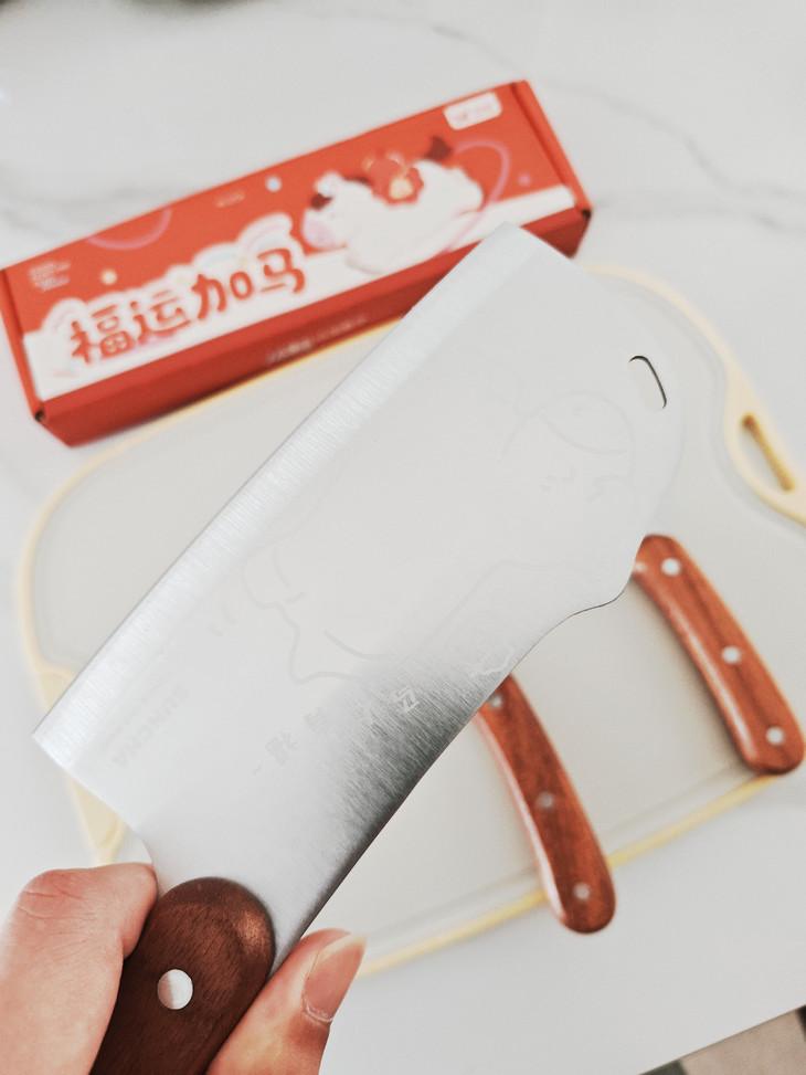 谁能拒绝福气小马的刀面设计! 这种可可爱爱寓意美好的小设计 谁见了都喜欢~ 是真的能切菜肉,原木的手柄很好握 3重铆钉稳固嵌入 精细打磨 握感舒适 切起来嘎嘎顺~
