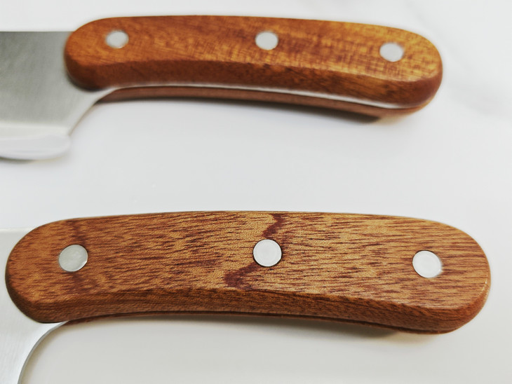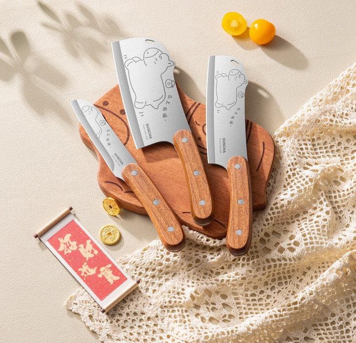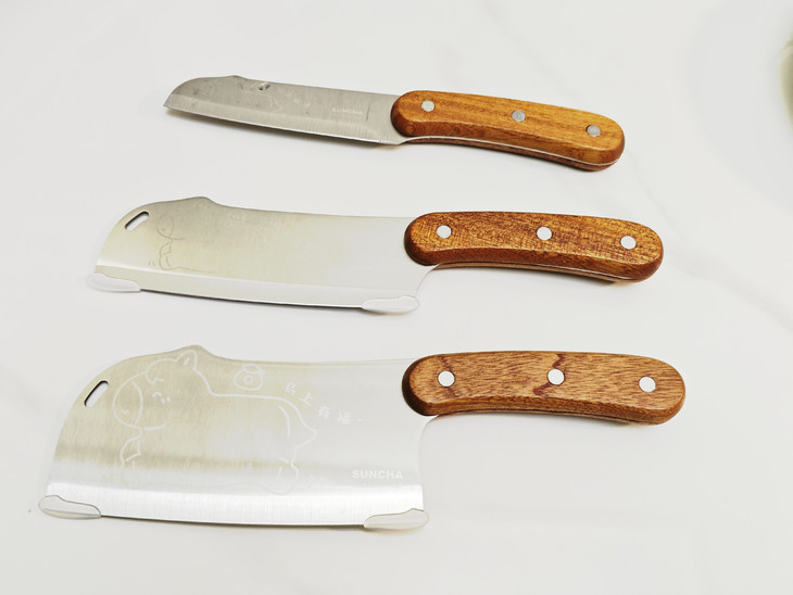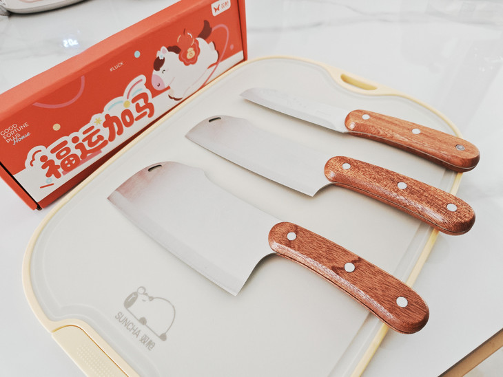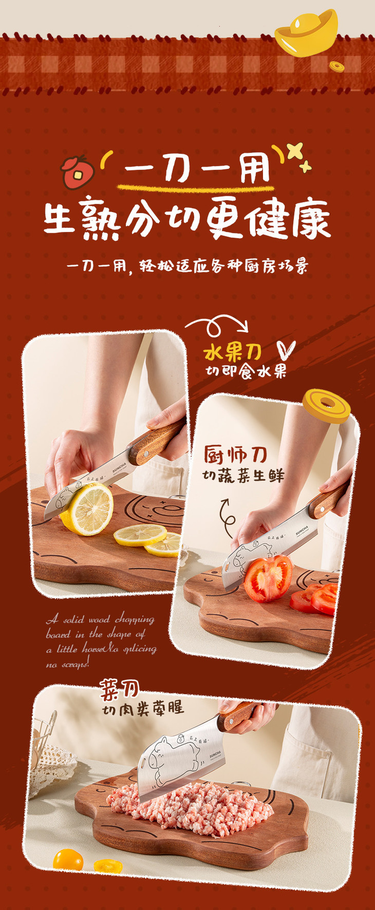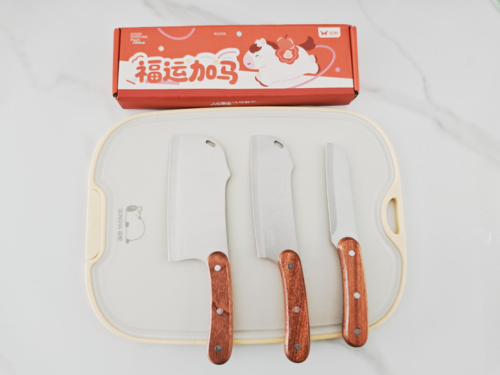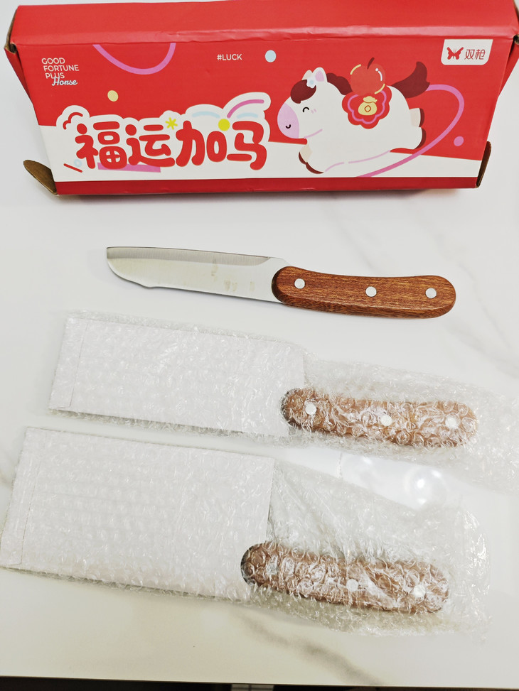 谁能拒绝福气小马的刀面设计! 这种可可爱爱寓意美好的小设计 谁见了都喜欢~ 是真的能切菜肉,原木的手柄很好握 3重铆钉稳固嵌入 精细打磨 握感舒适 切起来嘎嘎顺~