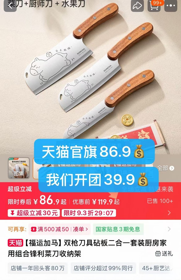 双枪30年老品牌 好口碑 专刀专用 不串味 生熟分切更健康 乌檀木手柄+ 3cr130钢材 持久耐用不变形 天猫官旗86.9💰 团购开团39.9💰,立省47💰