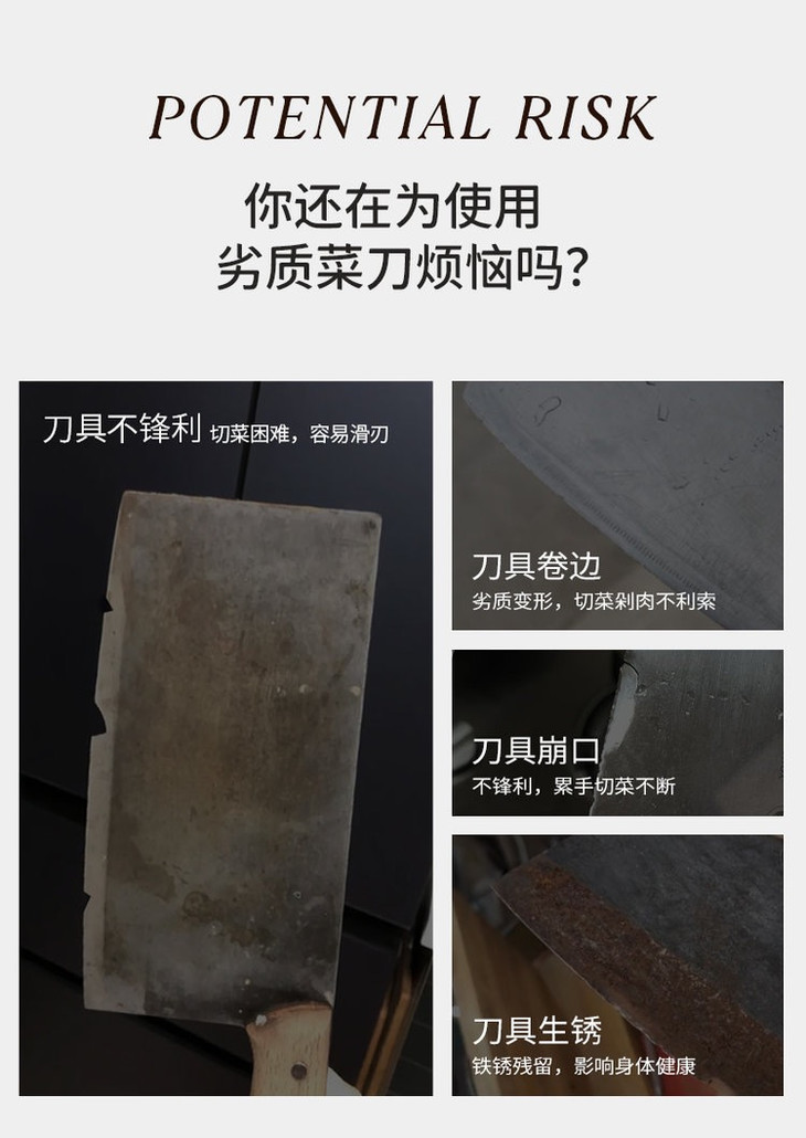 之前你买的刀 切菜困难,容易滑刀 刀具卷边 没用多久就劣质变形,切菜剁肉不利索 刀具崩口 刃口不锋利,要切好几次,切菜累手 刀具生锈 铁锈残留在刀面上 就问你你敢吃这样的菜刀切出来的菜嘛!! 一把好刀的刃口要经过精密的抛光 才能保证磨利的效果和长时间的使用品质