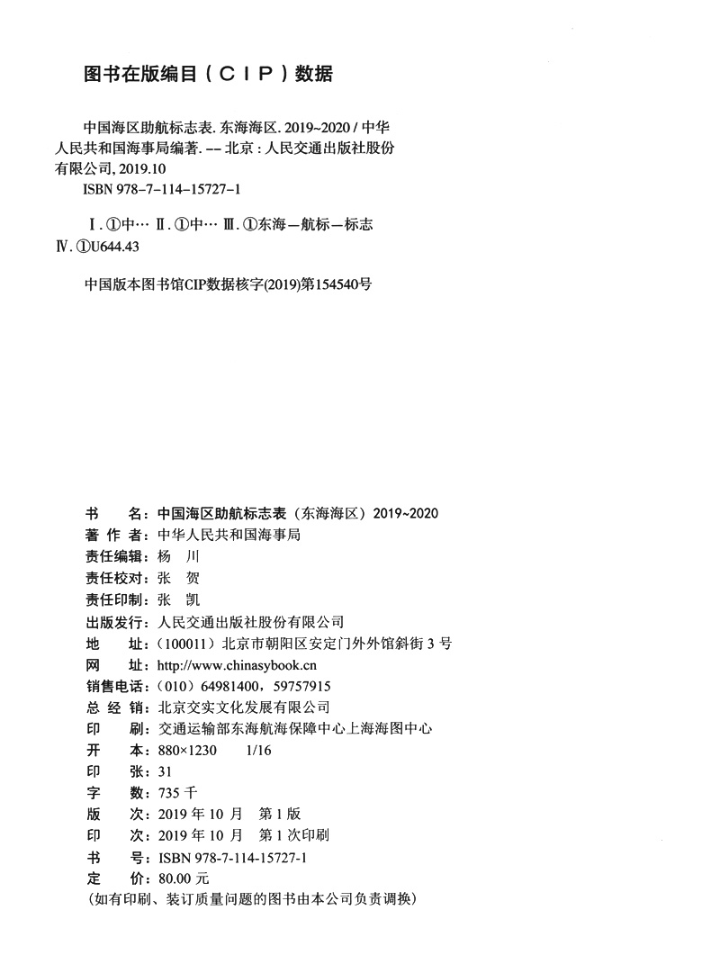书名:中国海区助航标志表(东海海区)2019~2020