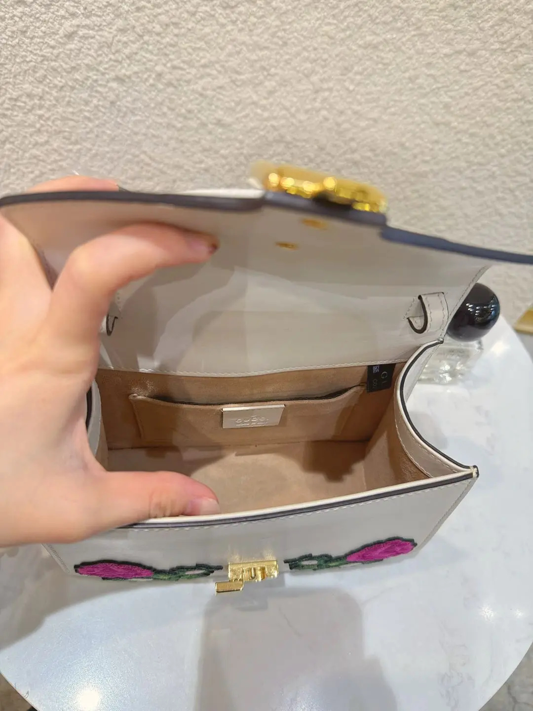 【商品详情】正品二手 GUCCI 塞尔维亚 白色 花卉刺绣 box牛皮 小号 斜挎包👜97新 20*14配件:肩带*2 手提带。刺绣细节超吸睛