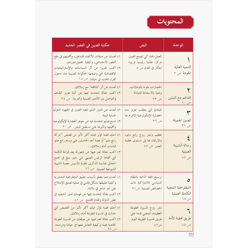 本教材共10个单元。各单元主要课文选自《习近平谈治国理政》第一卷、第二卷、第三卷和《在庆祝中国共产党成立100周年大会上的讲话》的阿拉伯文版,包括10个主题:中国青年使命;美丽中国;高质量发展;全过程人民民主;公平正义的社会;将改革进行到底;民族复兴之路;和而不同;文明走向何方;以史为鉴,开创未来。