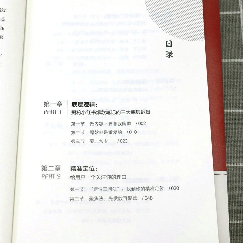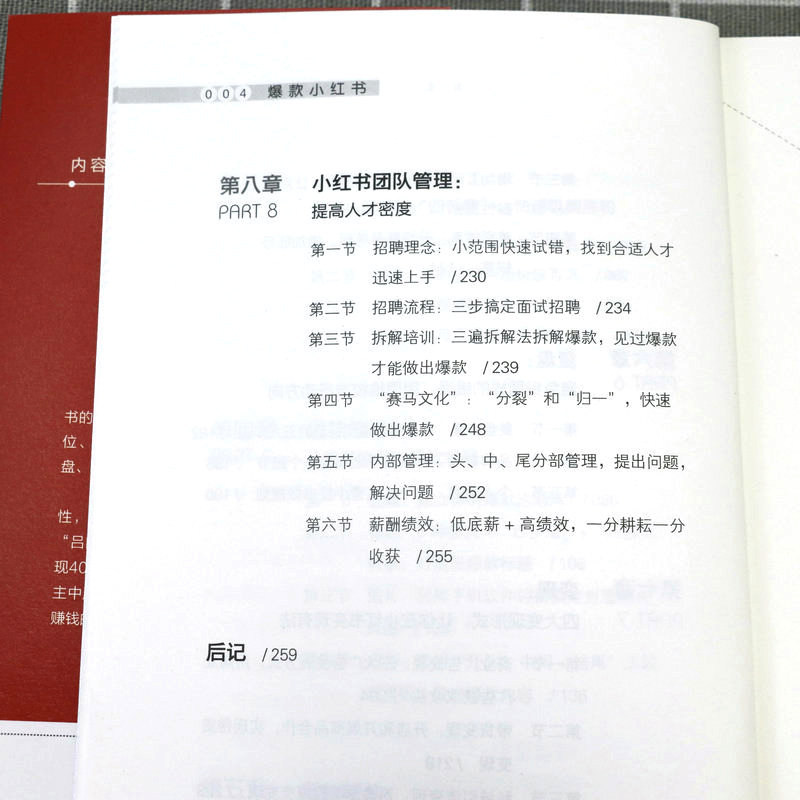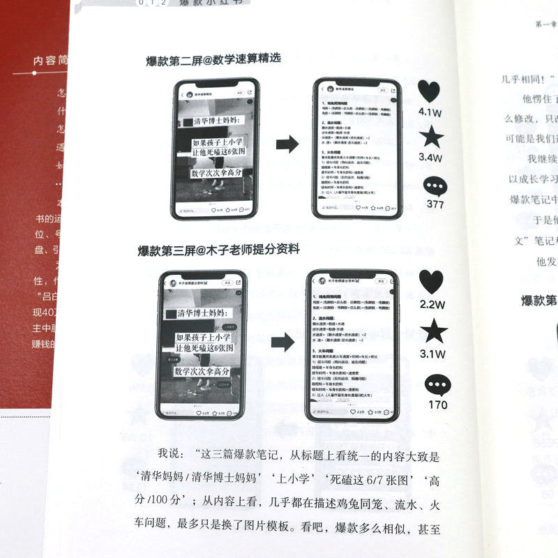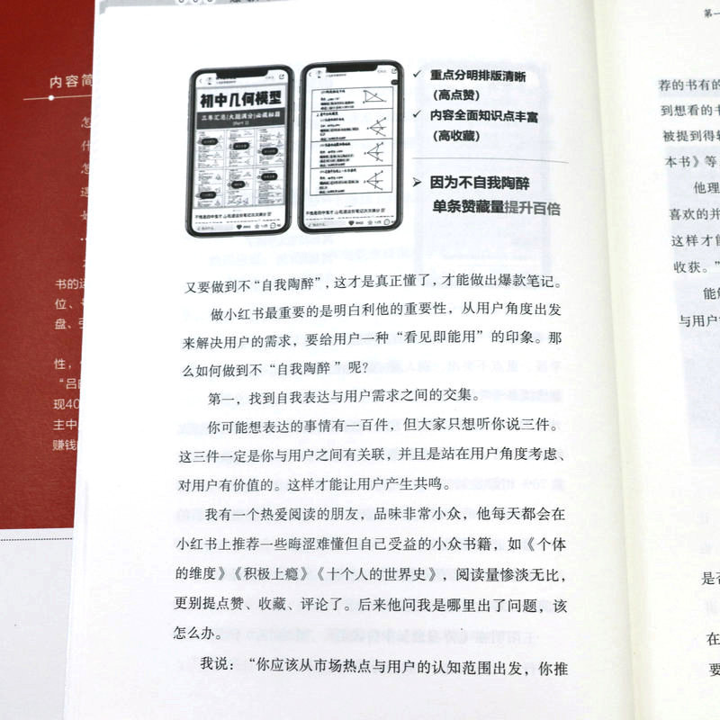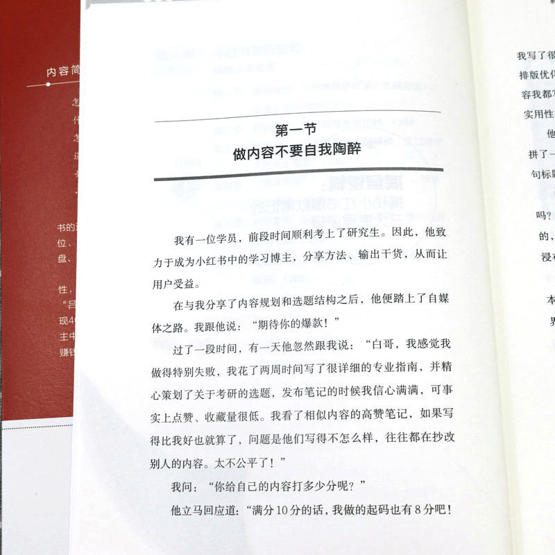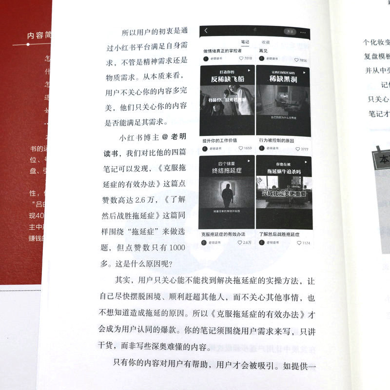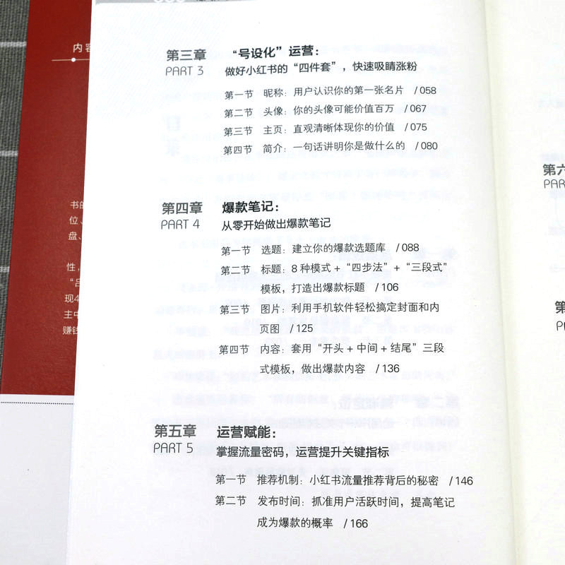 第一章底层逻辑:揭秘小红书爆款笔记的三大底层逻辑 第一节做内容不要自我陶醉/002 第二节爆款都是重复的/010 第三节要非常专一/023 第二章精准定位:给用户一个关注你的理由 第一节“定位三问法”:找到你的精准定位/030 第二节聚焦法:先发散再聚焦/048 第三章“号设化”运营:做好小红书的“四件套”,快速吸睛涨粉 第一节昵称:用户认识你的第一张名片/058 第二节头像:你的头像可能价值百万/067 第三节主页:直观清晰体现你的价值/075 第四节简介:一句话讲明你是做什么的/080 第四章爆款笔记:从零开始做出爆款笔记 第一节选题:建立你的爆款选题库/088 第二节标题:8种模式+“四步法”+“三段式”模板,打造出爆款标题/106 第三节图片:利用手机软件轻松搞定封面和内页图/125 第四节内容:套用“开头+中间+结尾”三段式模板,做出爆款内容/136 第五章运营赋能:掌握流量密码,运营提升关键指标 第一节推荐机制:小红书流量推荐背后的秘密/146 第二节发布时间:抓准用户活跃时间,提高笔记成为爆款的概率/166 第三节增加互动:给笔记一个推力,让用户黏性更强/169 第四节等级体系:升级账号等级,增加账号权重/174 第六章复盘:避免犯同样的错误,用思维校准行动方向 第一节复盘步骤:从思维推演到行动的五大步骤/182 第二节品牌复盘:你和高手之间差一个细节/188 第三节个人复盘:为个人运营小红书做规划/196 第七章变现:四大变现形式,让你在小红书变现有法 第一节商业广告变现:三大广告变现方式,用商业广告获取收益/204 第二节带货变现:开店和开展商品合作,实现带货变现/218 第三节私域引流变现:两步走实现成交变现/223 第四节课程变现:把技能打造成课程,实现课程变现/225 第八章小红书团队管理:提高人才密度 第一节招聘理念:小范围快速试错,找到合适人才迅速上手/230 第二节招聘流程:三步搞定面试招聘/234 第三节拆解培训:三遍拆解法拆解爆款,见过爆款才能做出爆款/239 第四节“赛马文化”:“分裂”和“归一”,快速做出爆款/248 第五节内部管理:头、中、尾分部管理,提出问题,解决问题/252 第六节薪酬绩效:低底薪+高绩效,一分耕耘一分收获/255 后记/259
