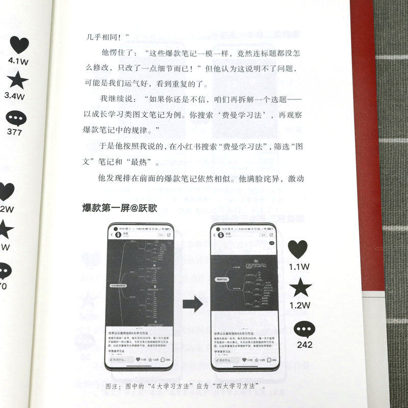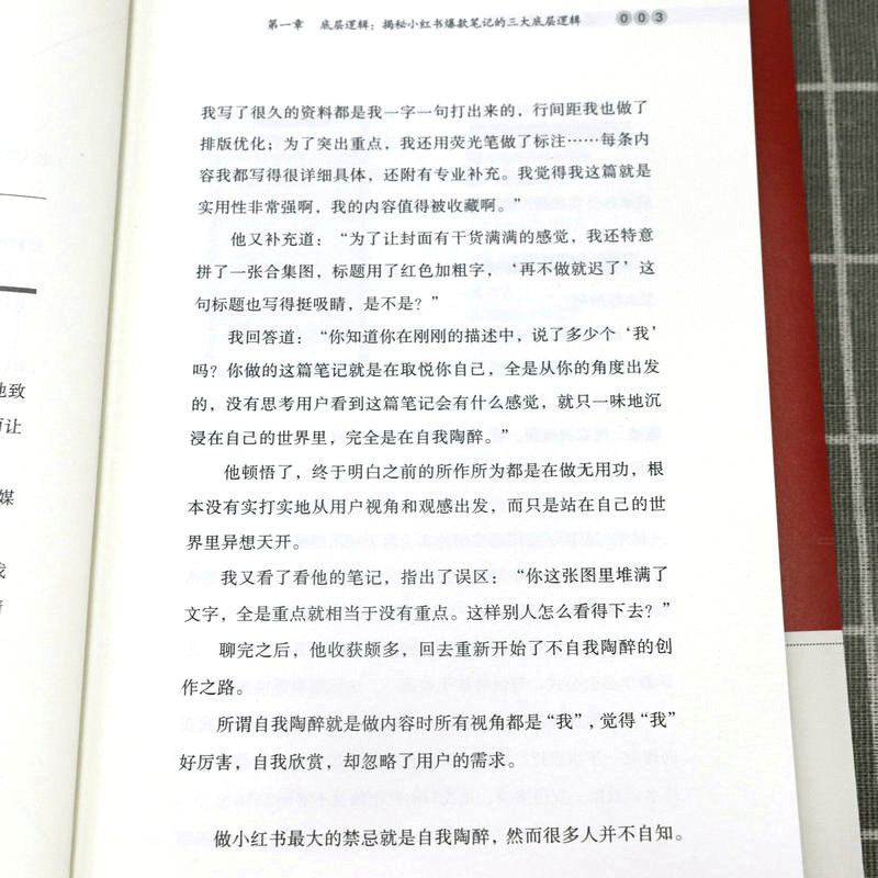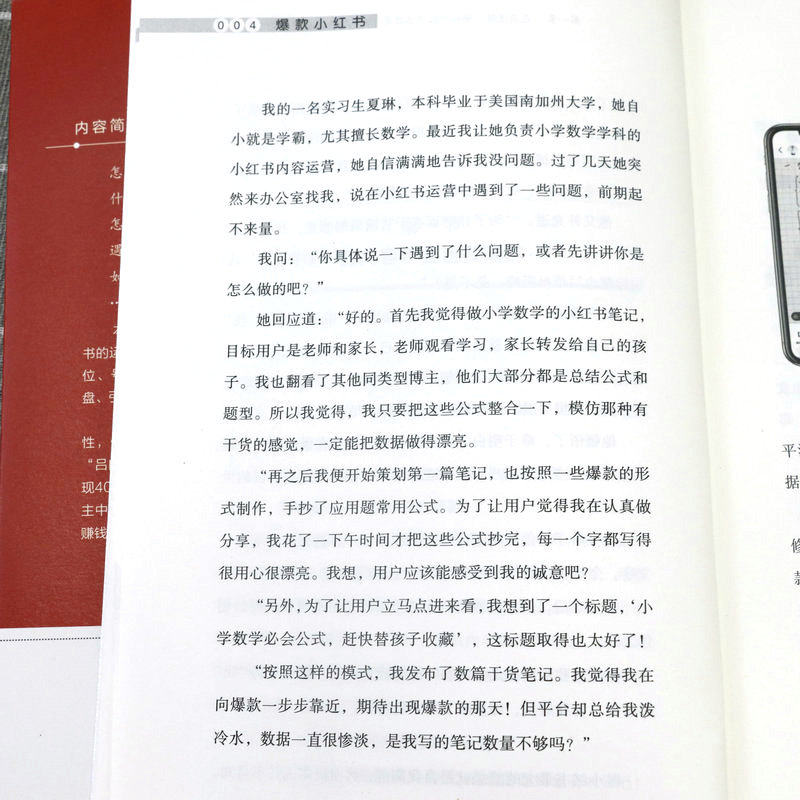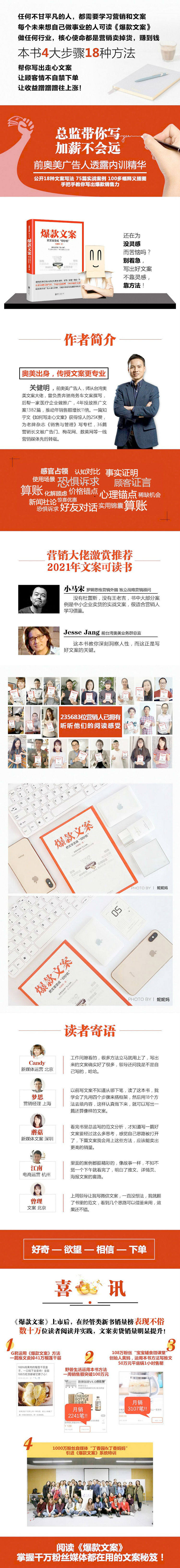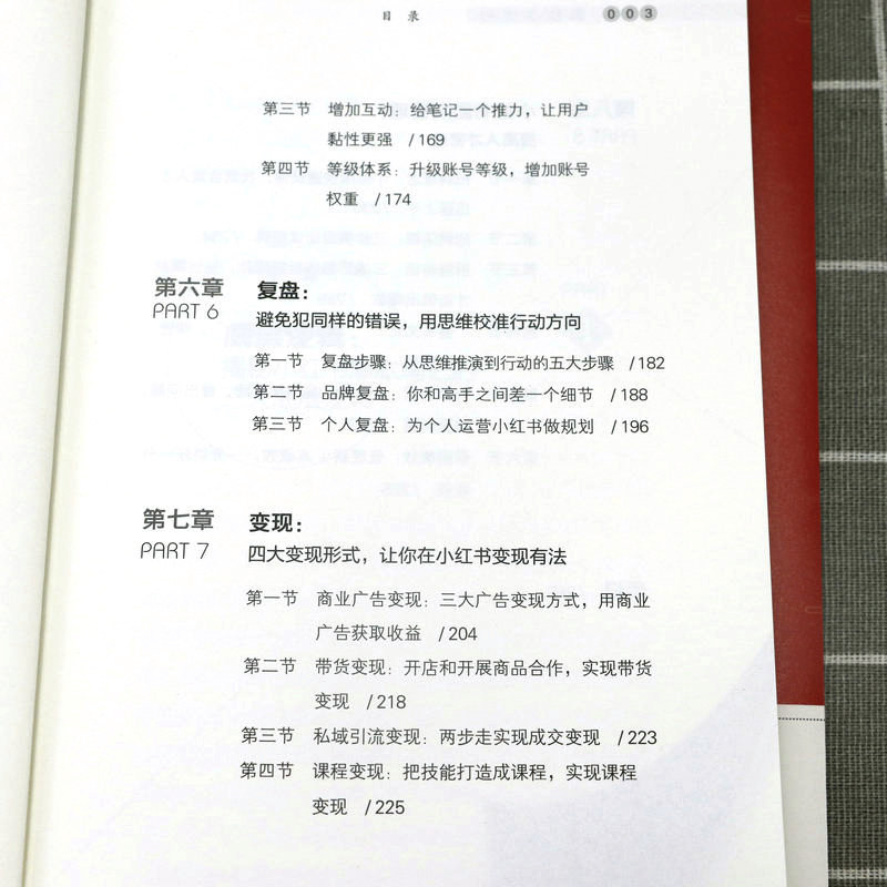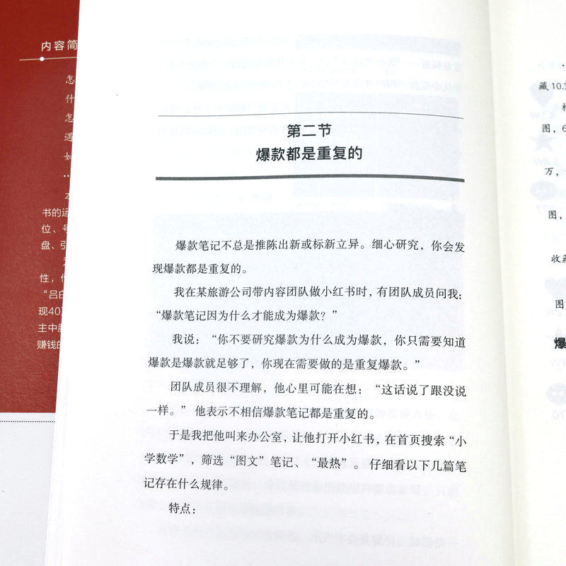 第一章底层逻辑:揭秘小红书爆款笔记的三大底层逻辑 第一节做内容不要自我陶醉/002 第二节爆款都是重复的/010 第三节要非常专一/023 第二章精准定位:给用户一个关注你的理由 第一节“定位三问法”:找到你的精准定位/030 第二节聚焦法:先发散再聚焦/048 第三章“号设化”运营:做好小红书的“四件套”,快速吸睛涨粉 第一节昵称:用户认识你的第一张名片/058 第二节头像:你的头像可能价值百万/067 第三节主页:直观清晰体现你的价值/075 第四节简介:一句话讲明你是做什么的/080 第四章爆款笔记:从零开始做出爆款笔记 第一节选题:建立你的爆款选题库/088 第二节标题:8种模式+“四步法”+“三段式”模板,打造出爆款标题/106 第三节图片:利用手机软件轻松搞定封面和内页图/125 第四节内容:套用“开头+中间+结尾”三段式模板,做出爆款内容/136 第五章运营赋能:掌握流量密码,运营提升关键指标 第一节推荐机制:小红书流量推荐背后的秘密/146 第二节发布时间:抓准用户活跃时间,提高笔记成为爆款的概率/166 第三节增加互动:给笔记一个推力,让用户黏性更强/169 第四节等级体系:升级账号等级,增加账号权重/174 第六章复盘:避免犯同样的错误,用思维校准行动方向 第一节复盘步骤:从思维推演到行动的五大步骤/182 第二节品牌复盘:你和高手之间差一个细节/188 第三节个人复盘:为个人运营小红书做规划/196 第七章变现:四大变现形式,让你在小红书变现有法 第一节商业广告变现:三大广告变现方式,用商业广告获取收益/204 第二节带货变现:开店和开展商品合作,实现带货变现/218 第三节私域引流变现:两步走实现成交变现/223 第四节课程变现:把技能打造成课程,实现课程变现/225 第八章小红书团队管理:提高人才密度 第一节招聘理念:小范围快速试错,找到合适人才迅速上手/230 第二节招聘流程:三步搞定面试招聘/234 第三节拆解培训:三遍拆解法拆解爆款,见过爆款才能做出爆款/239 第四节“赛马文化”:“分裂”和“归一”,快速做出爆款/248 第五节内部管理:头、中、尾分部管理,提出问题,解决问题/252 第六节薪酬绩效:低底薪+高绩效,一分耕耘一分收获/255 后记/259