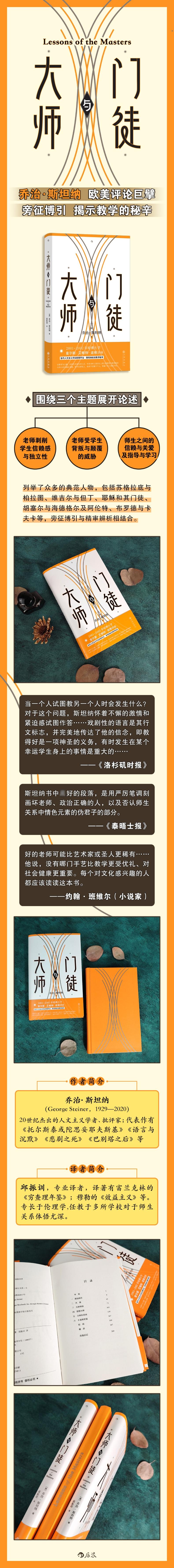 ◎ 《大师与门徒》基于斯坦纳在哈佛大学所做的六次诺顿讲座,探讨文化技艺传承的核心环节——教学。 ◎ 作者在书中列举了众多的典范人物,包括苏格拉底与柏拉图、维吉尔与但丁、耶稣和其门徒、胡塞尔与海德格尔及阿伦特、布罗德与卡夫卡等,旁征博引与精审辨析相结合。 ◎ 作者始终围三个主题展开论述,老师剥削学生信赖感与独立性、老师受学生背叛与颠覆的威胁、师生之间的信赖与关爱及指导与学习。 ◎ 作为欧美评论大师的乔治·斯坦纳,批评视野宽广,创作活力巨大,在此系列讲座中得到了完美的展示。