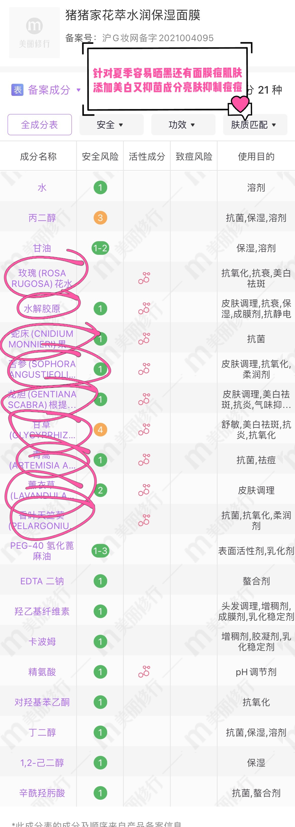 本款面膜就是除了添加高比例玫瑰花萃补水亮肤,针对夏季面膜脸容易痘痘的肌肤,其他添加的成分就是美白又抑菌缓解痘痘的成分,如下图备案全成分所示: