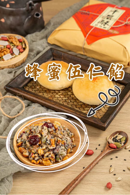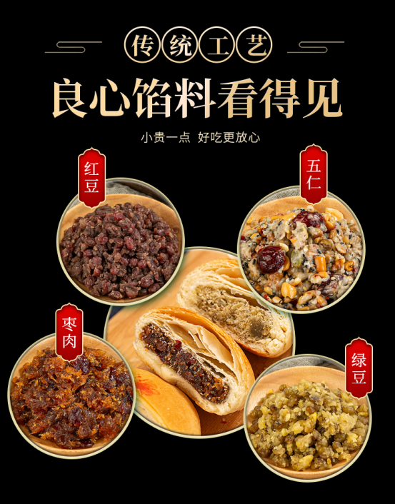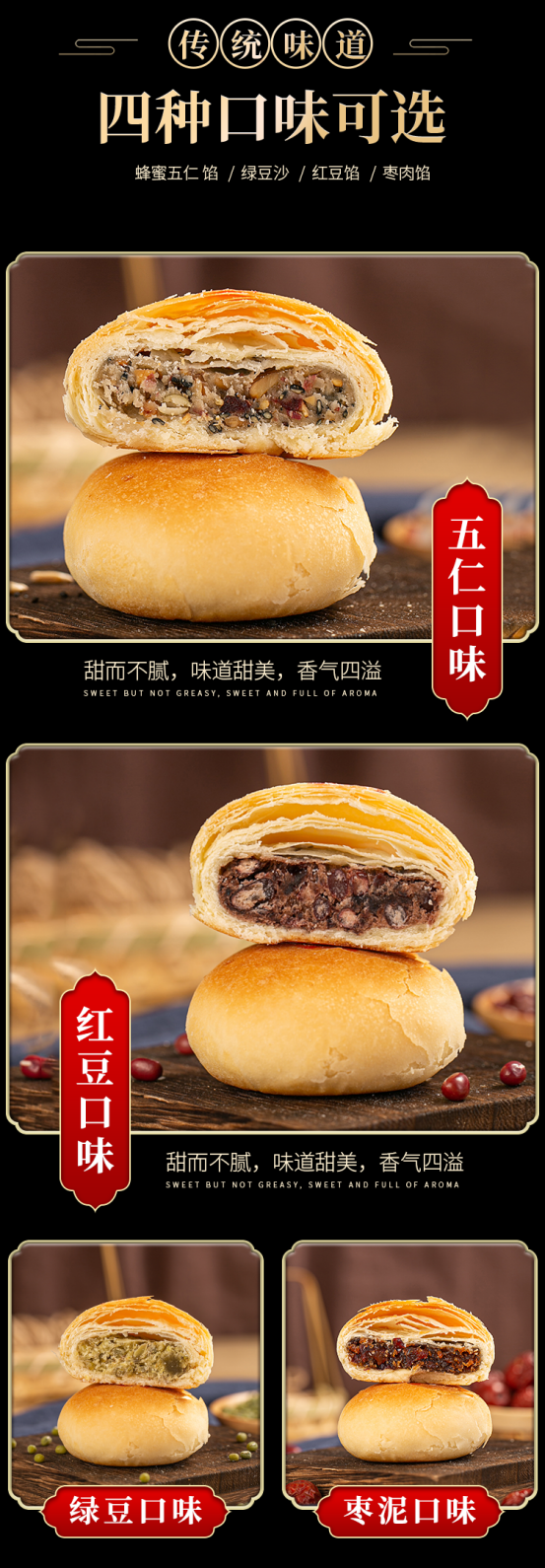 【规格】:四种口味混合装(蜂蜜五仁/枣肉馅儿/纯红豆馅儿/纯绿豆馅儿)两盒装,一包有4个,4个口味各一个份