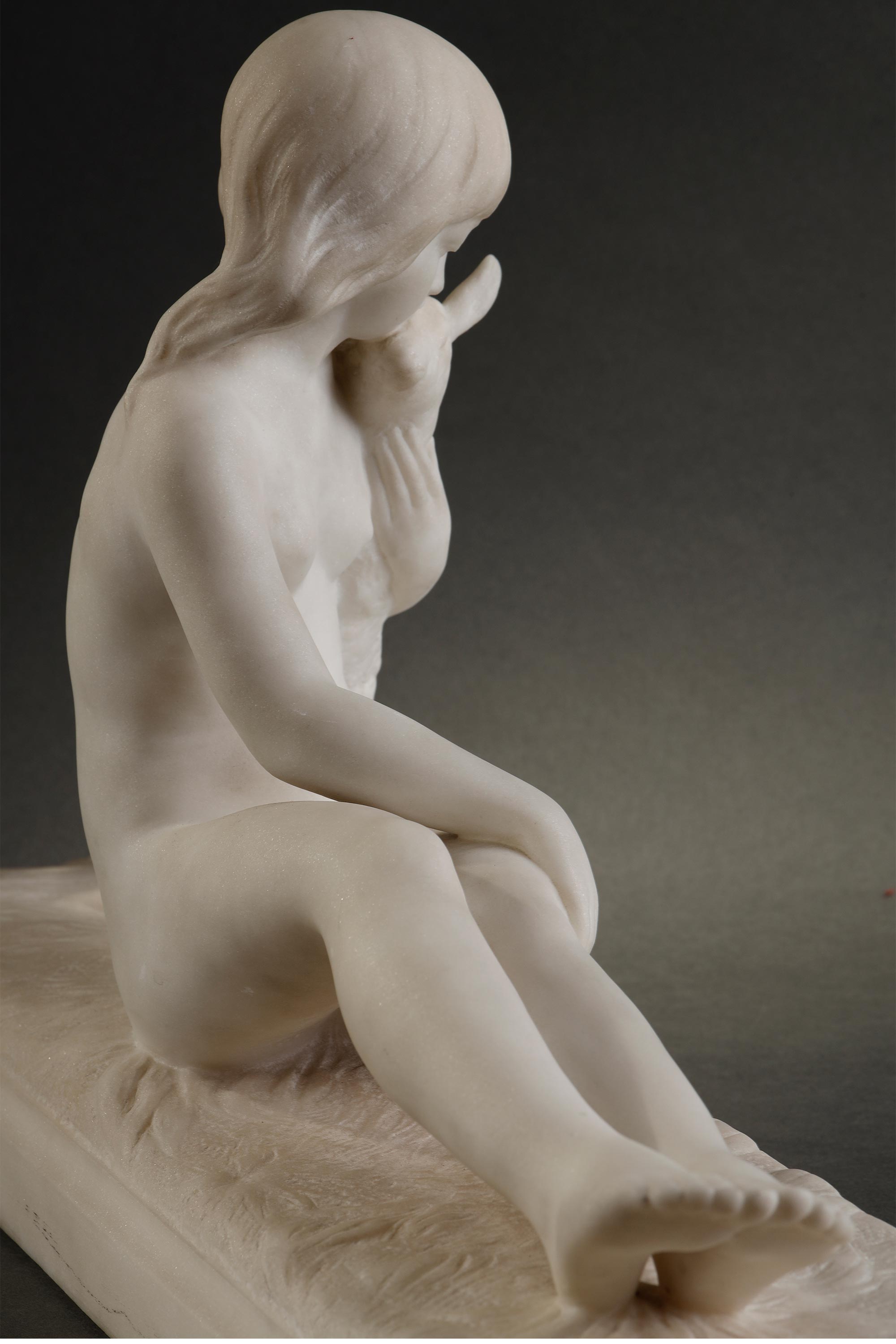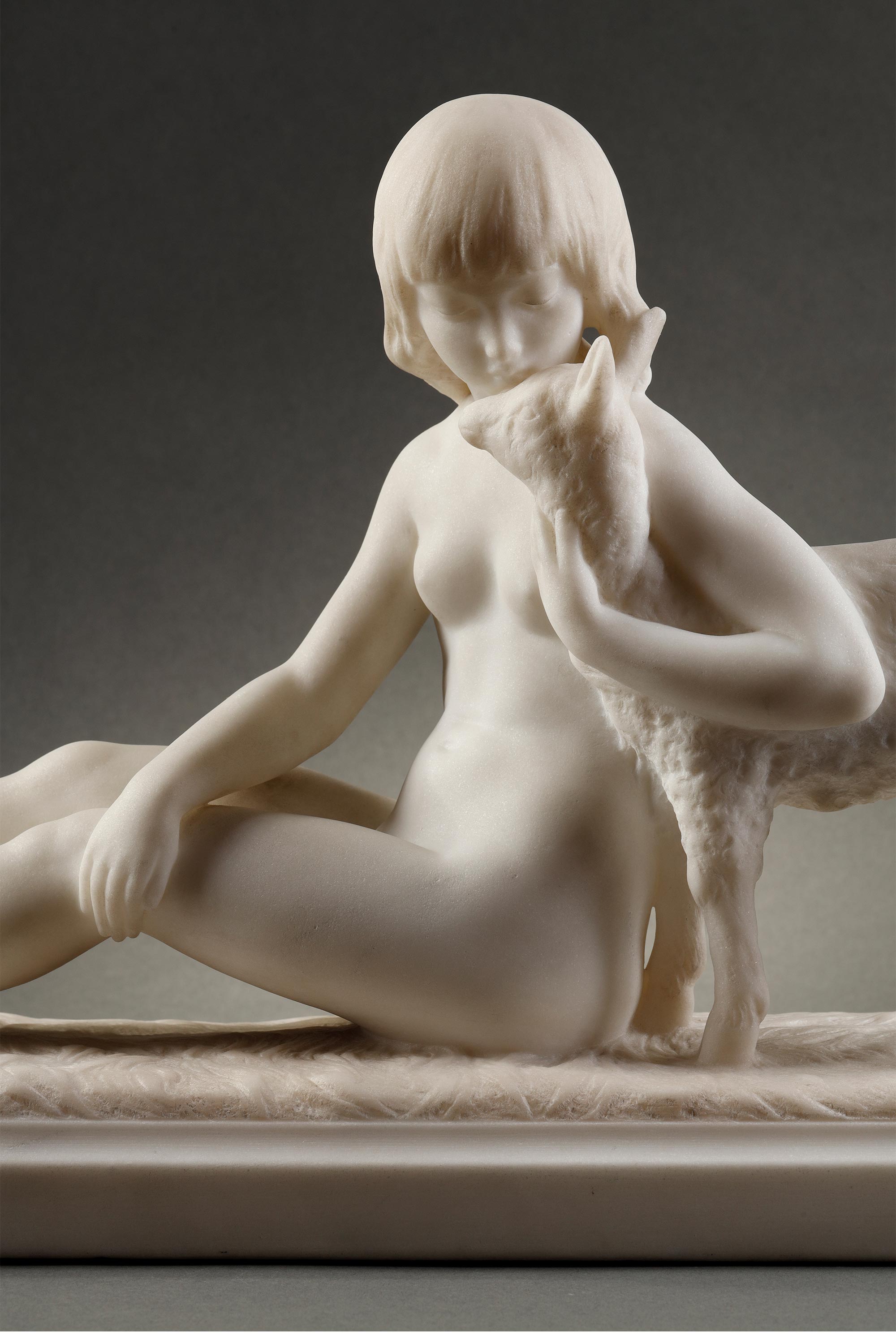 20世纪上半叶法国雕塑家Albert Patrisse签名创作卡拉拉大理石雕塑作品《孩童与羔羊》
