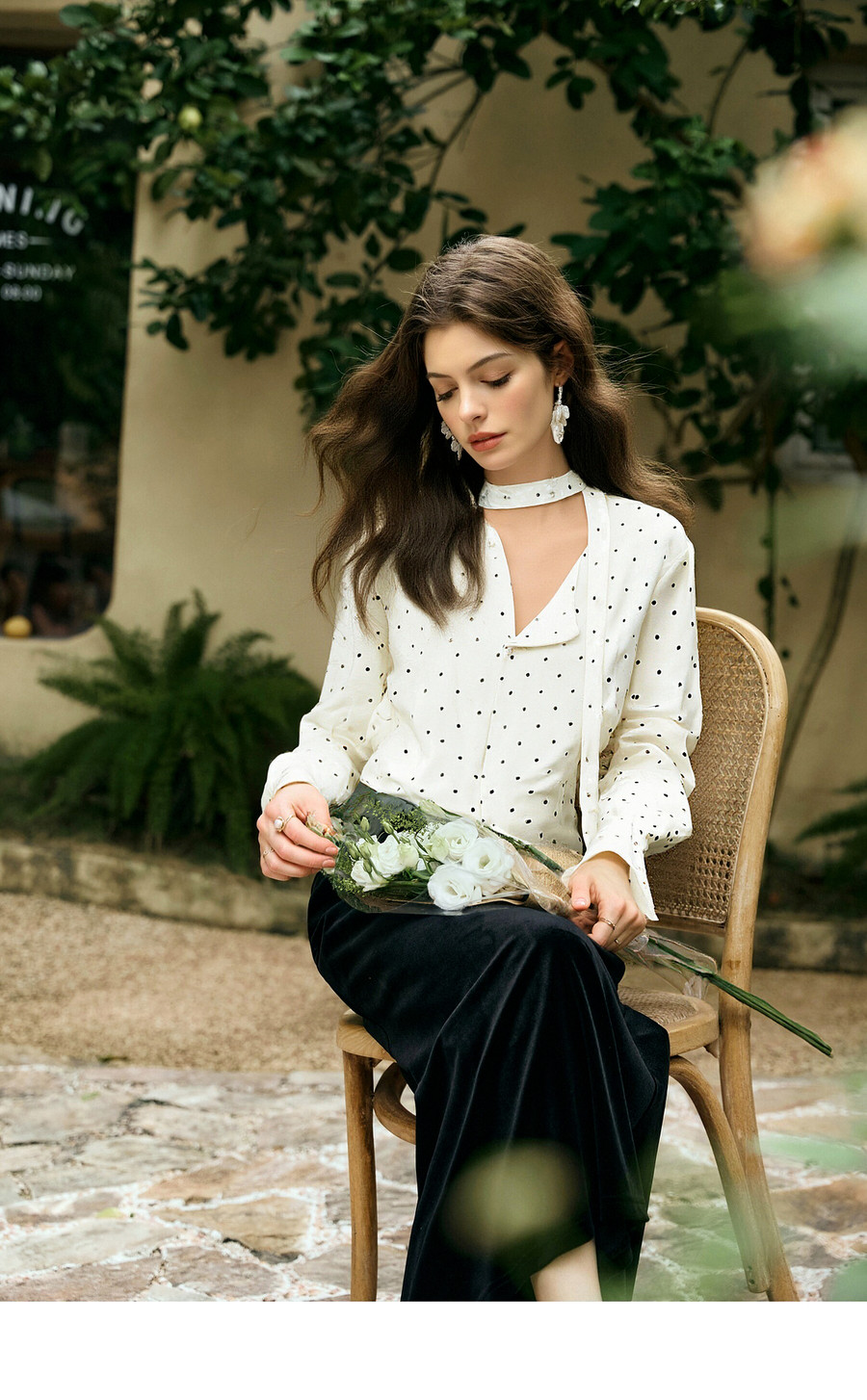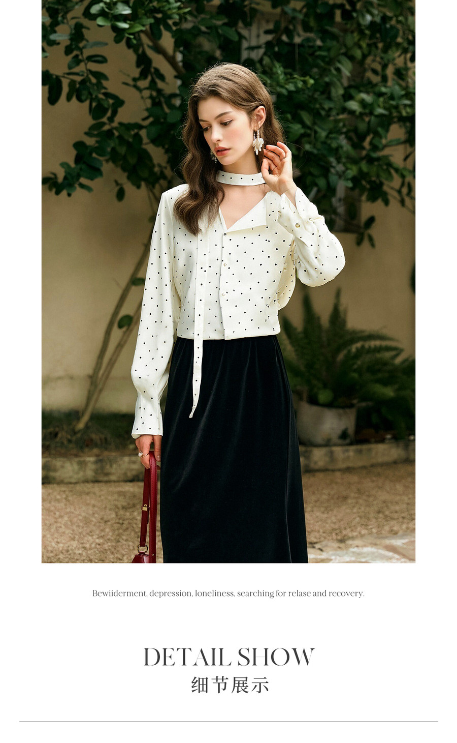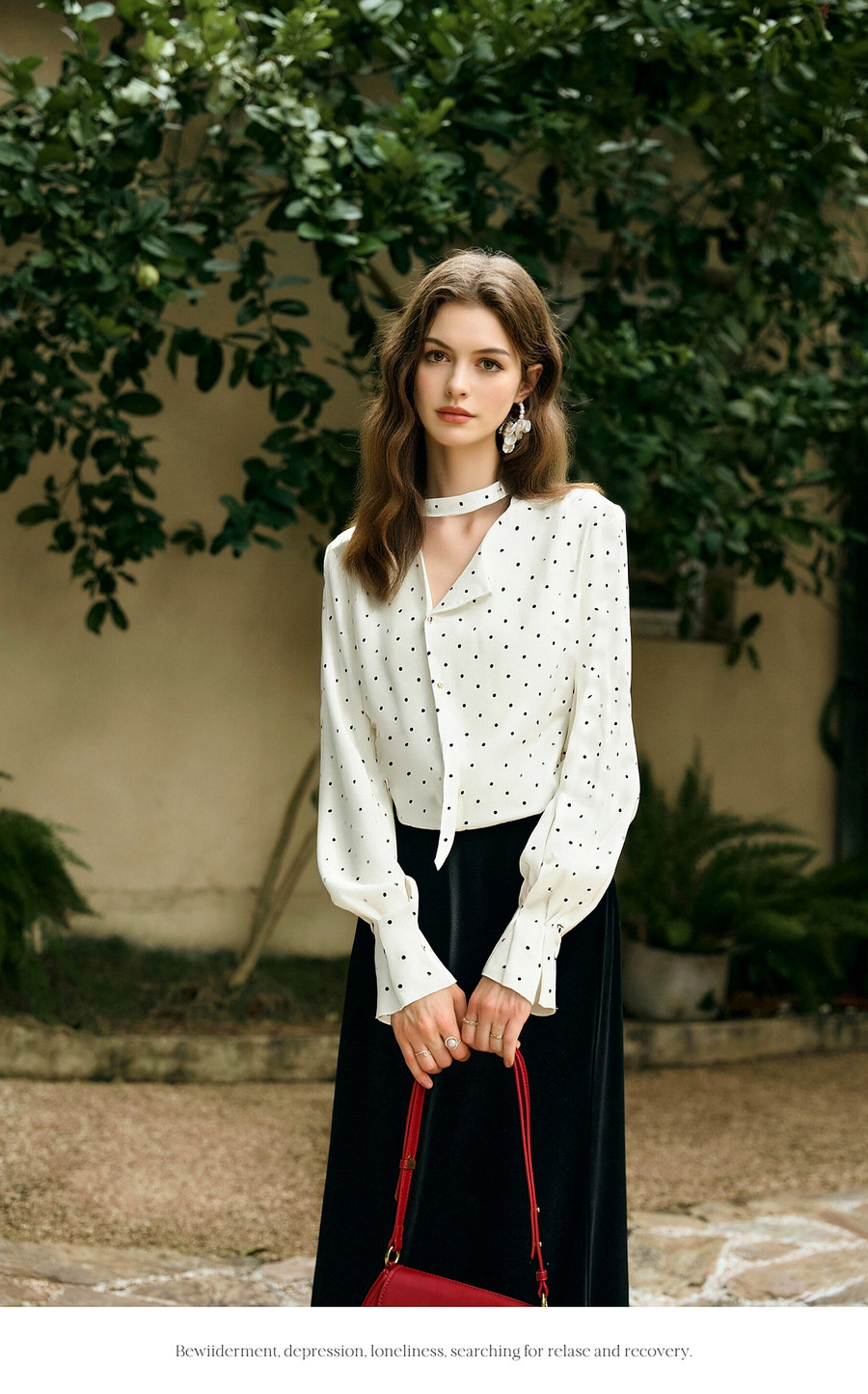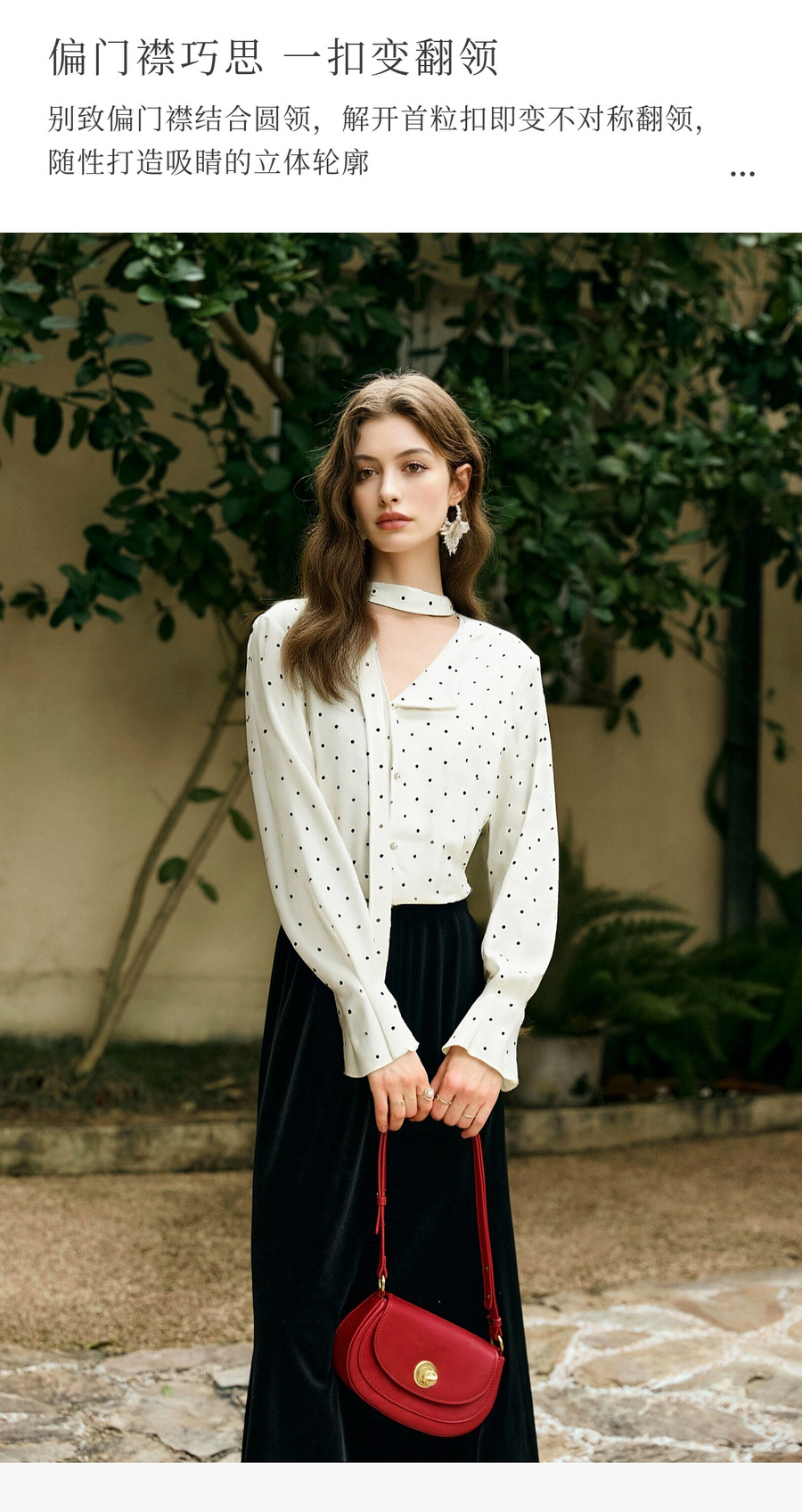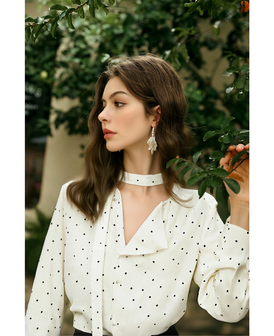欧芮儿法式浪漫飘带圆领波点雪纺衫女春季2026新款宽松长袖衬衫