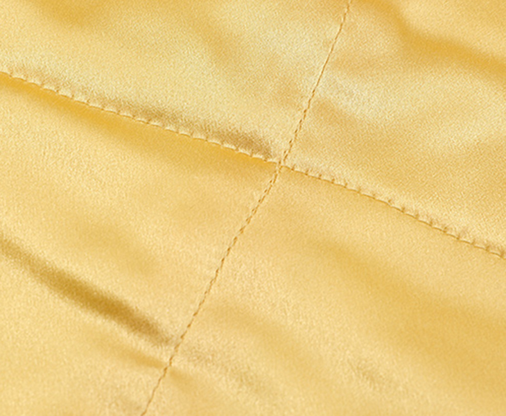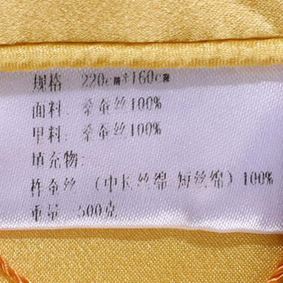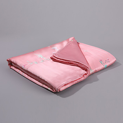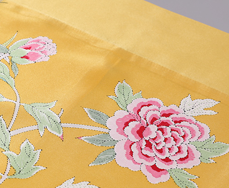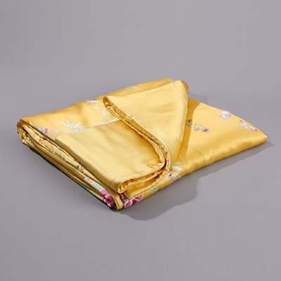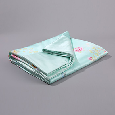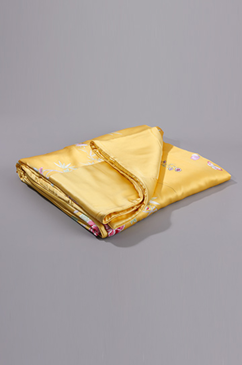 采用柔滑轻盈的桑蚕丝面料,搭配满庭芳的图案,含有幸福美满的寓意,整体布局均衡大气。