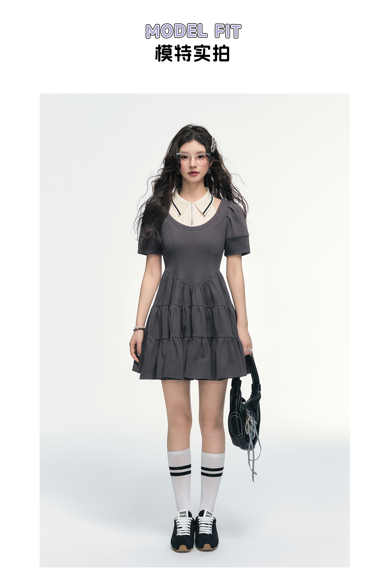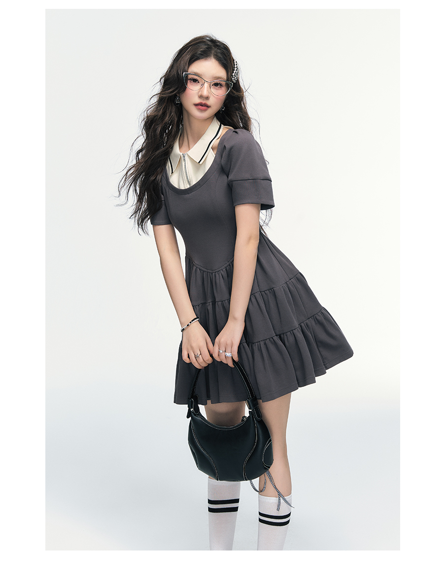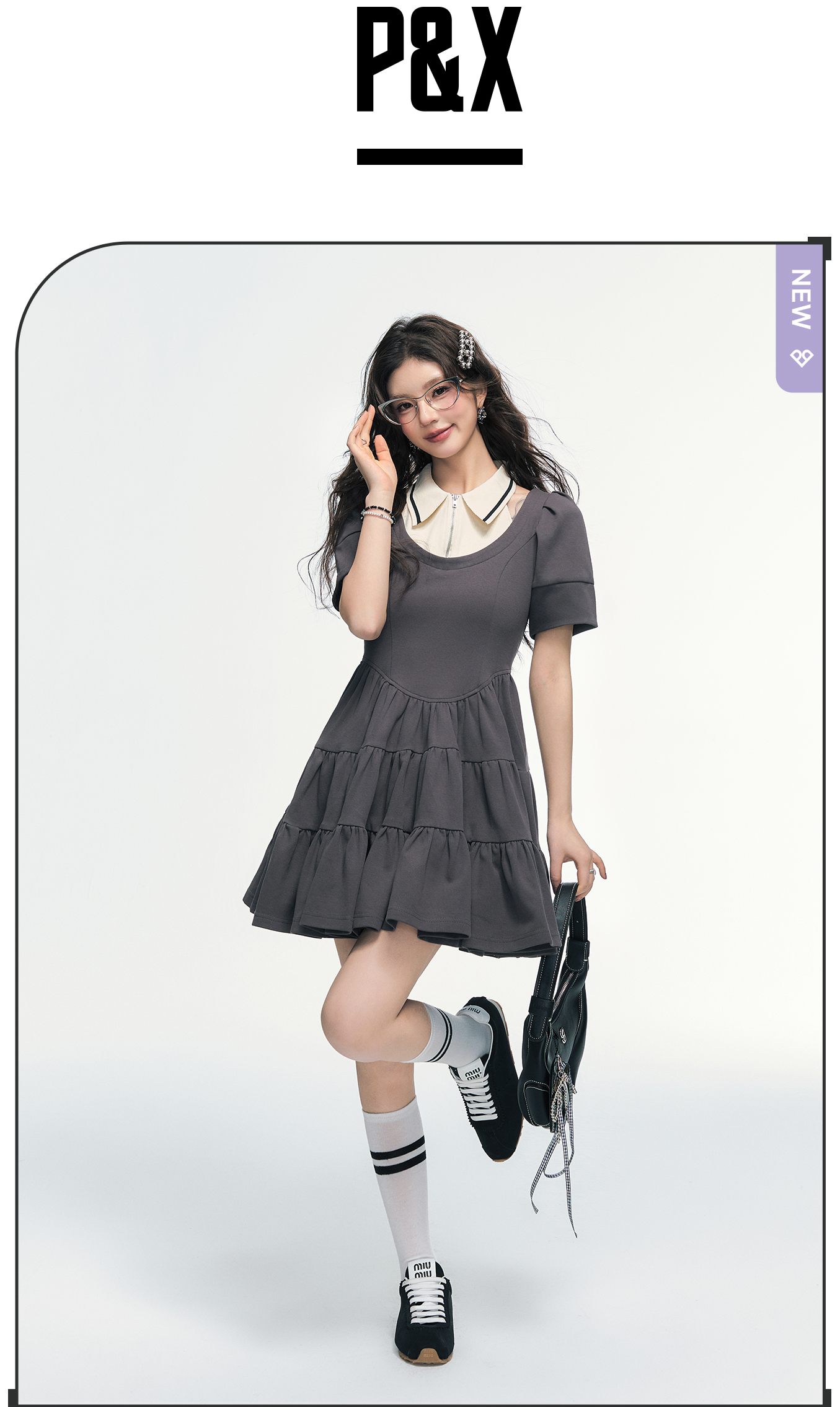 P&X设计师女装 撞色拼接假两件文艺针织连衣短裙 825208195 灰色