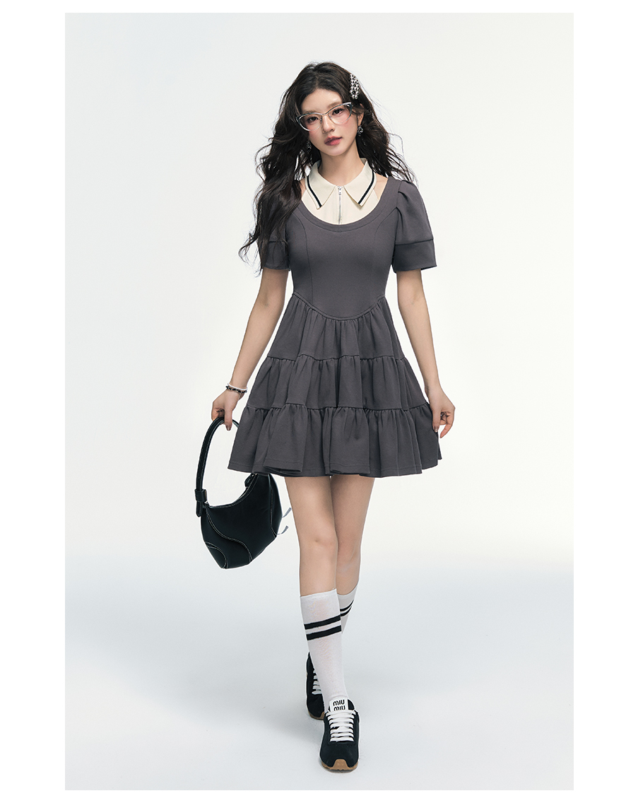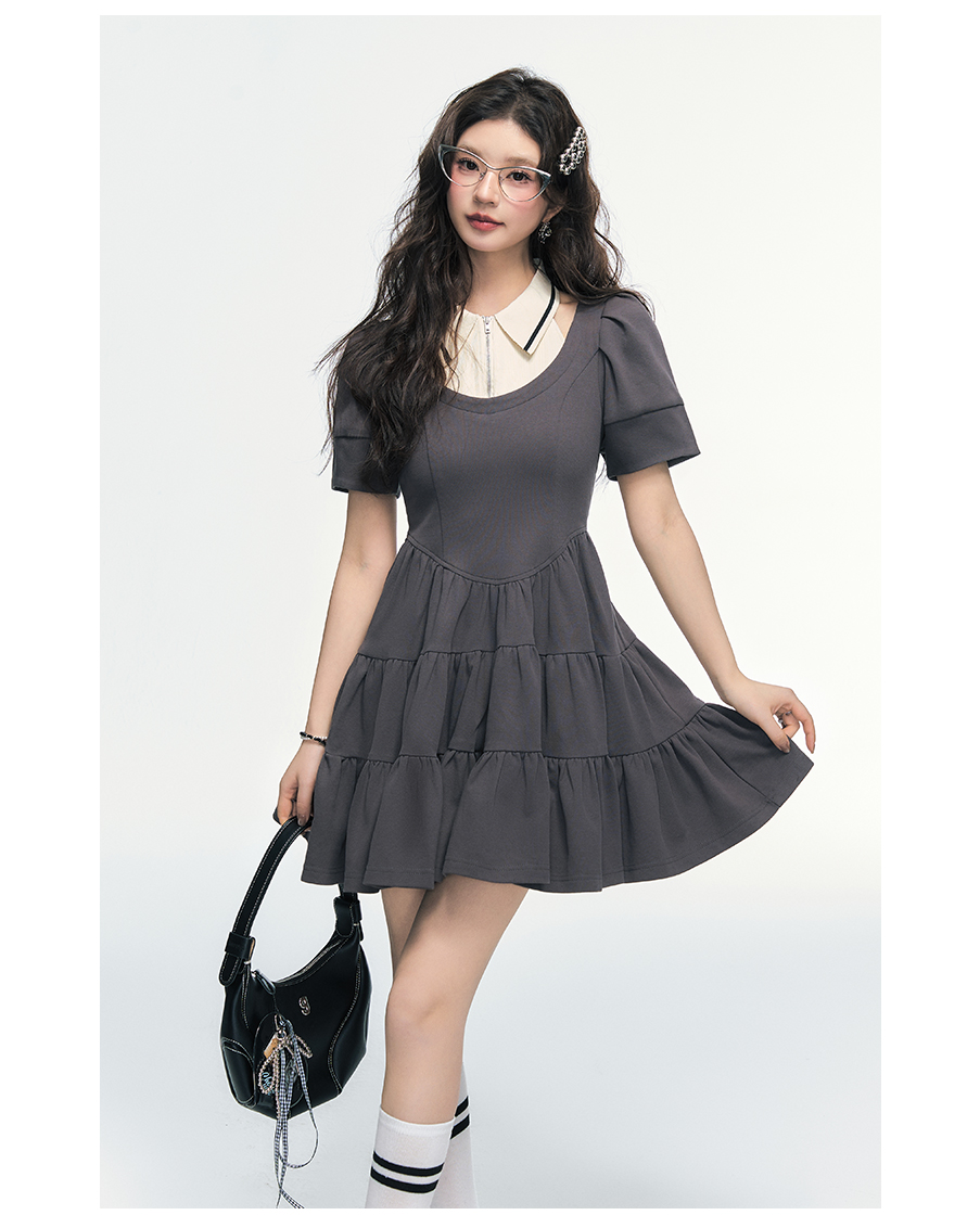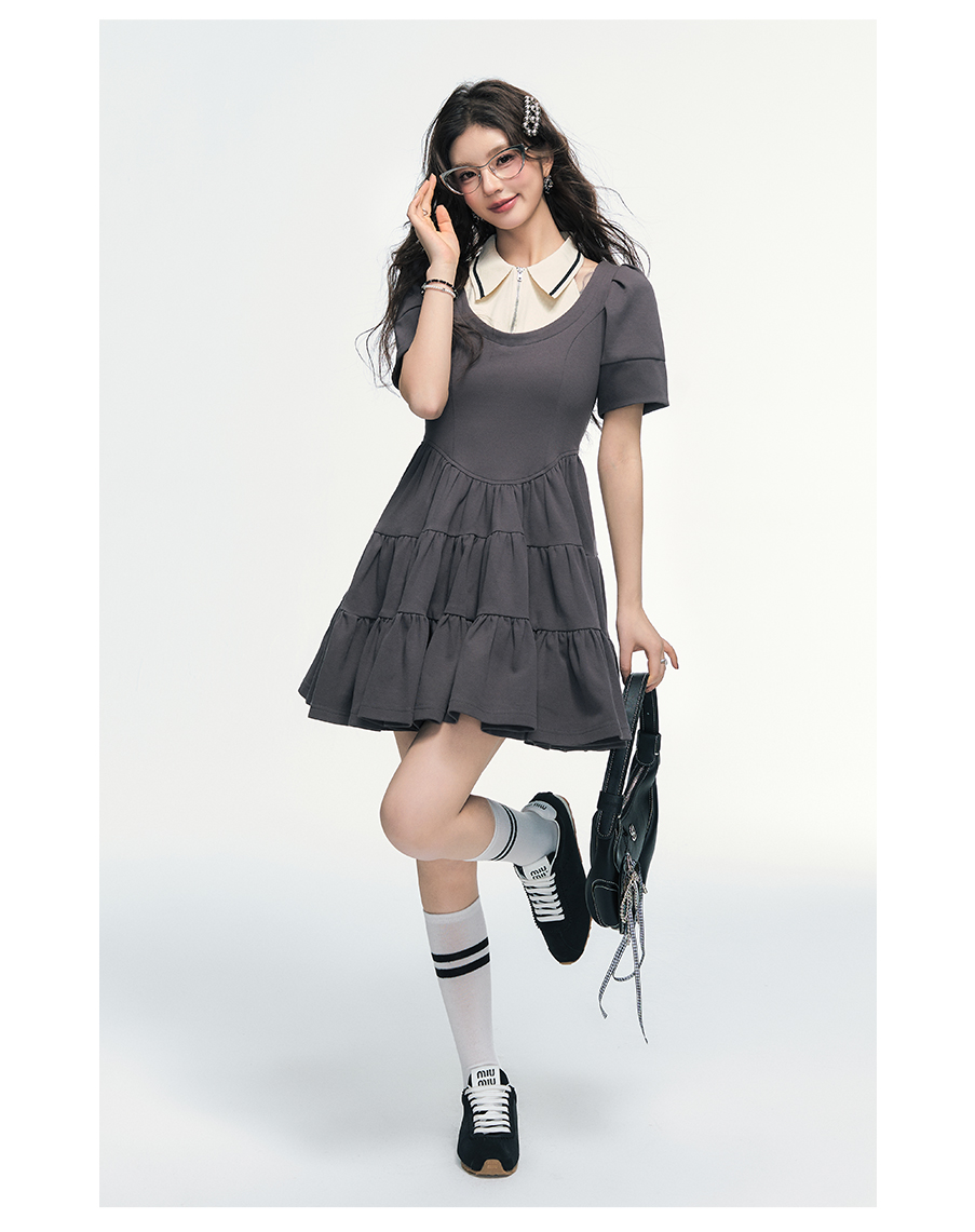 P&X设计师女装 撞色拼接假两件文艺针织连衣短裙 825208195 灰色