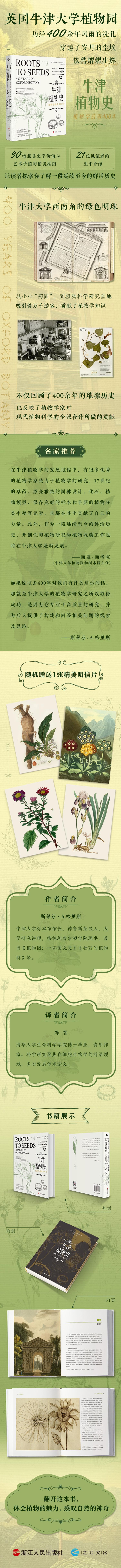作为英国历史最悠久的植物园,牛津大学植物园已有400余年的历史。如今,这座历经400年风雨洗礼的园林,穿越了岁月的尘埃,依然熠熠生辉。1621年,牛津大学植物园成立,它从仅作为药学院生产药草用地小小“药圃”,到大学植物科学研究的重要场所,它以自己古朴风貌和姿色各异的园林植物,吸引着世界各地前来观光的游客的同时,也在植物学和更广泛的植物科学领域贡献了大量的知识……《牛津植物史:植物学故事400年》介绍了诸多植物学家,以及过去四个世纪以来帮助我们改变对植物生物学认识的收藏。本书不是试图全面回顾牛津大学的植物学研究和教学,而是简要地反映了牛津大学植物学家对现代植物科学的全球合作所做的贡献。翻开这本书,你不但可以了解牛津大学植物学家对现代植物科学的全球合作所做的贡献,还可以体会植物的魅力,感叹自然的神奇。