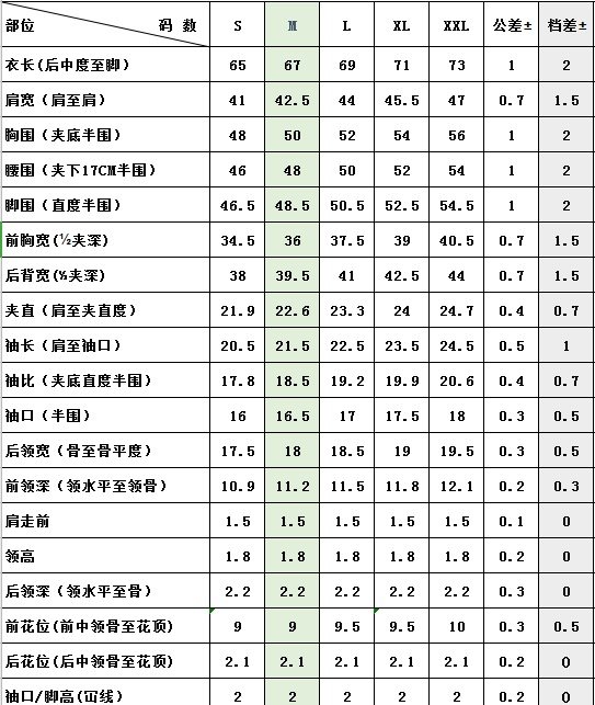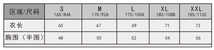 尺码表: