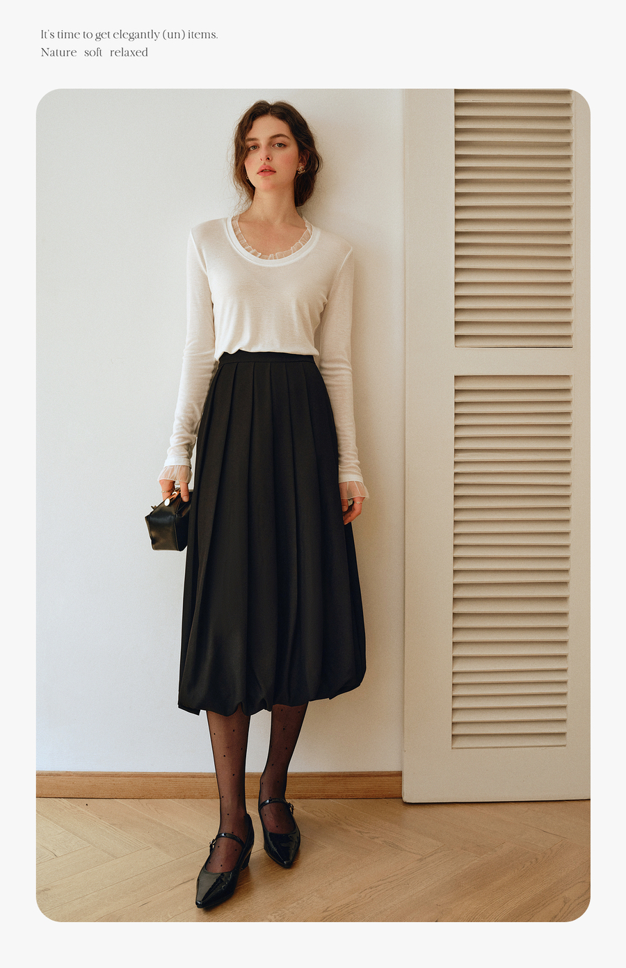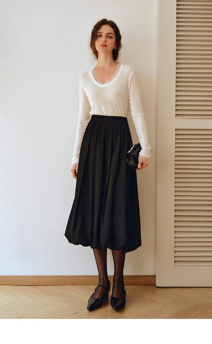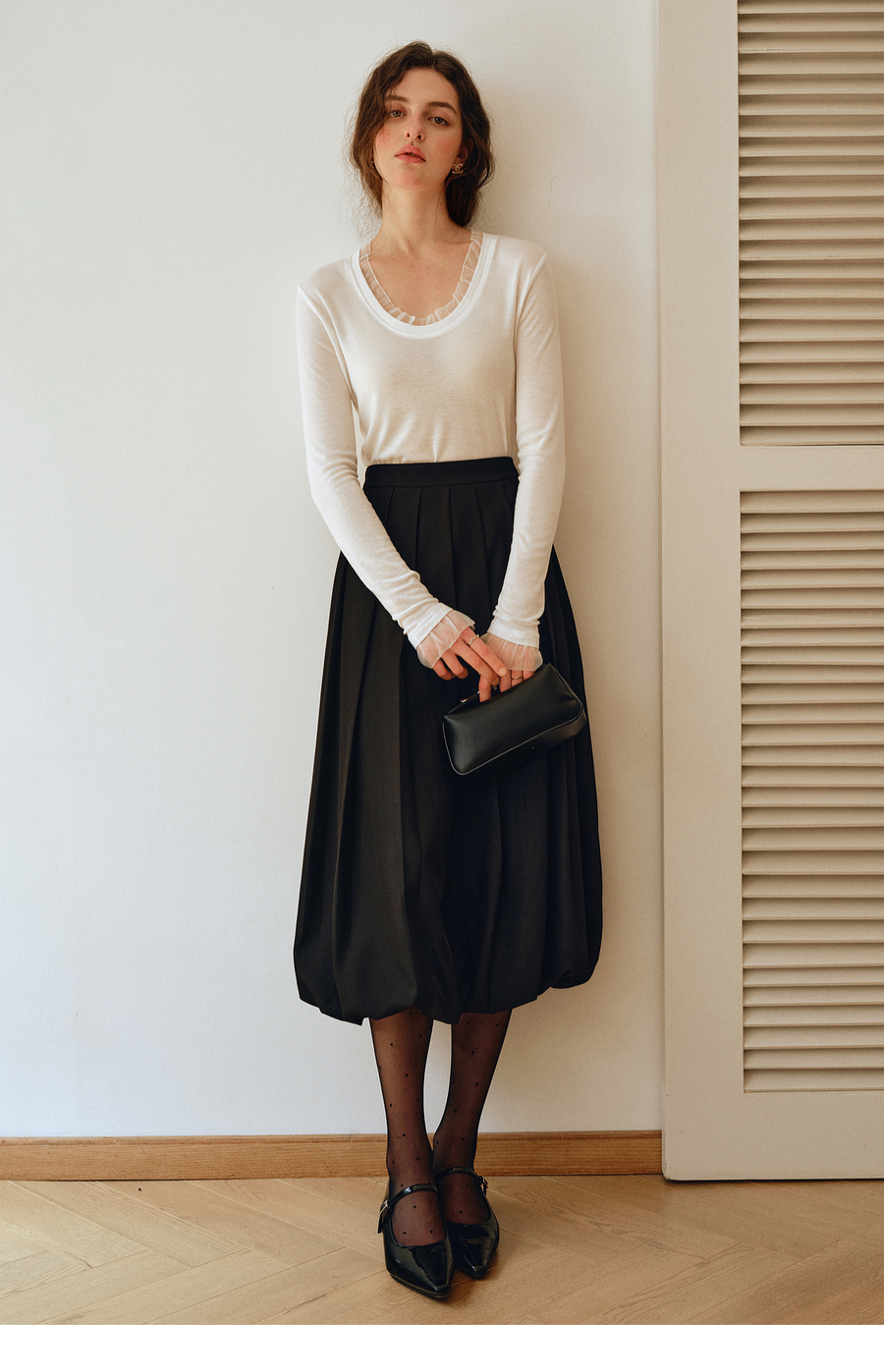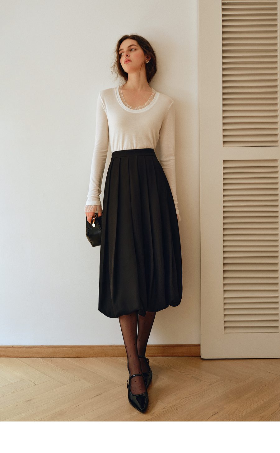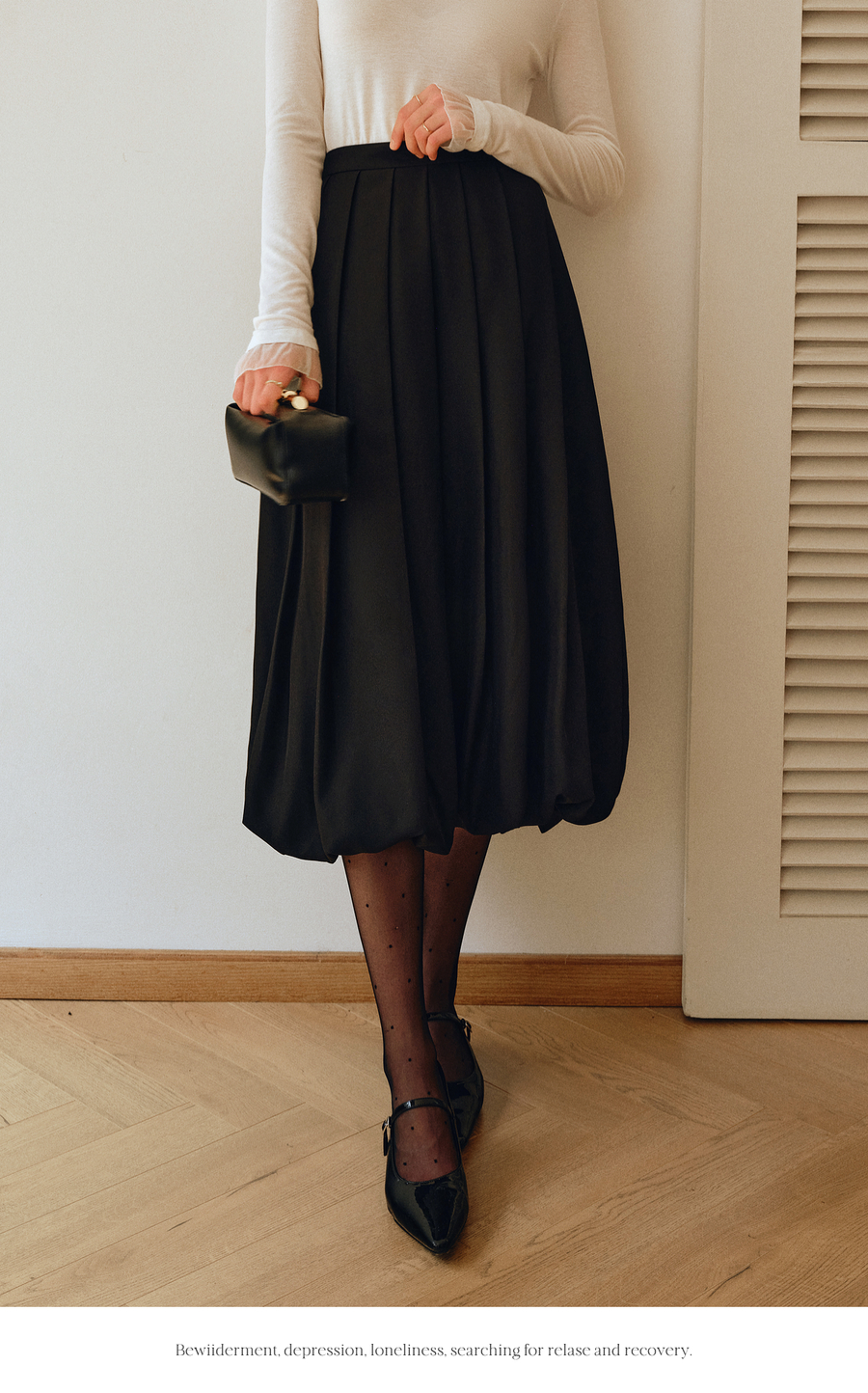 OLrain欧芮儿2025新款女秋季通勤黑色毛呢百褶花苞半身裙显瘦裙子