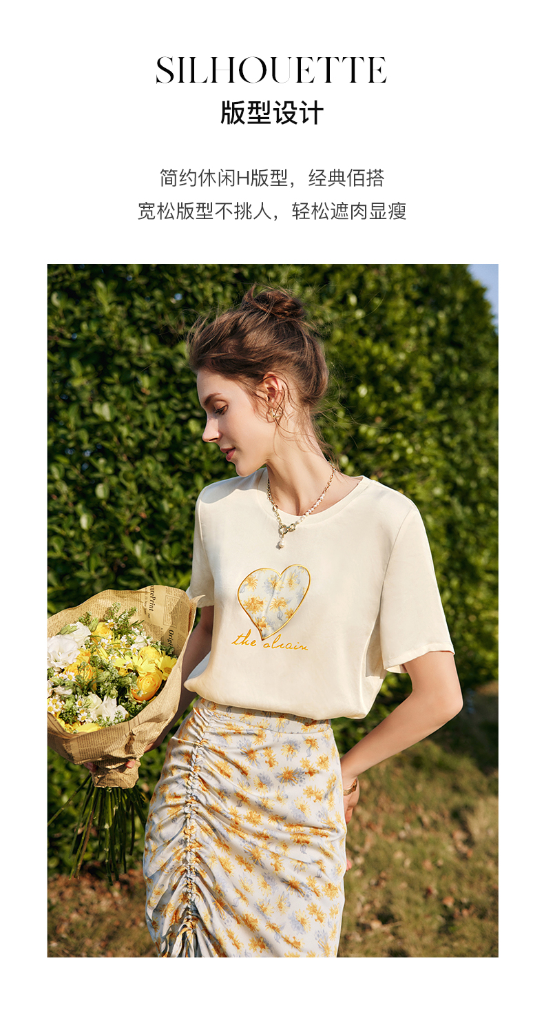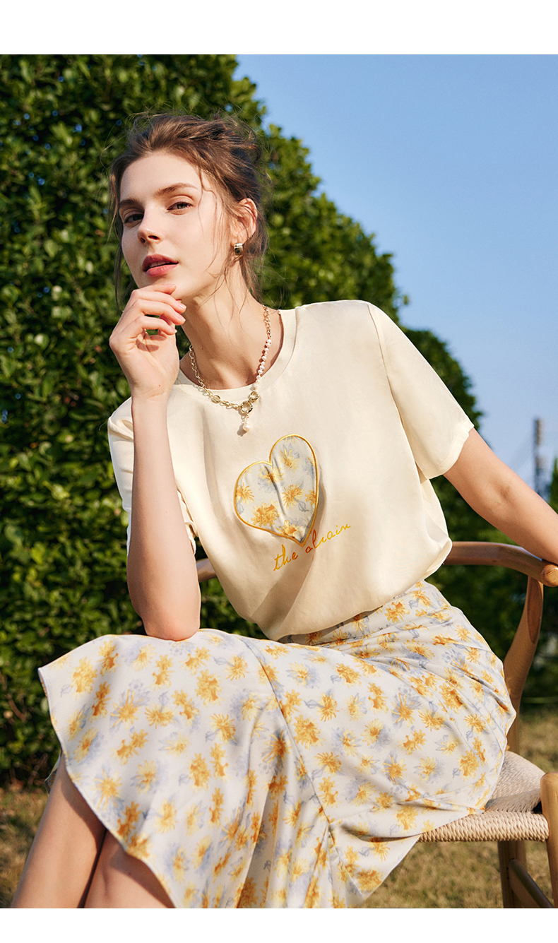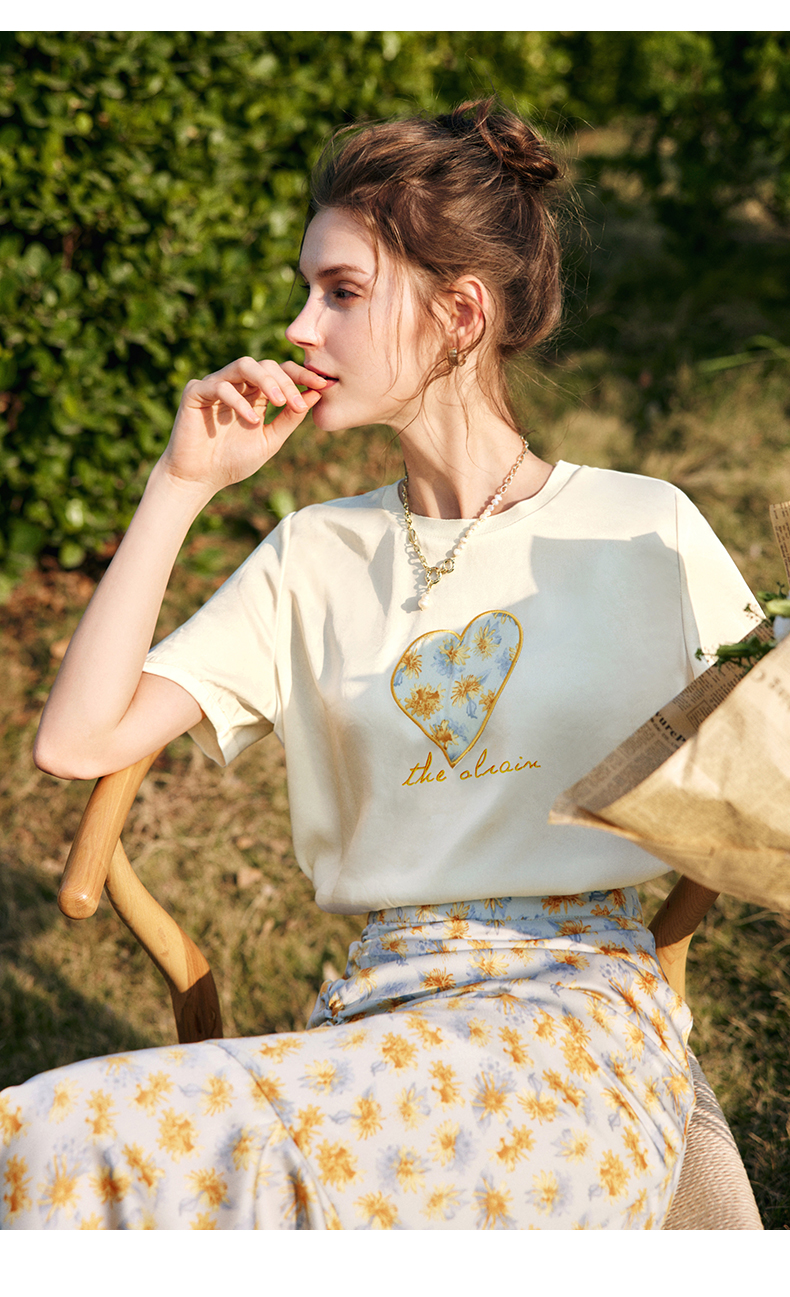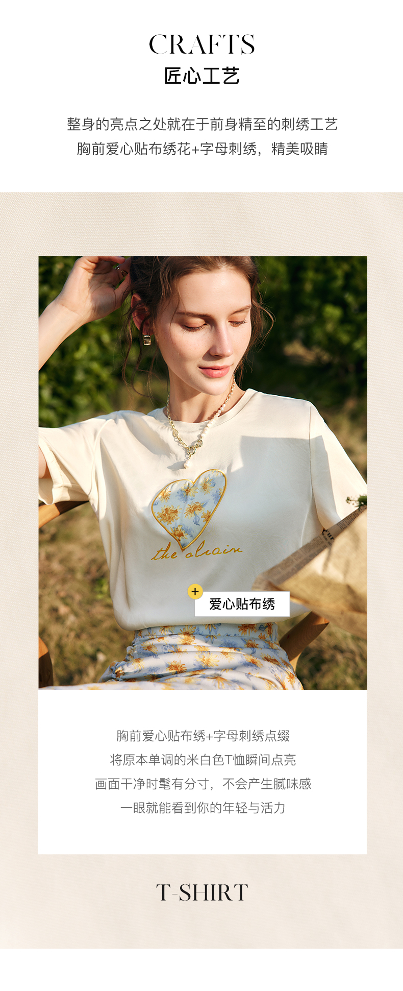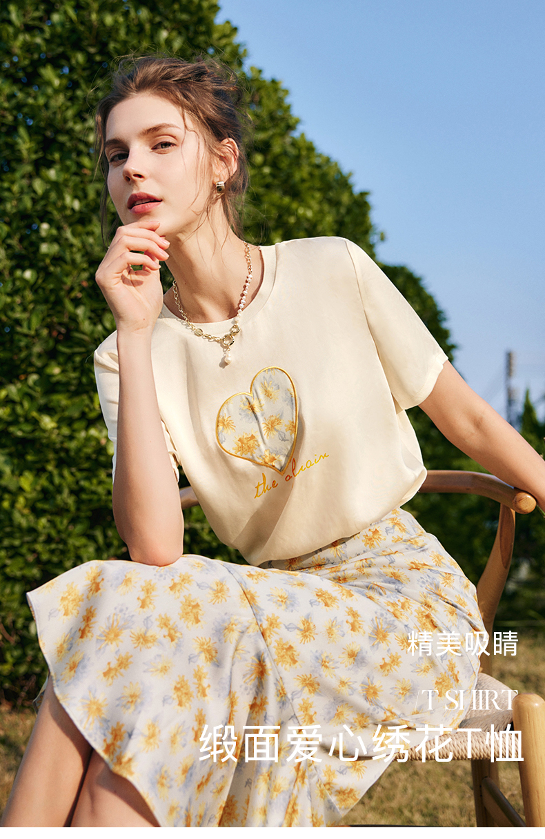 欧芮儿OLrain法式白色短袖t恤女夏季2022新款爱心刺绣缎面上衣