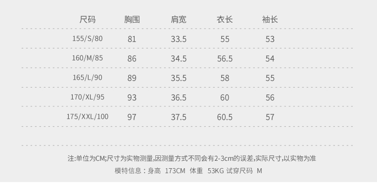 尺码: 80/155/S 85/160/M 90/165/L 95/170/XL 100/175/XXL