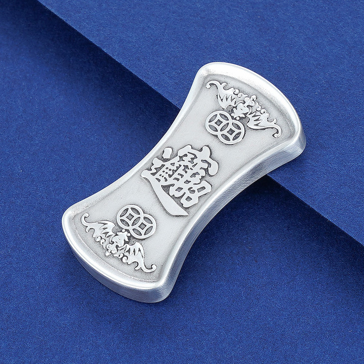 腰锭:古代流通货币,银锭分类之一,属小锭代表币形。形状如人畜之肾脏形,圆首束腰,故以外形称之。银光温润,雍容雅致,腰锭具有深厚的历史文化积淀,被视为富裕身份和贵族地位的象征。在如今,腰锭蕴含招财进宝,辟邪纳福的寓意,可作配饰、挂饰、装饰摆件等。