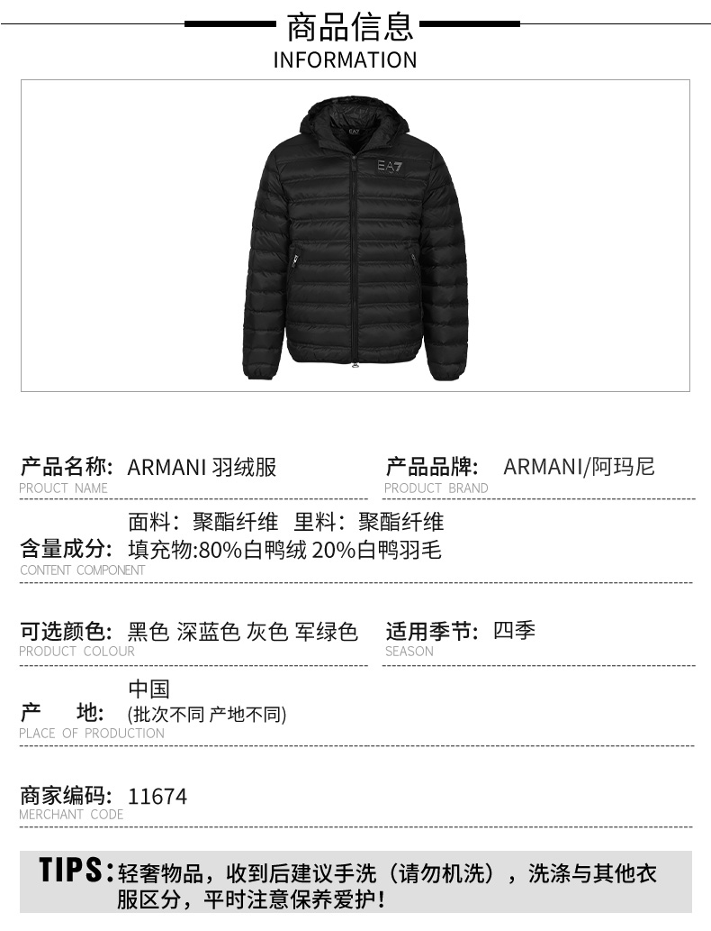 【超惠秒】Armani EA7 阿玛尼 男士 白鸭绒运动连帽羽绒服外套 11674