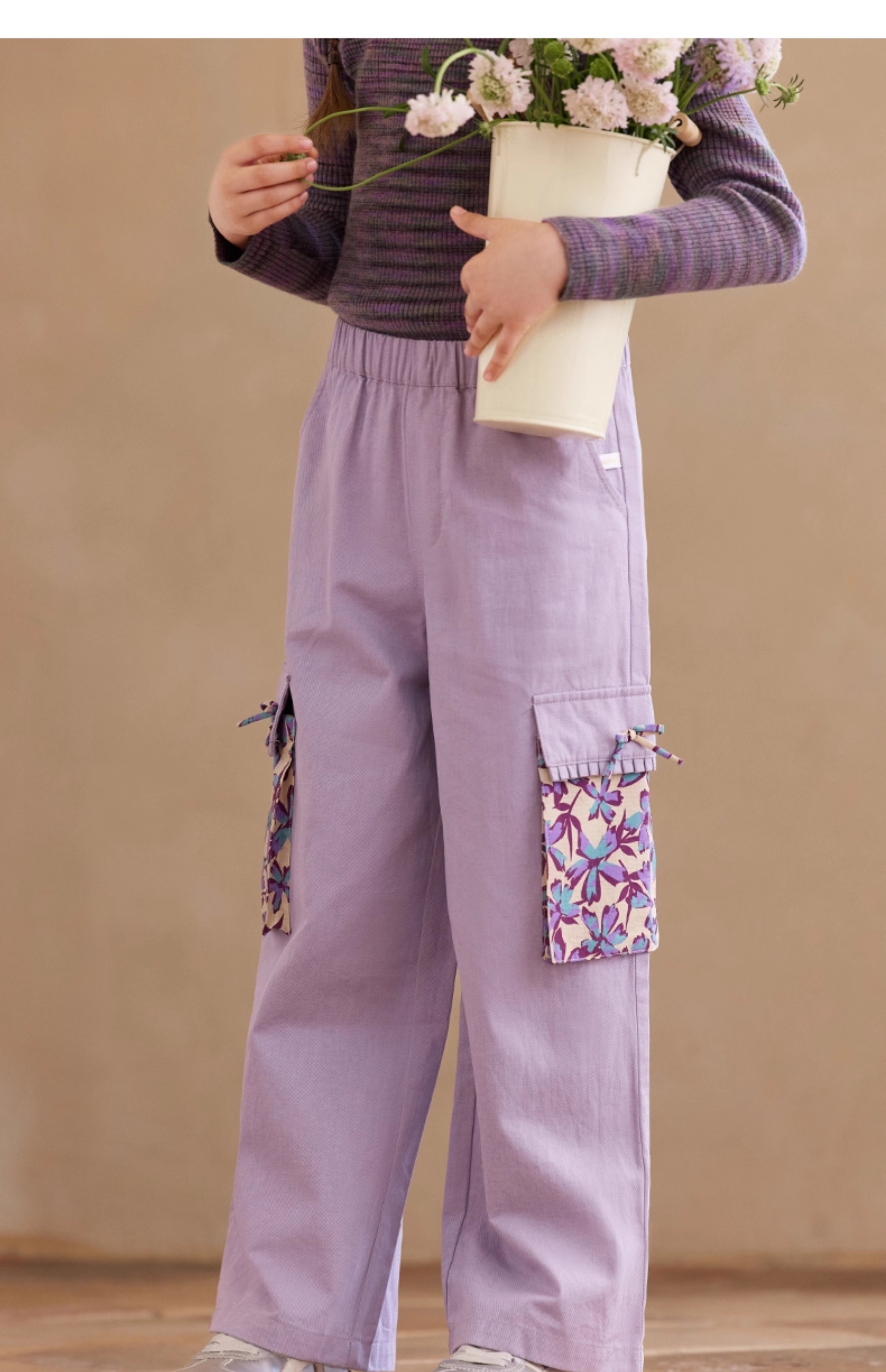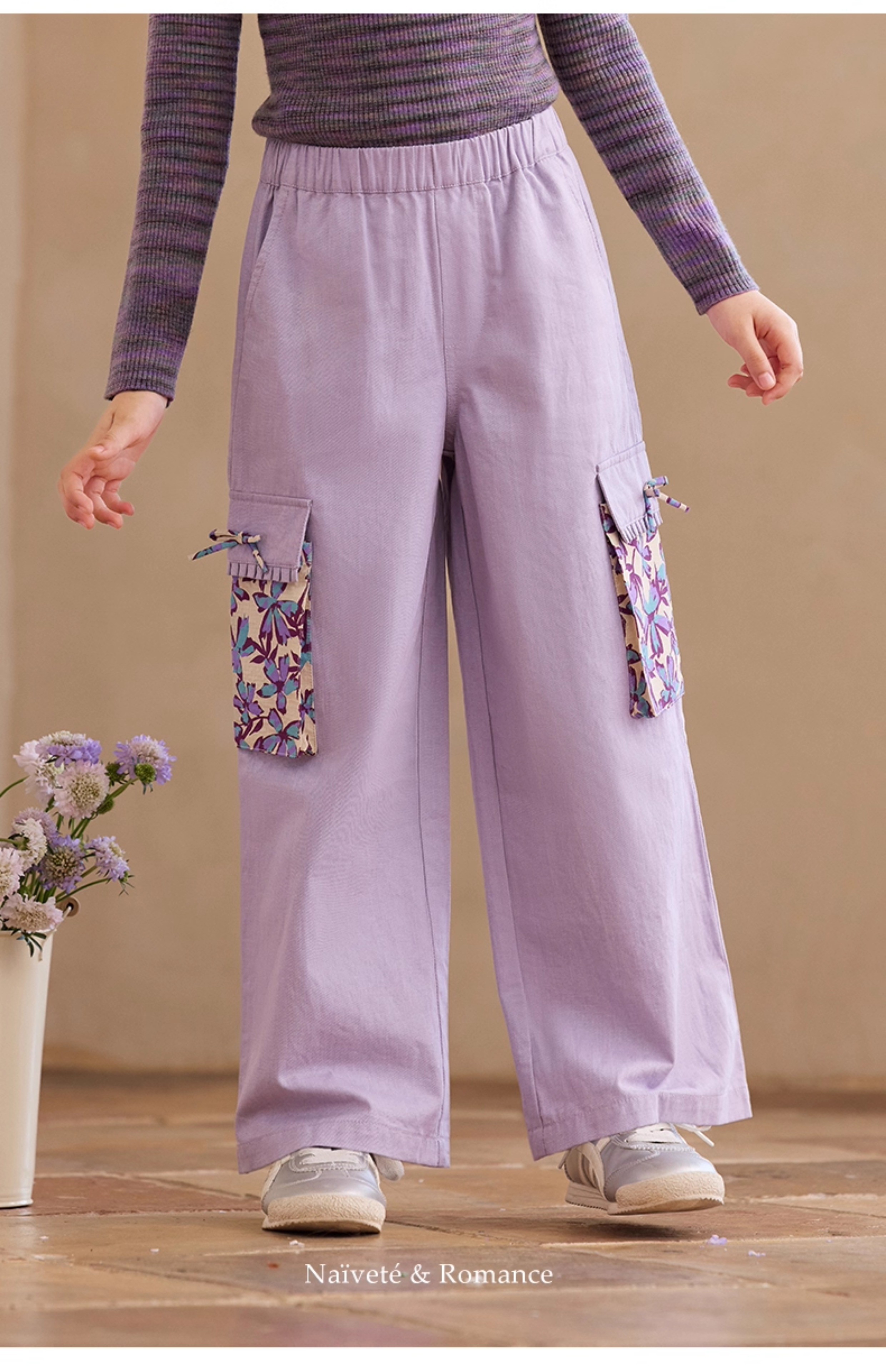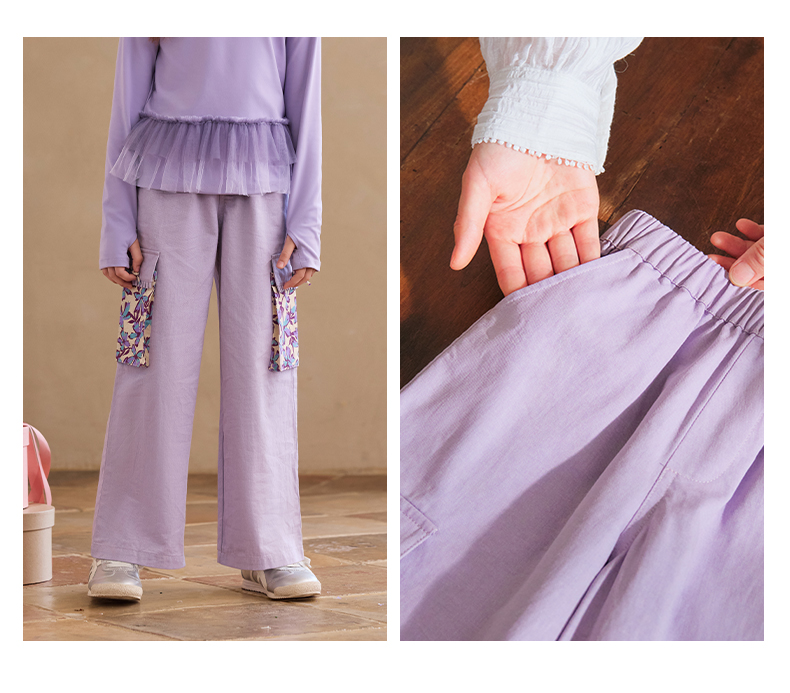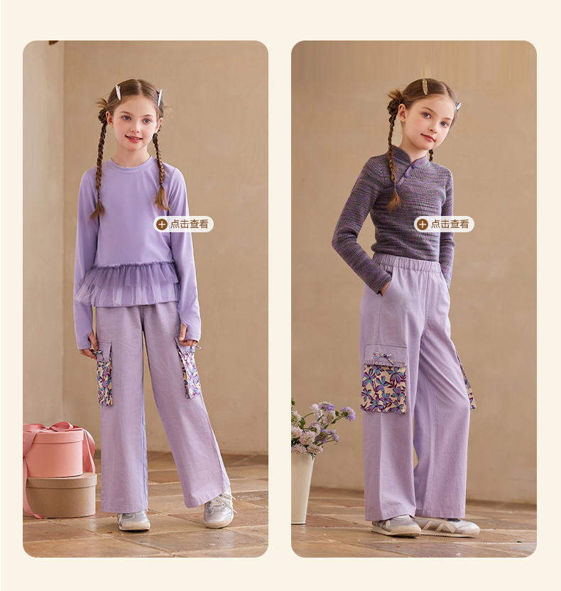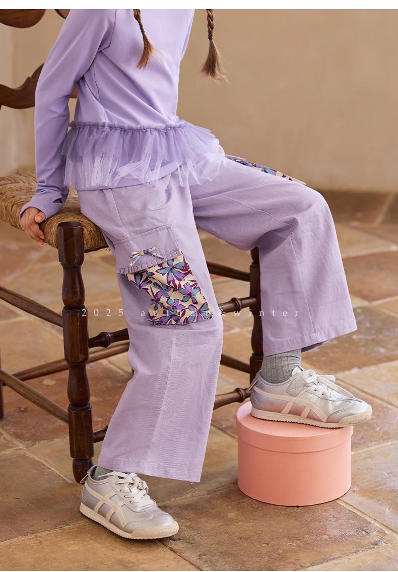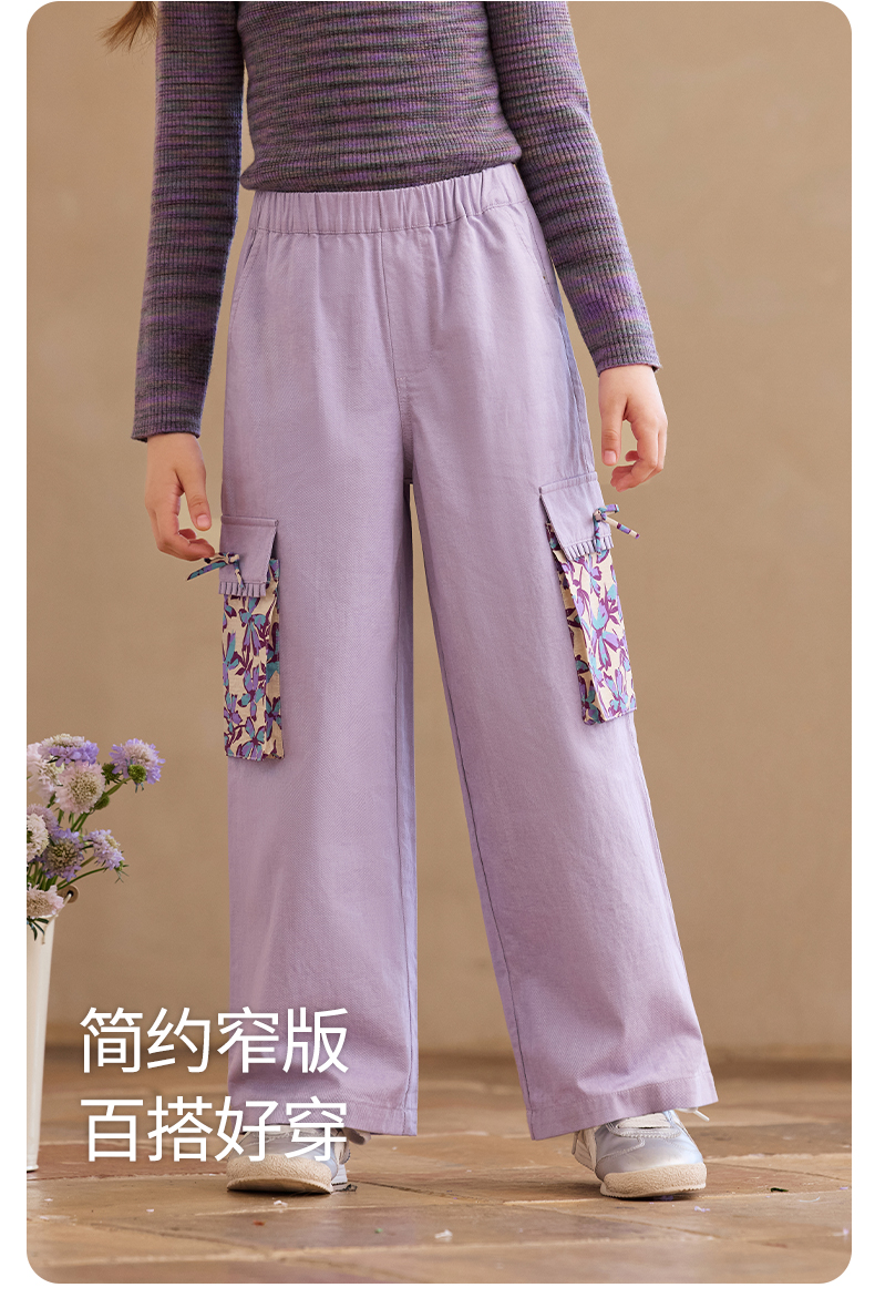 【云优选】Little Naive女童休闲裤秋季新款蝴蝶结花边口袋直筒裤儿童工装裤