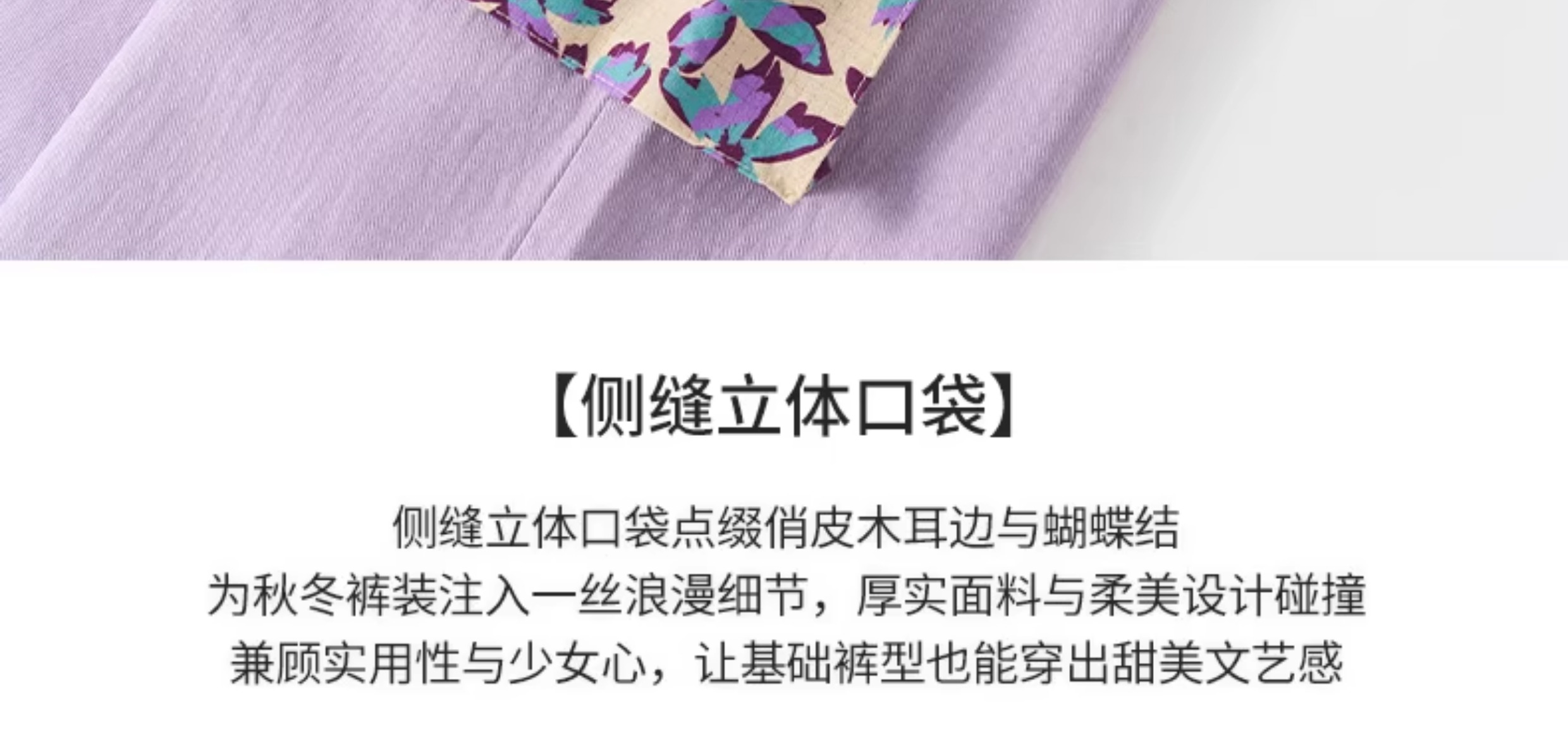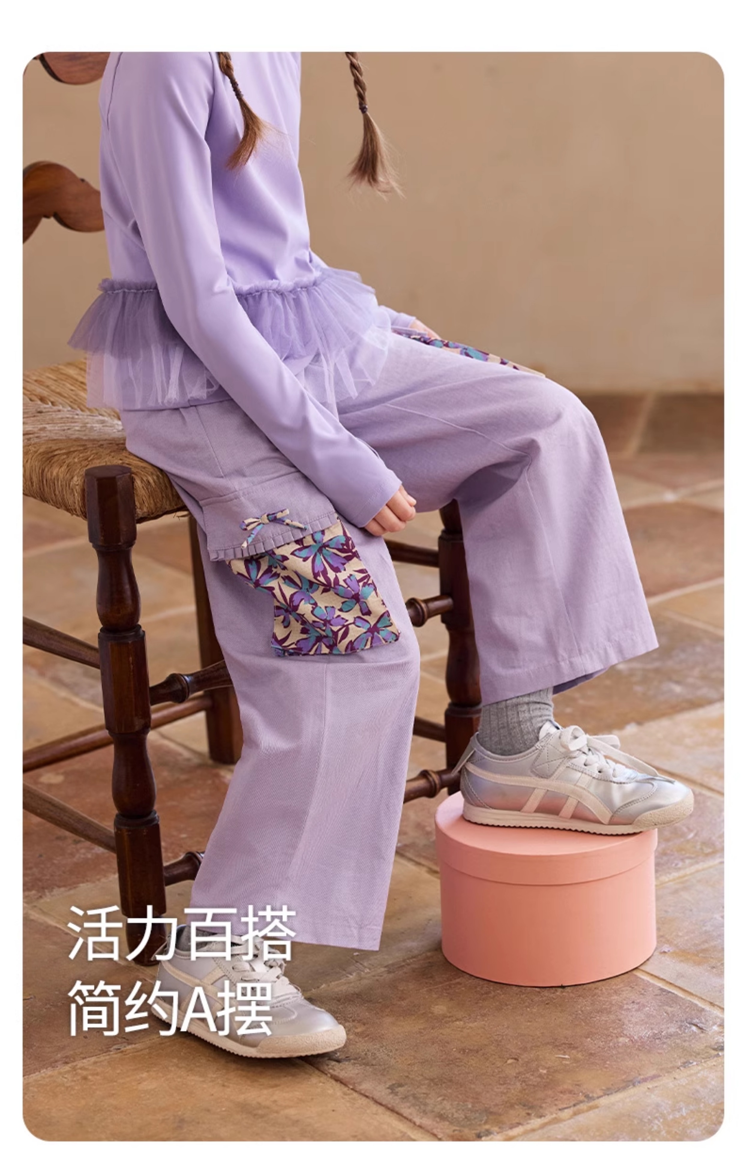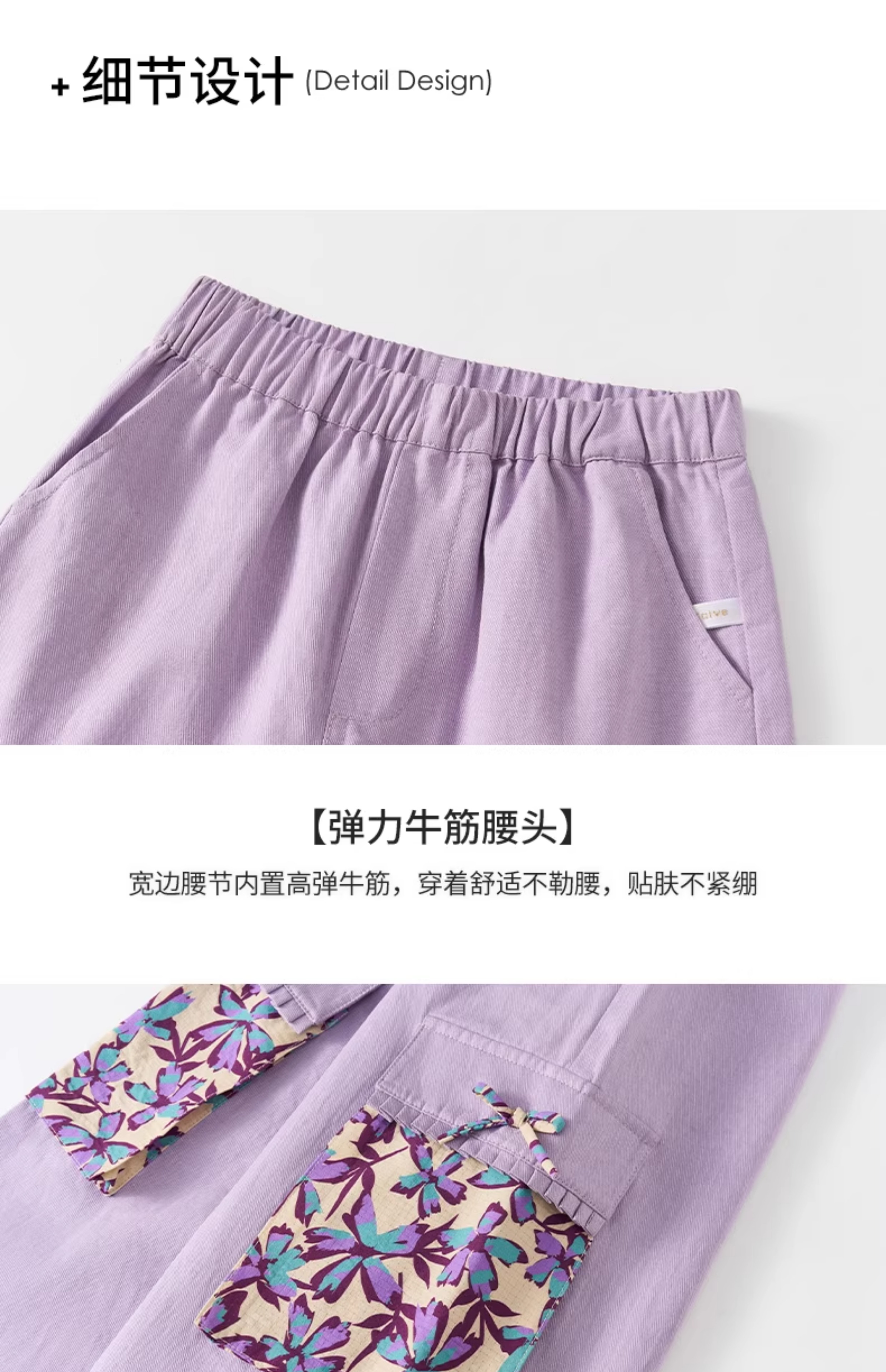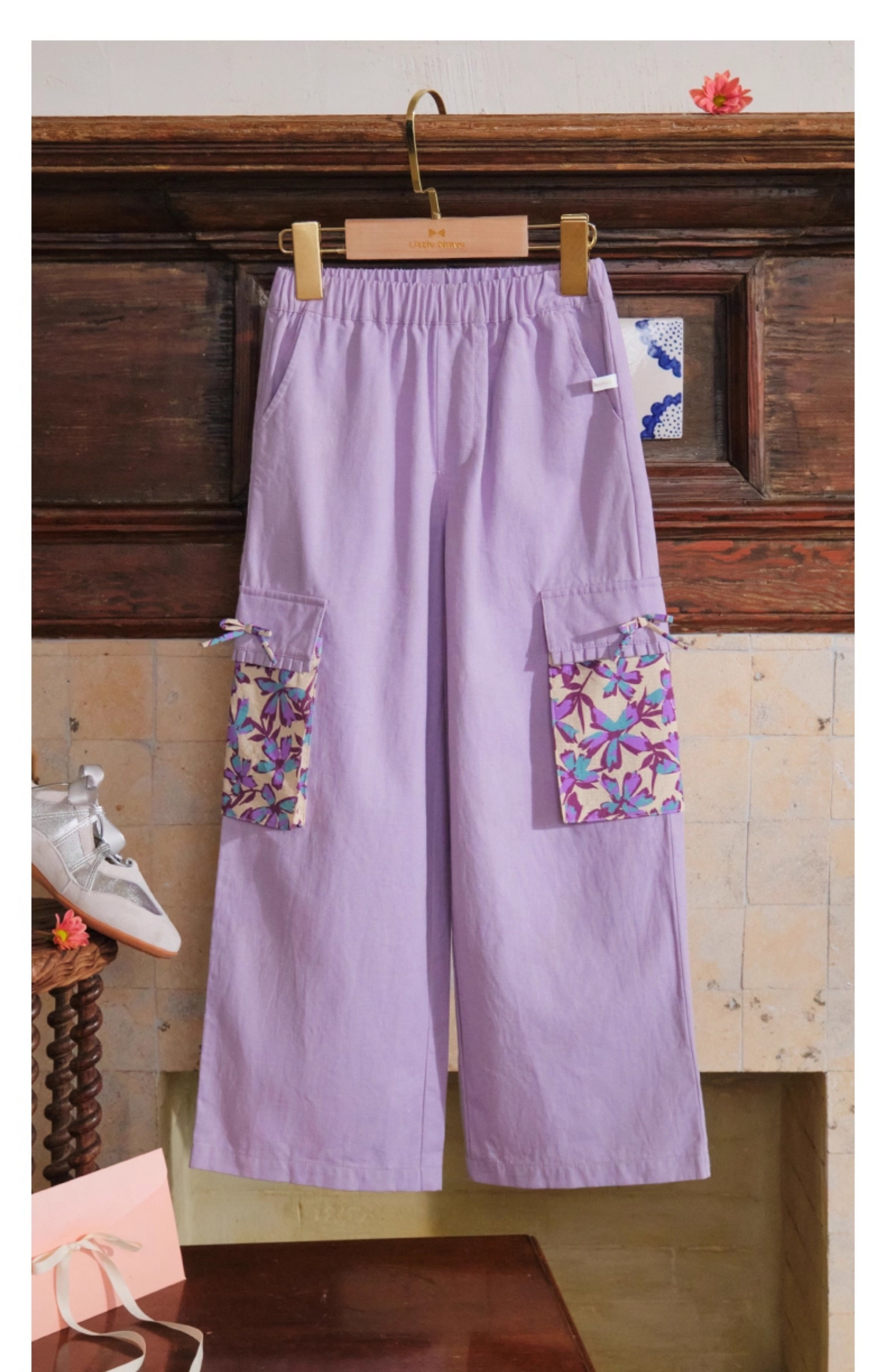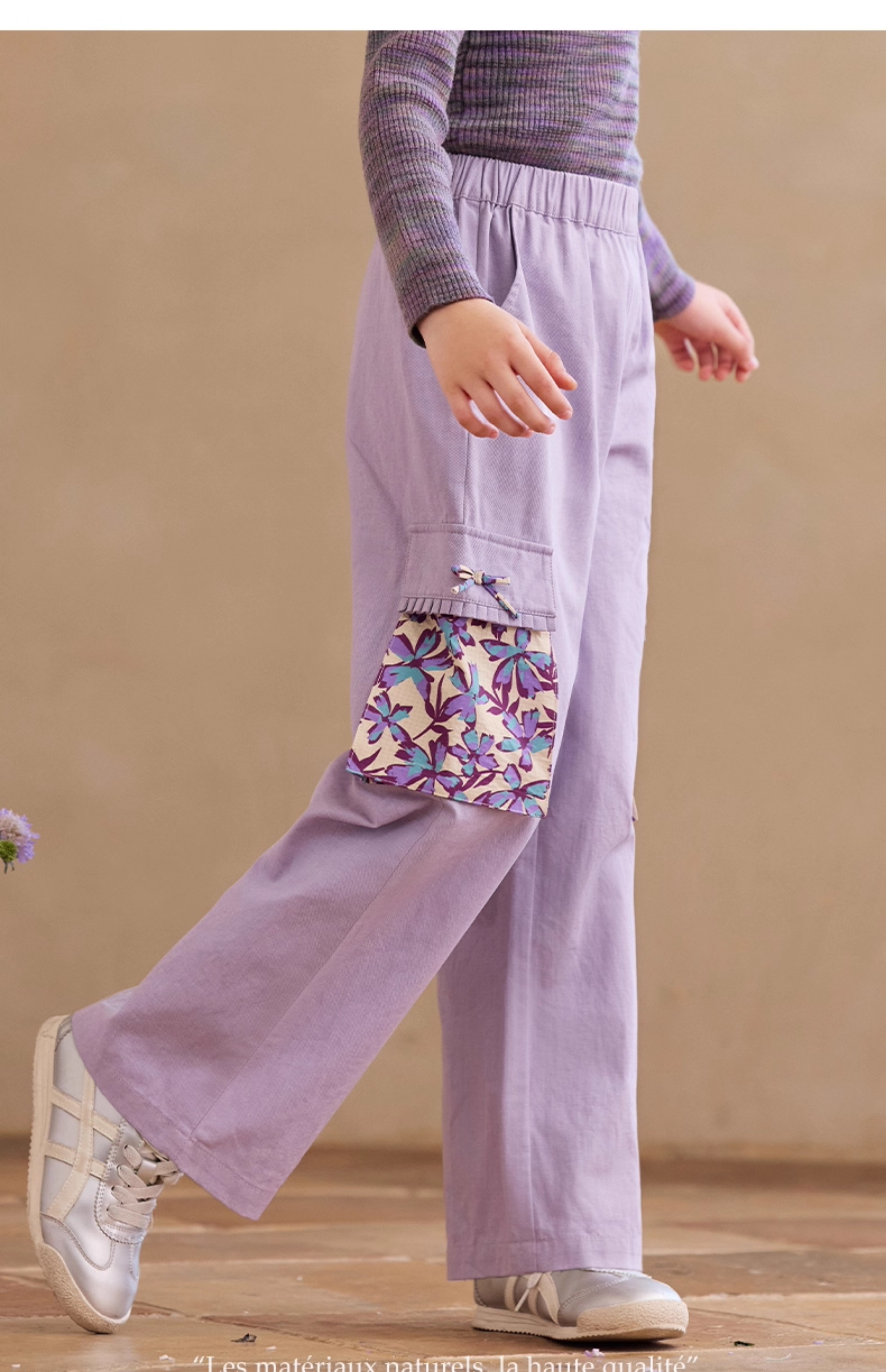 【云优选】Little Naive女童休闲裤秋季新款蝴蝶结花边口袋直筒裤儿童工装裤