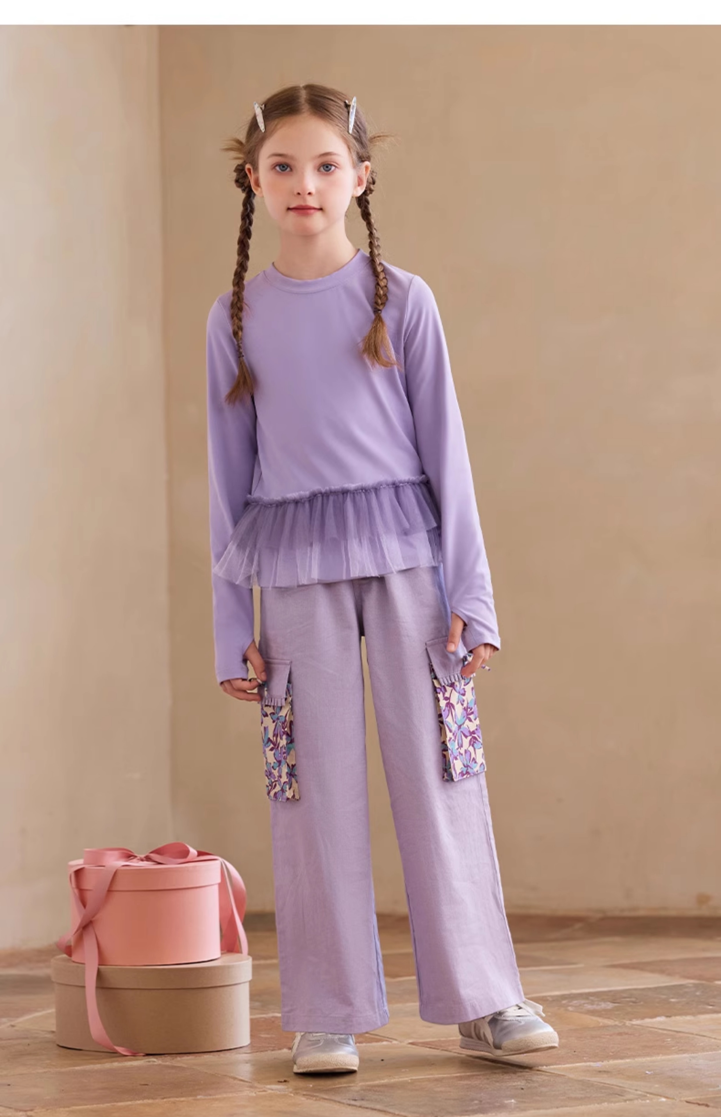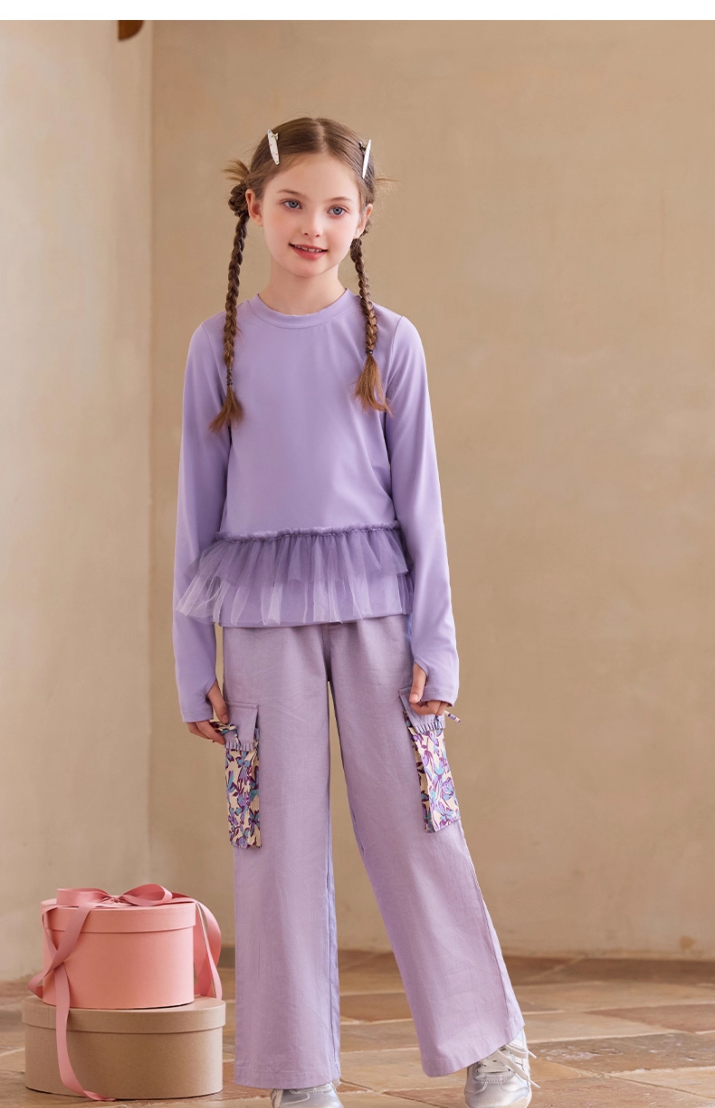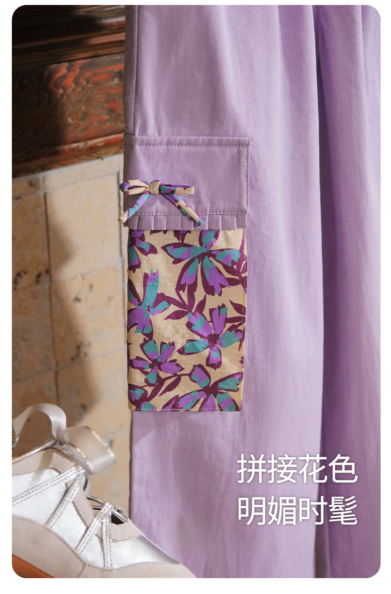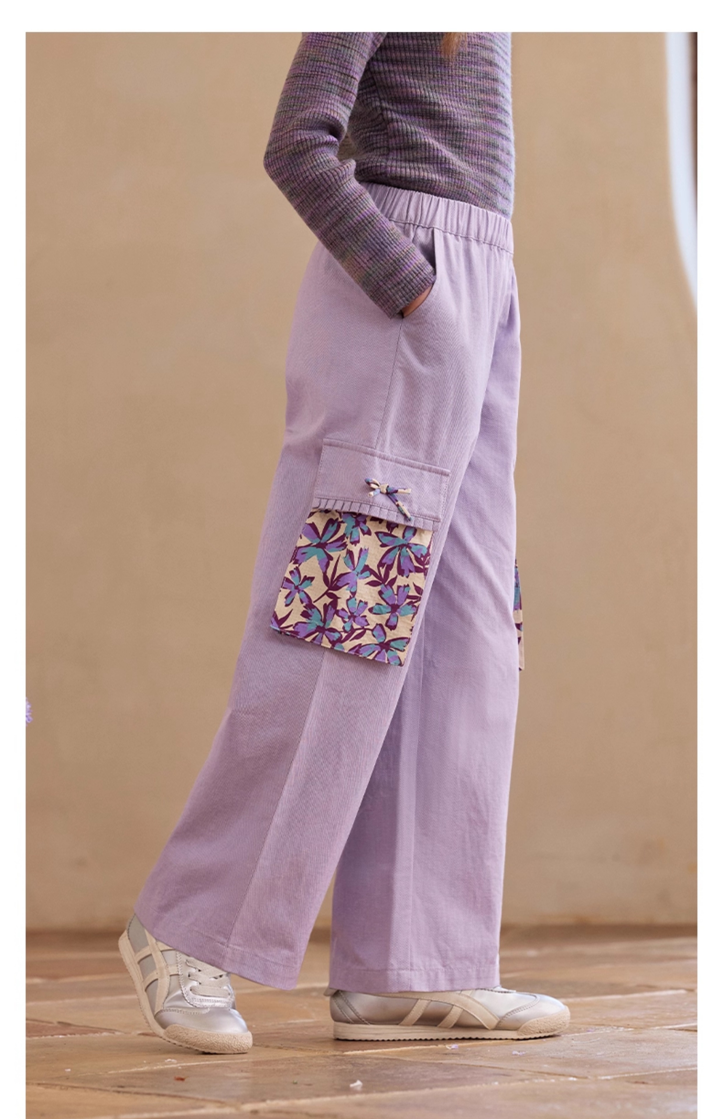 【云优选】Little Naive女童休闲裤秋季新款蝴蝶结花边口袋直筒裤儿童工装裤